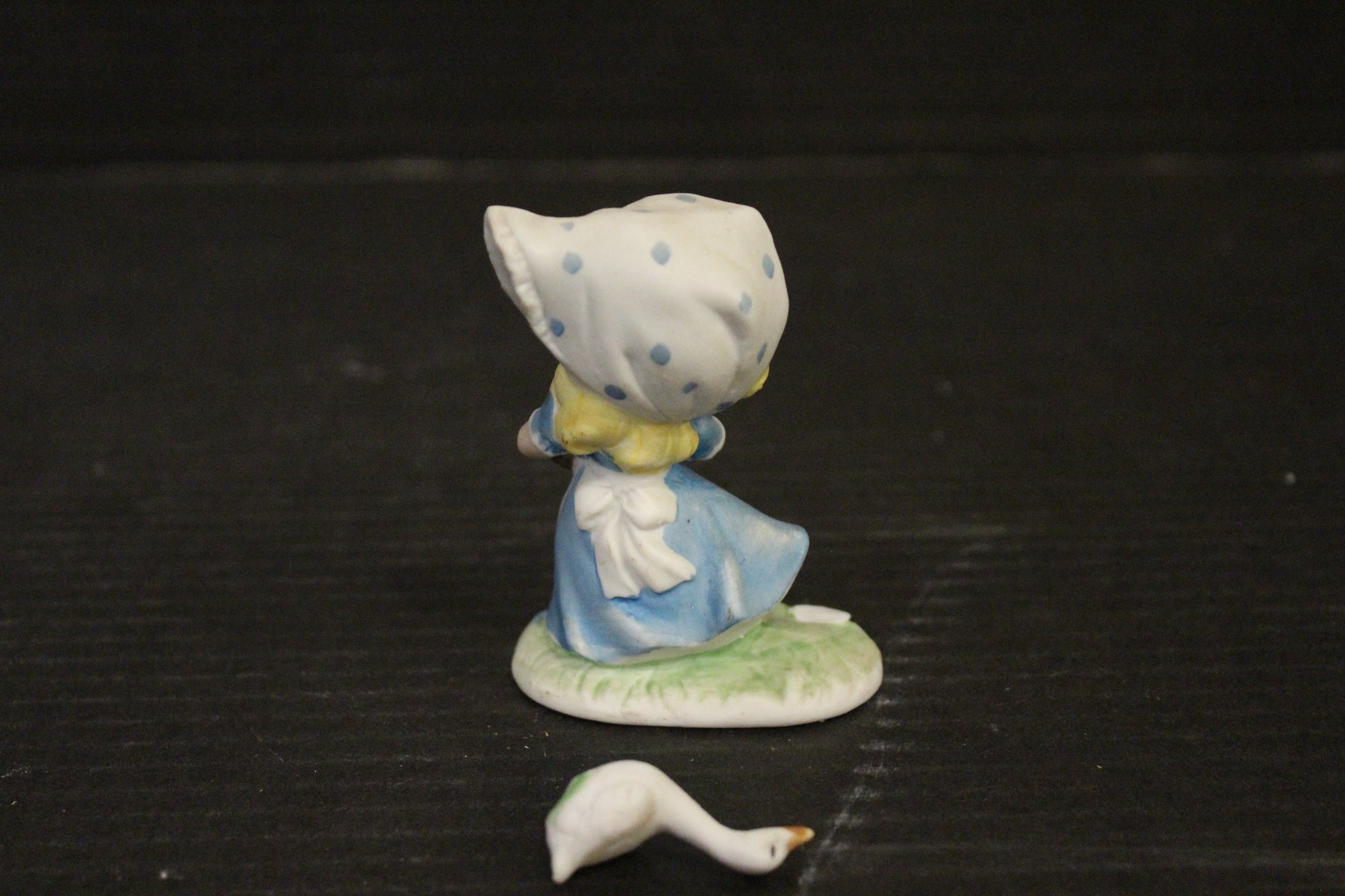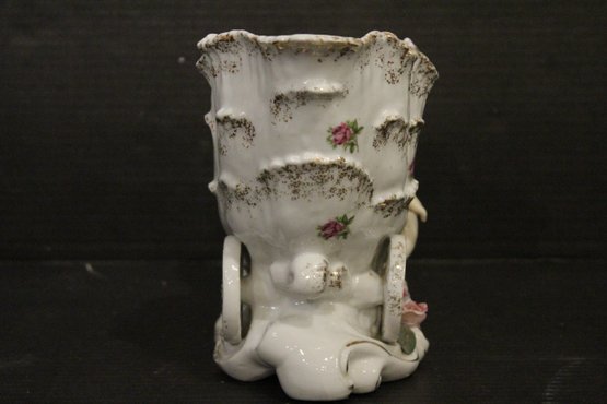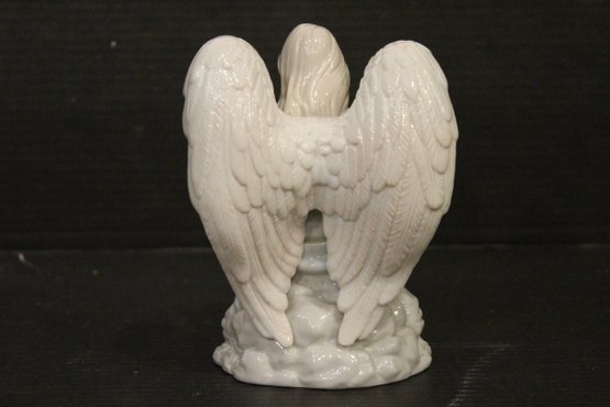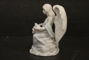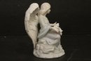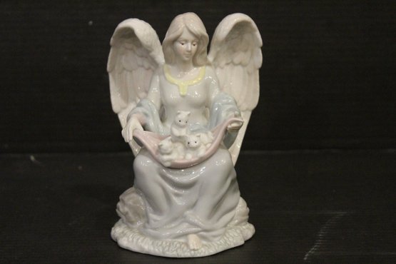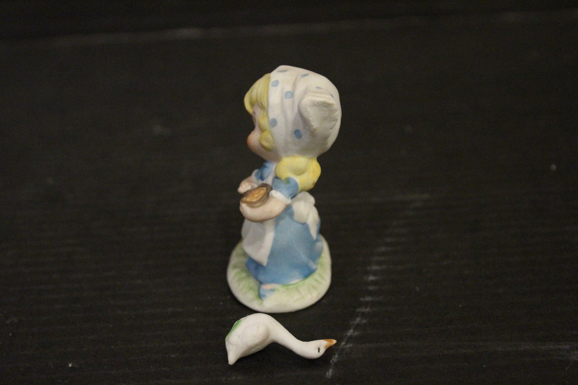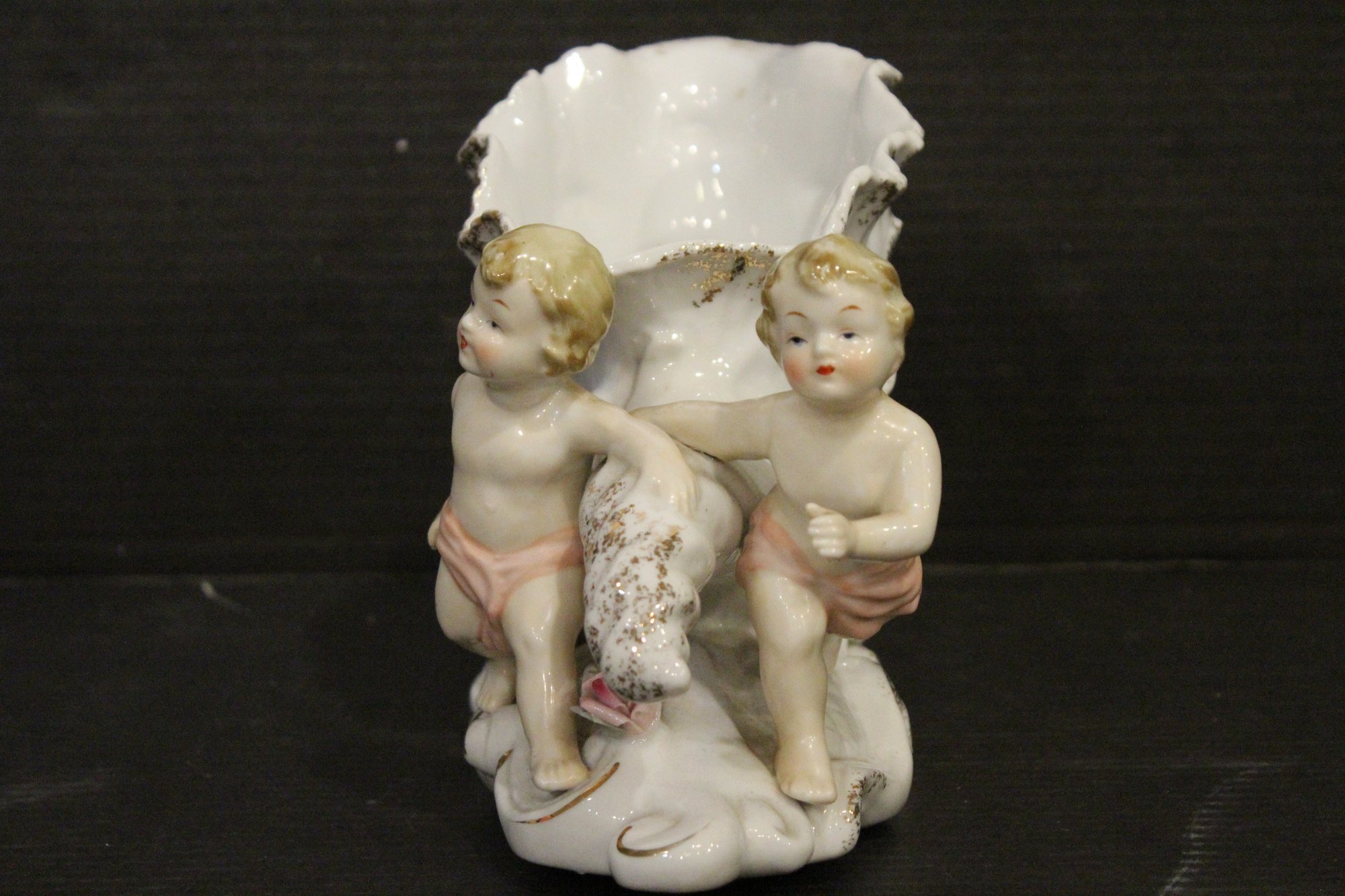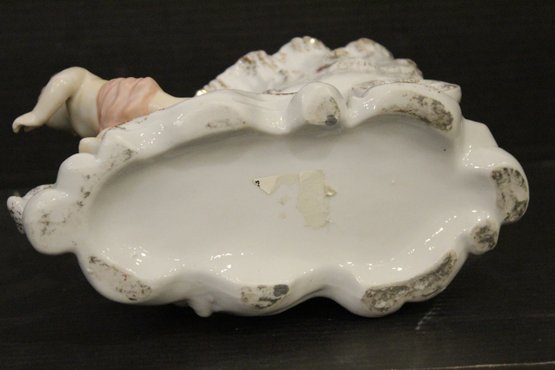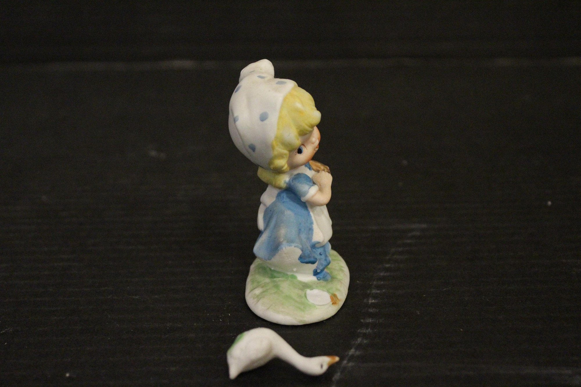 An ornate German white porcelain cornucopia shaped carriage/plater pulled by two putti, 11" x 7". A Cosmos angel figure holding 3 Cats, 7" x 5". A vintage 1996 BC Bronson Bear figurine, 3". Lastly a vintage Homco porcelain figurine of a girl feeding a goose, goose is broken off but intact as pictured, 3.5". These items can be shipped.