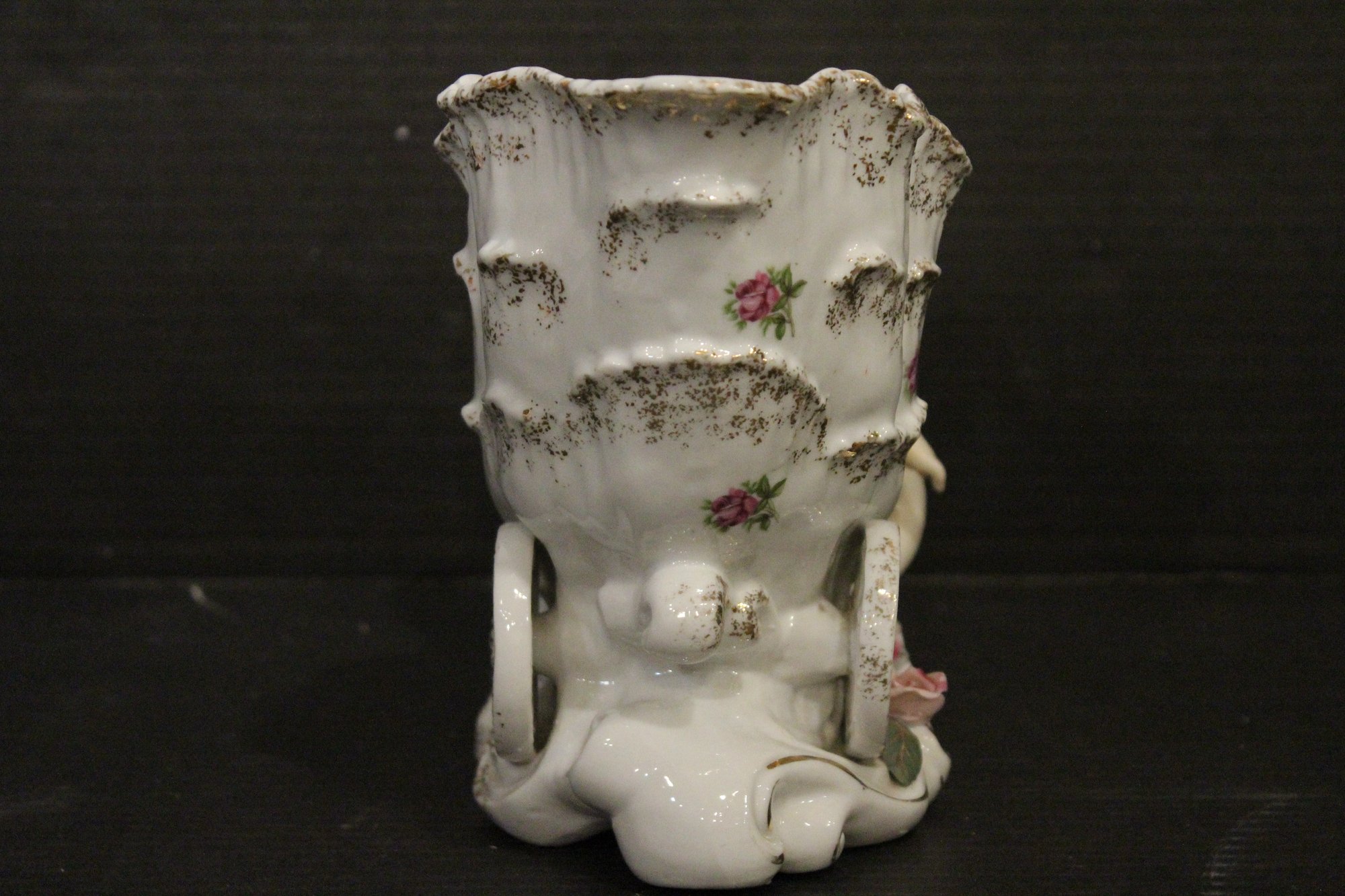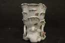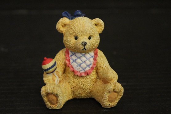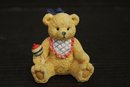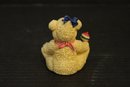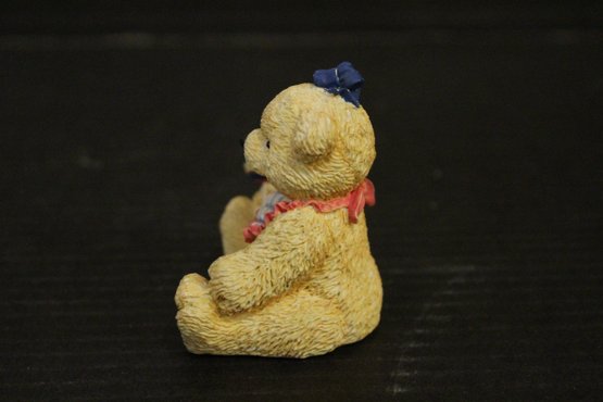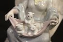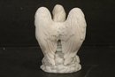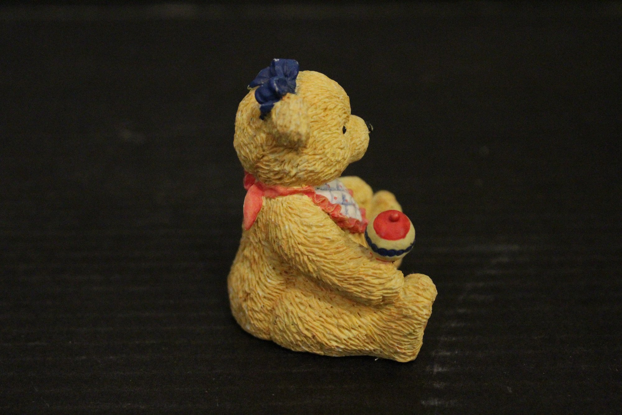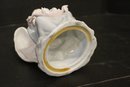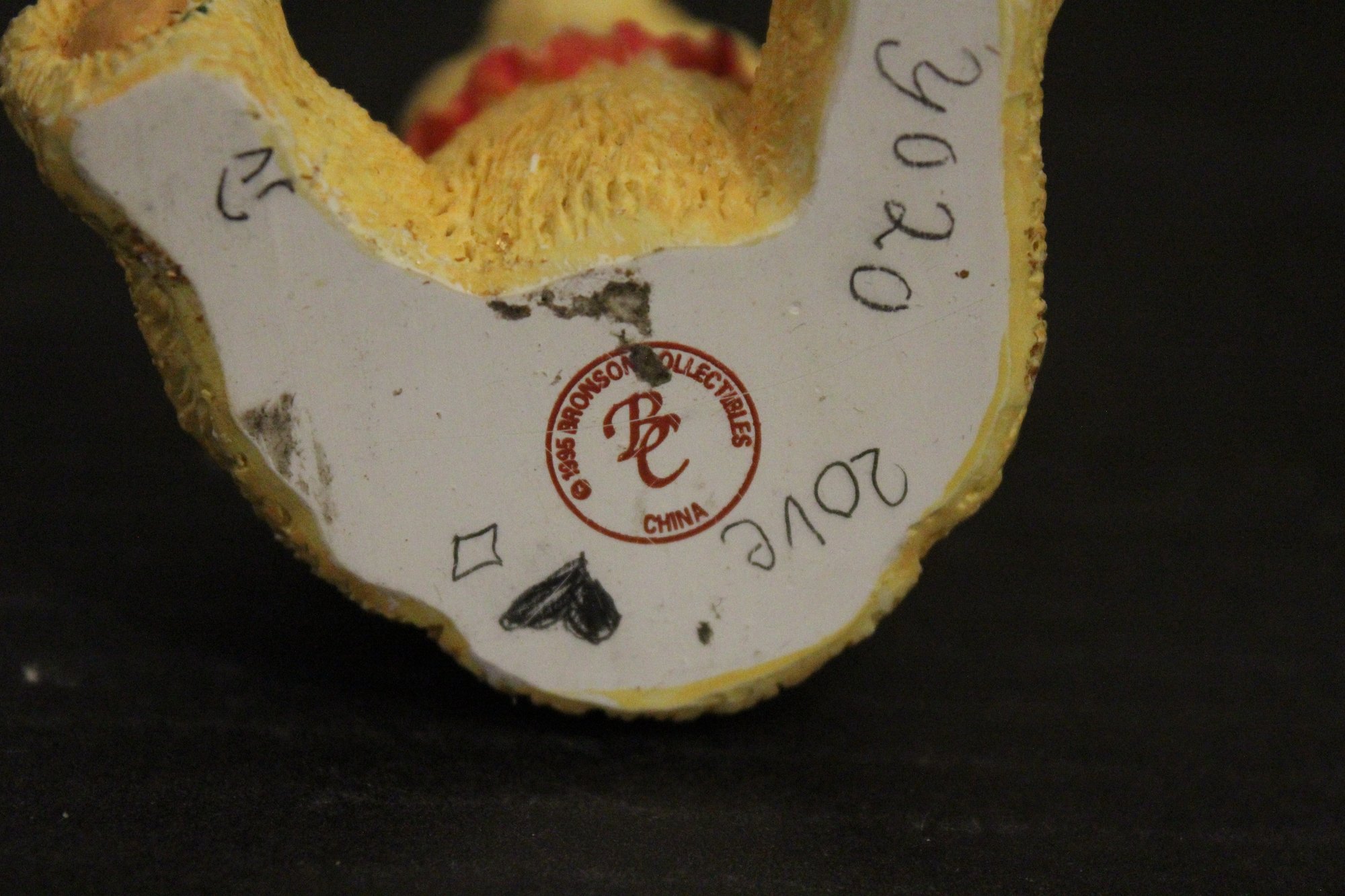 An ornate German white porcelain cornucopia shaped carriage/plater pulled by two putti, 11" x 7". A Cosmos angel figure holding 3 Cats, 7" x 5". A vintage 1996 BC Bronson Bear figurine, 3". Lastly a vintage Homco porcelain figurine of a girl feeding a goose, goose is broken off but intact as pictured, 3.5". These items can be shipped.