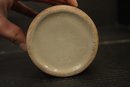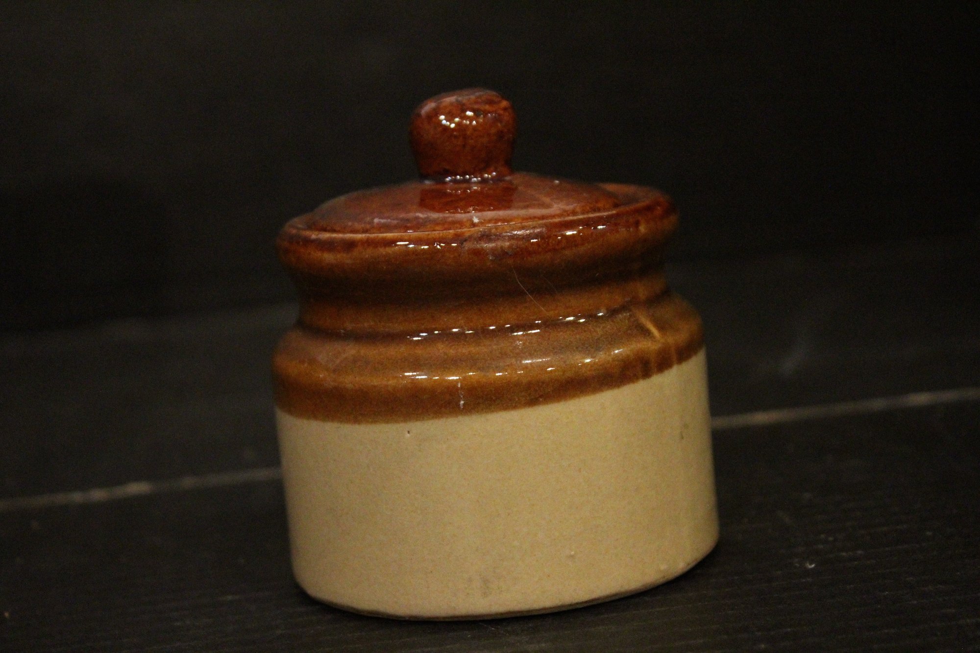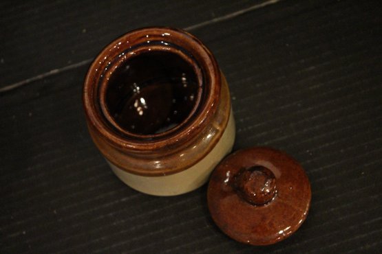 A mini vintage brown and tan stoneware crock with a lid, 4" tall