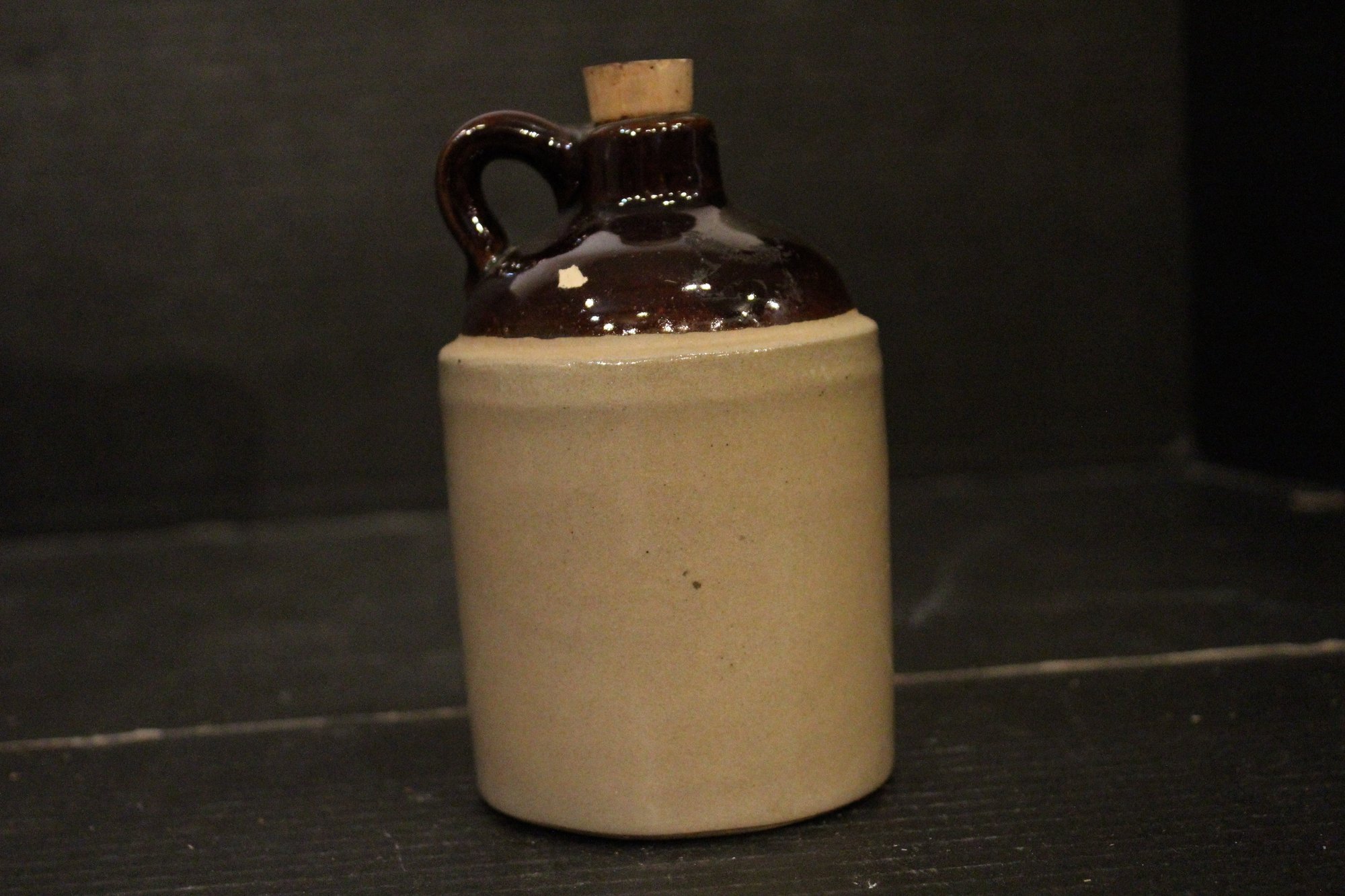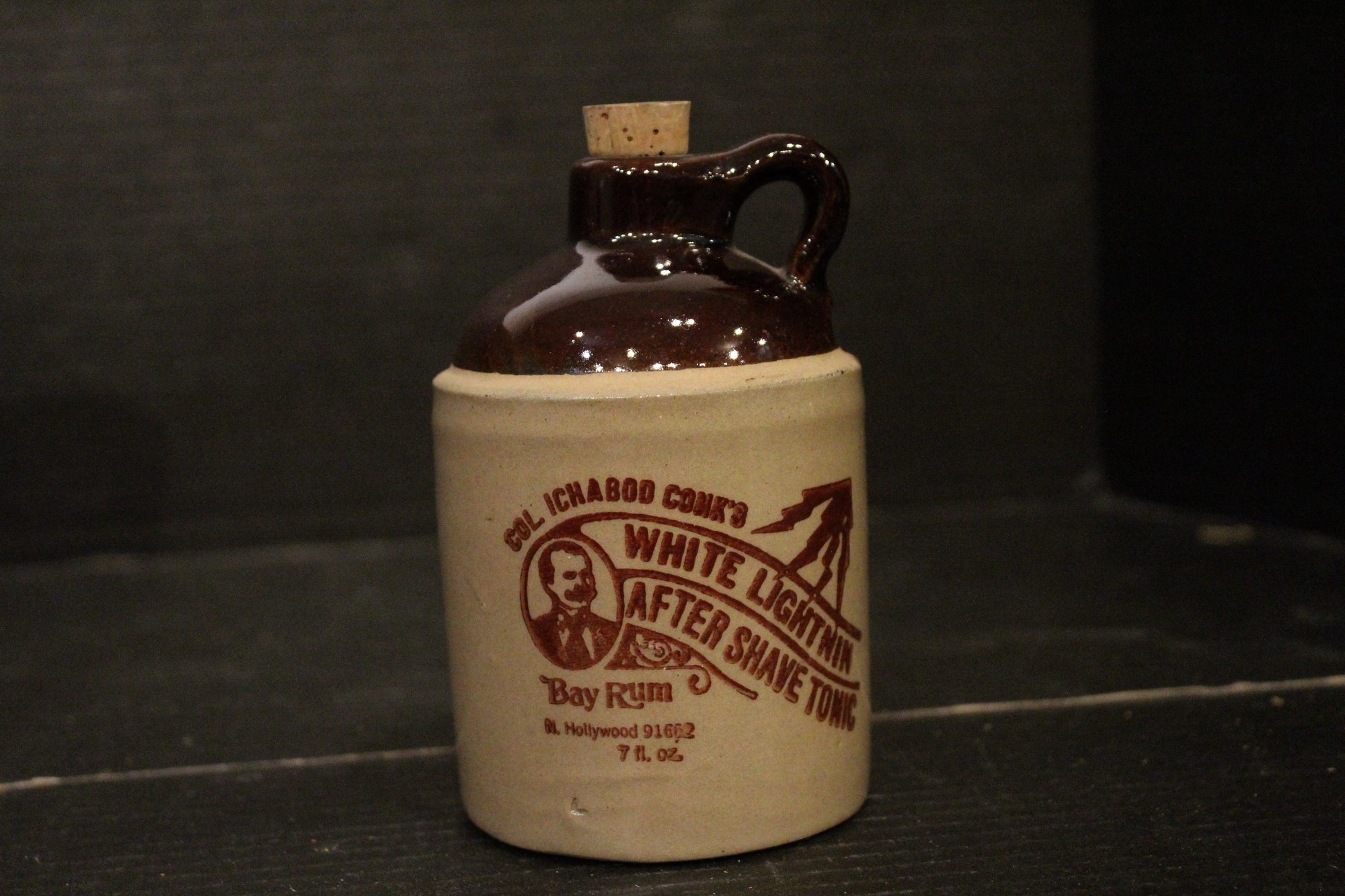 A mini Col Ichabod Conk's Stoneware Jug Crock, White Lightening Aftershave Tonic Bay Rum, Farm House 5" tall