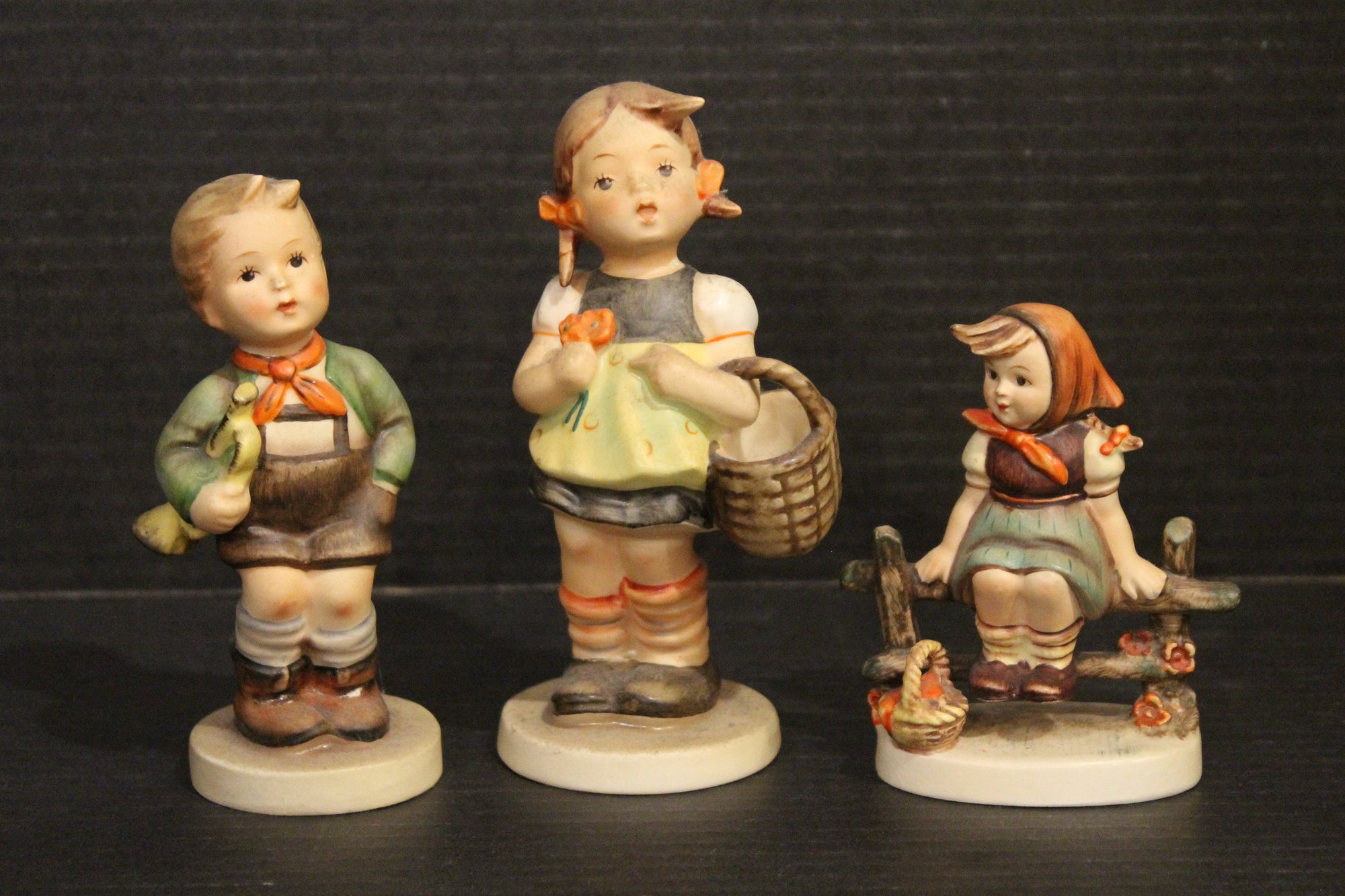 A vintage Goebel Hummel figurine titled "Trumpet Boy", number 97, 5.25" tall. A vintage Goebel Hummel figurine titled "Sister", number 98, 6" tall. And a vintage Goebel Hummel "Just Resting" figurine, number 112, 4" tall. These items can be shipped