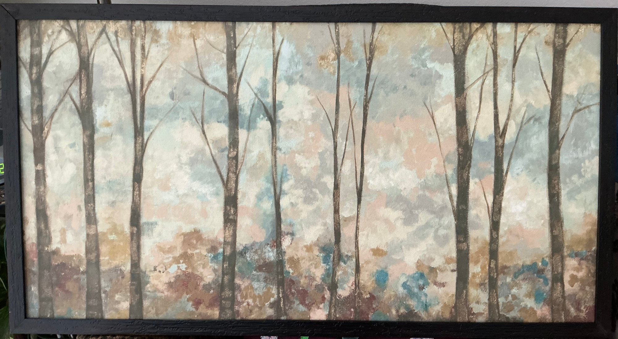 Beautiful large framed picture of trees in lovely muted colors (browns, blues, pinks and whites). Although it is a fall/ winter scene it is a warm and peaceful picture in a black frame. Shipping not available because of size.