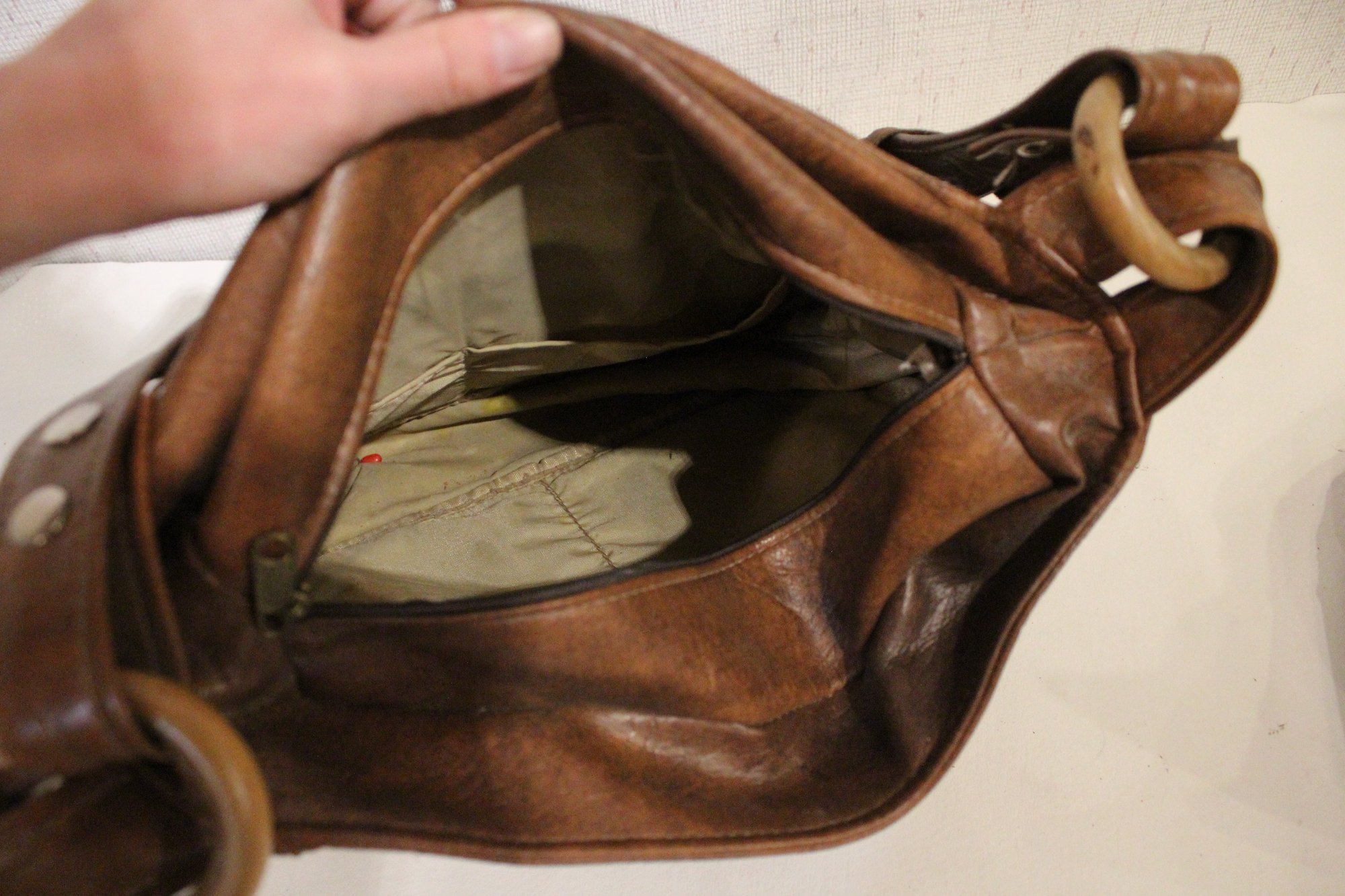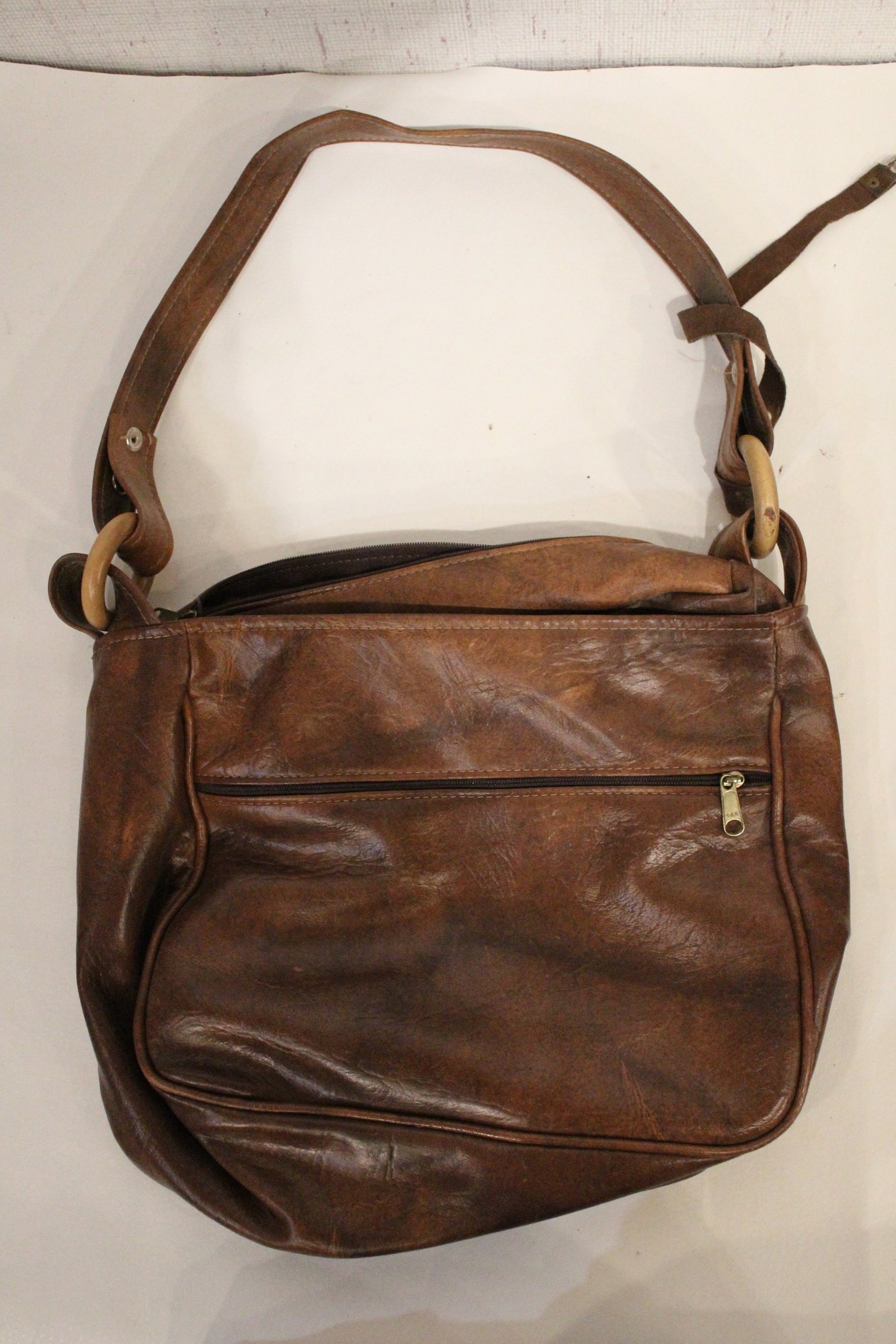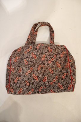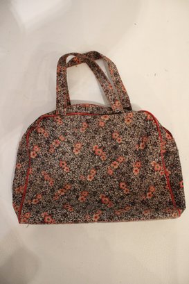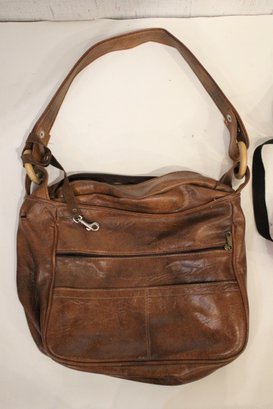 a brown faux leather hobo shoulder bag 12" x 10", vintage-style floral pattern travel bag 11" x 9", a water bottle bag 8", and a orange travel bag. These items can be shipped.