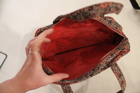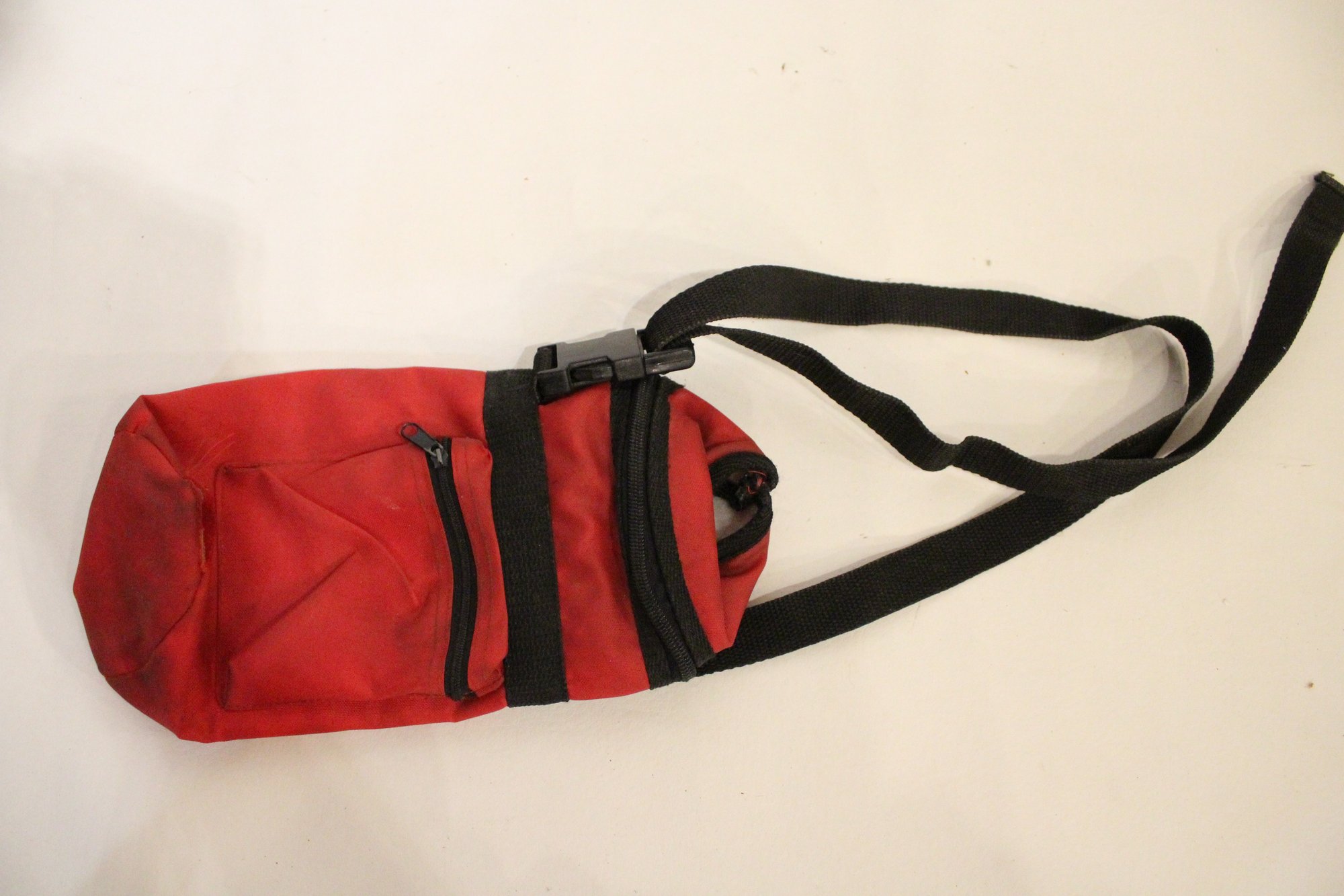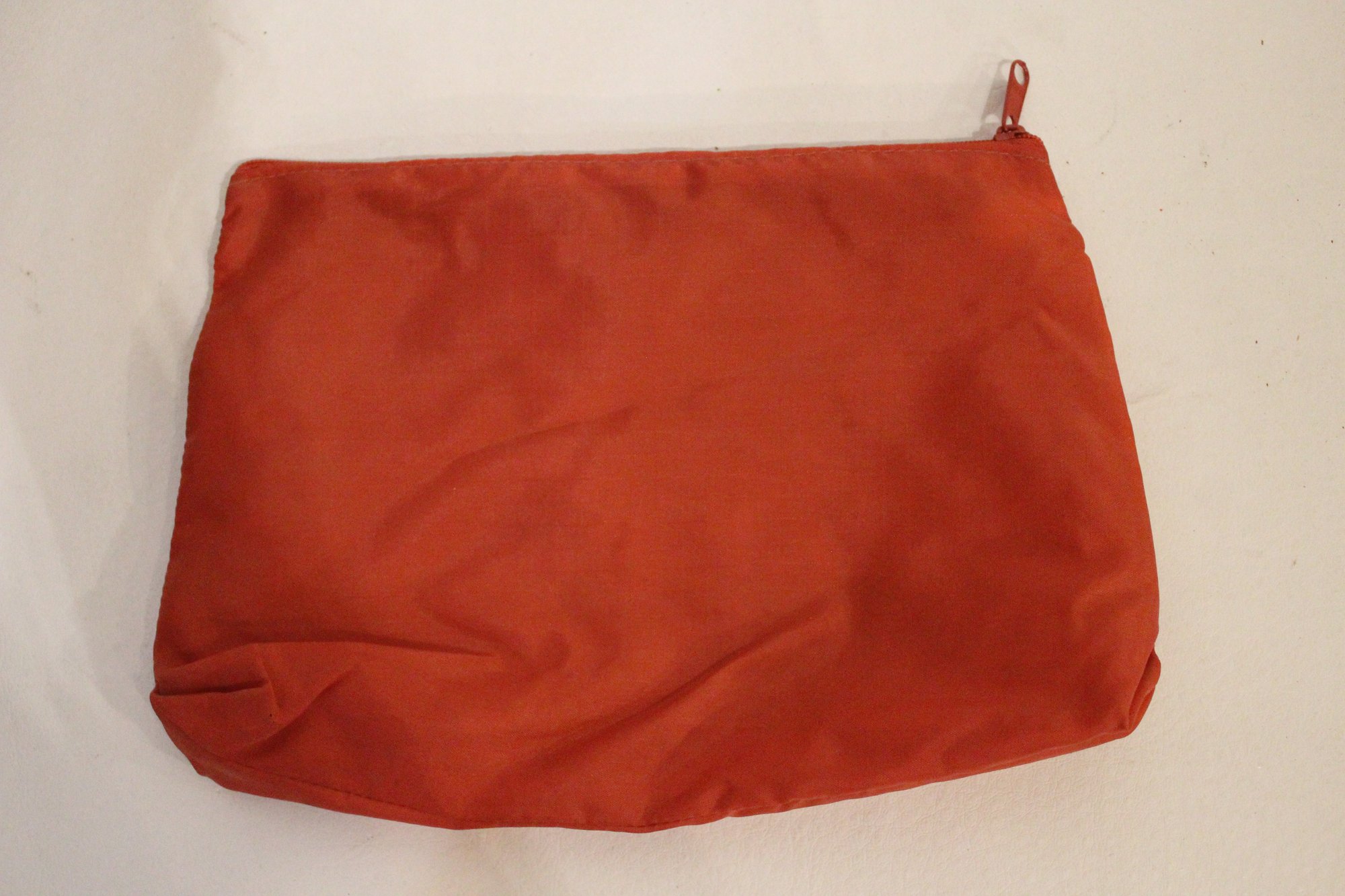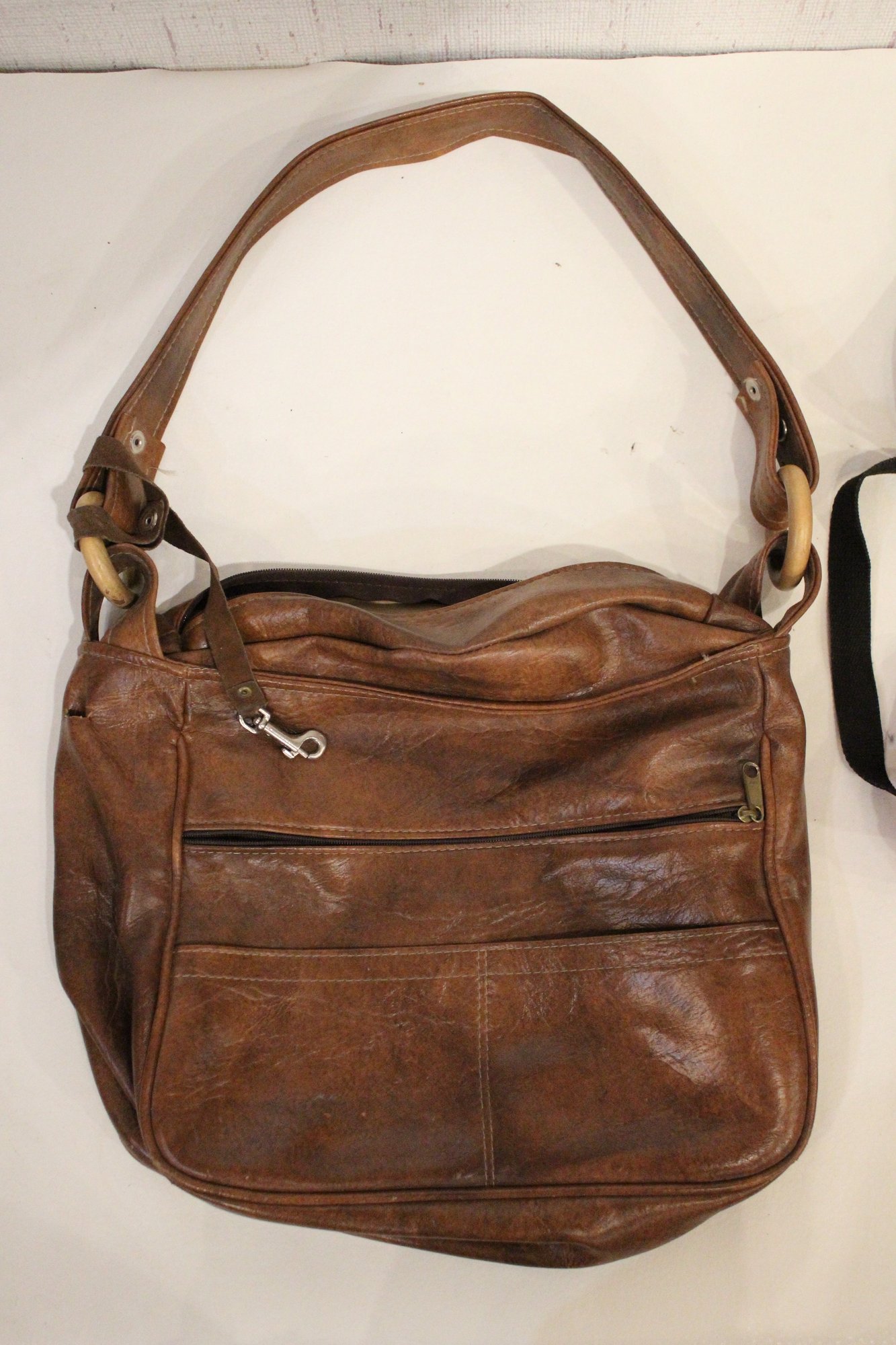 a brown faux leather hobo shoulder bag 12" x 10", vintage-style floral pattern travel bag 11" x 9", a water bottle bag 8", and a orange travel bag. These items can be shipped.