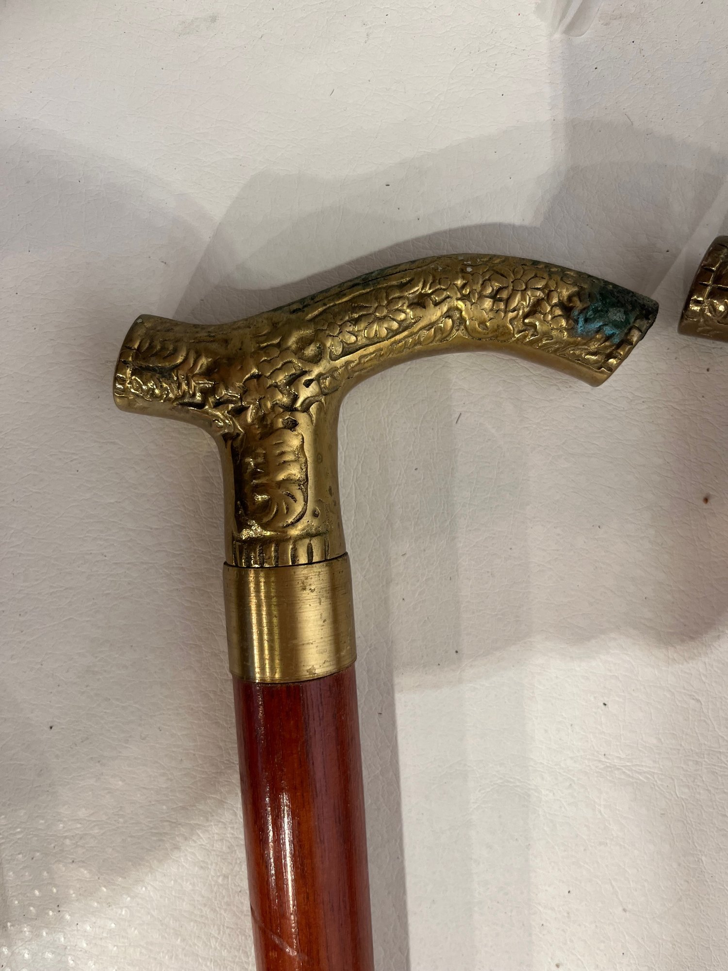 4 walking canes including 2 Victorian-style walking stick with a brass handles, 36", 34", 34", 34", 36", and a handmade hearth broom, 24". These items can be shipped.