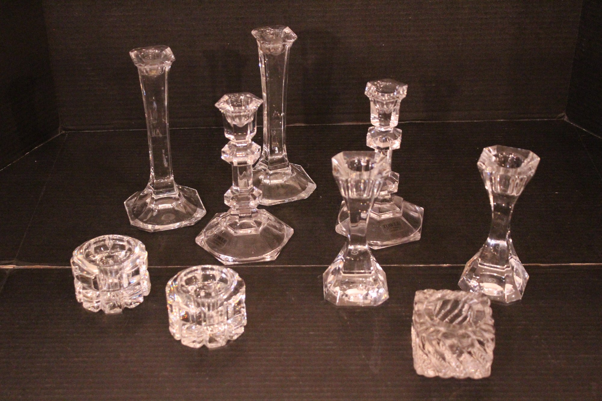 4 beautiful pairs of crystal candle sticks and an ink well, Villeroy & Boch crystal candle holders, vintage Towle Full Lead crystal candle holders, vintage Mikasa "Hyde Park" crystal glass candle holder, the short Mikasa crystal candlestick taper candle holders Germany geometric block and an antique Art Nouveau crystal and inkwell scrolling Flowers. These items can be shipped.