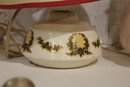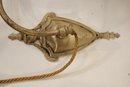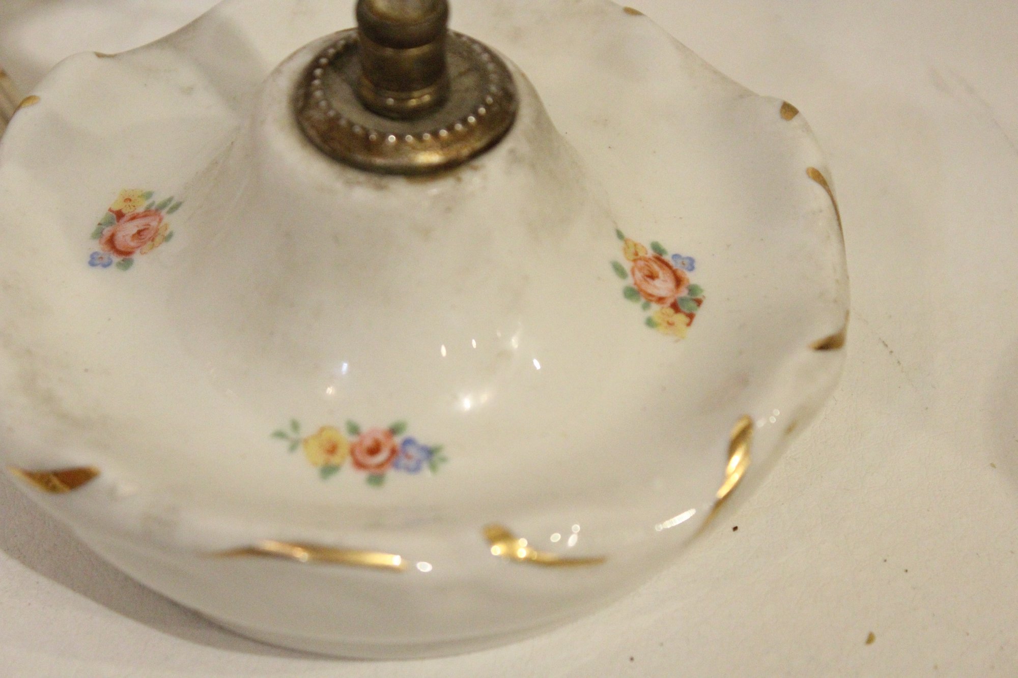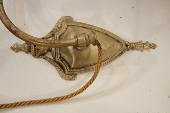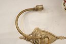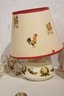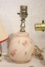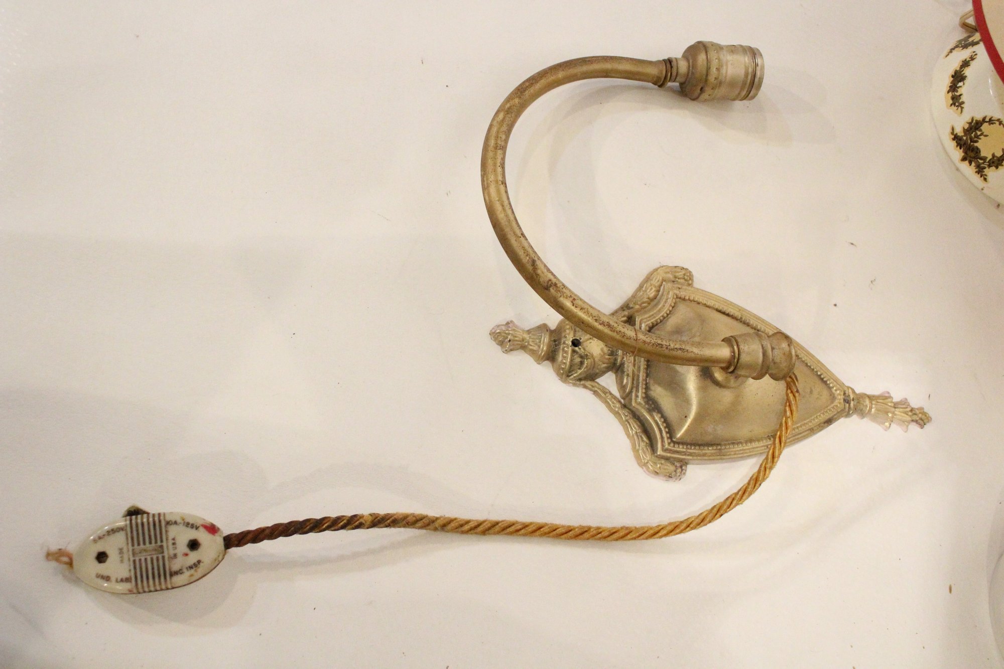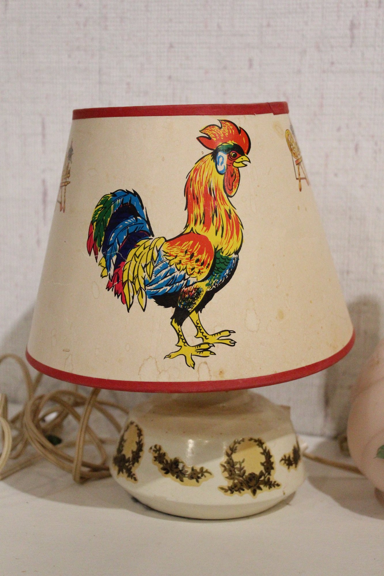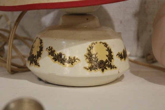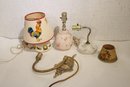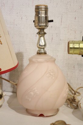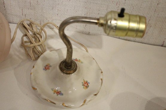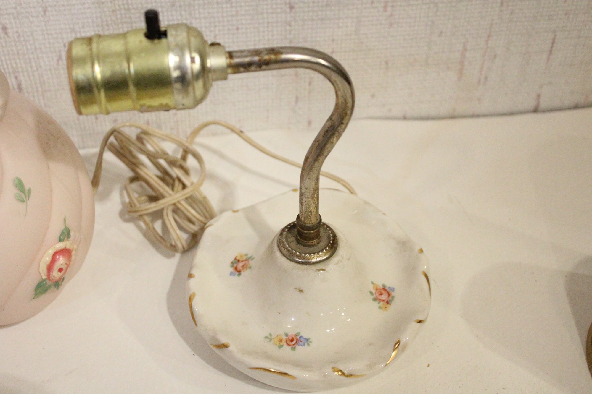 A vintage metal lamp with a rooster paper shade 10", a vintage sweet boudoir pink ribbed glass rose painted vanity lamp 11", a vintage ceramic lamp base with a gooseneck attachment and hand-painted floral details 8" x 8", a vintage hand-painted parchment lamp shade 4" x 5", and lastly a vintage Colonial Premier brass hanging sconce light lamp (the cord is cut as pictured) 11" x 10". These items can be shipped.
