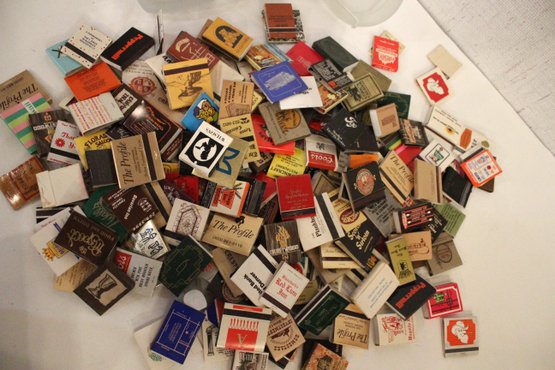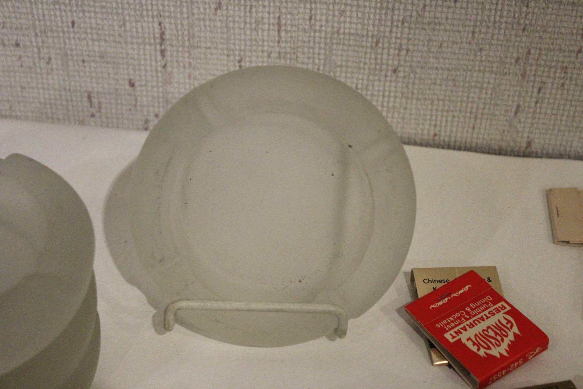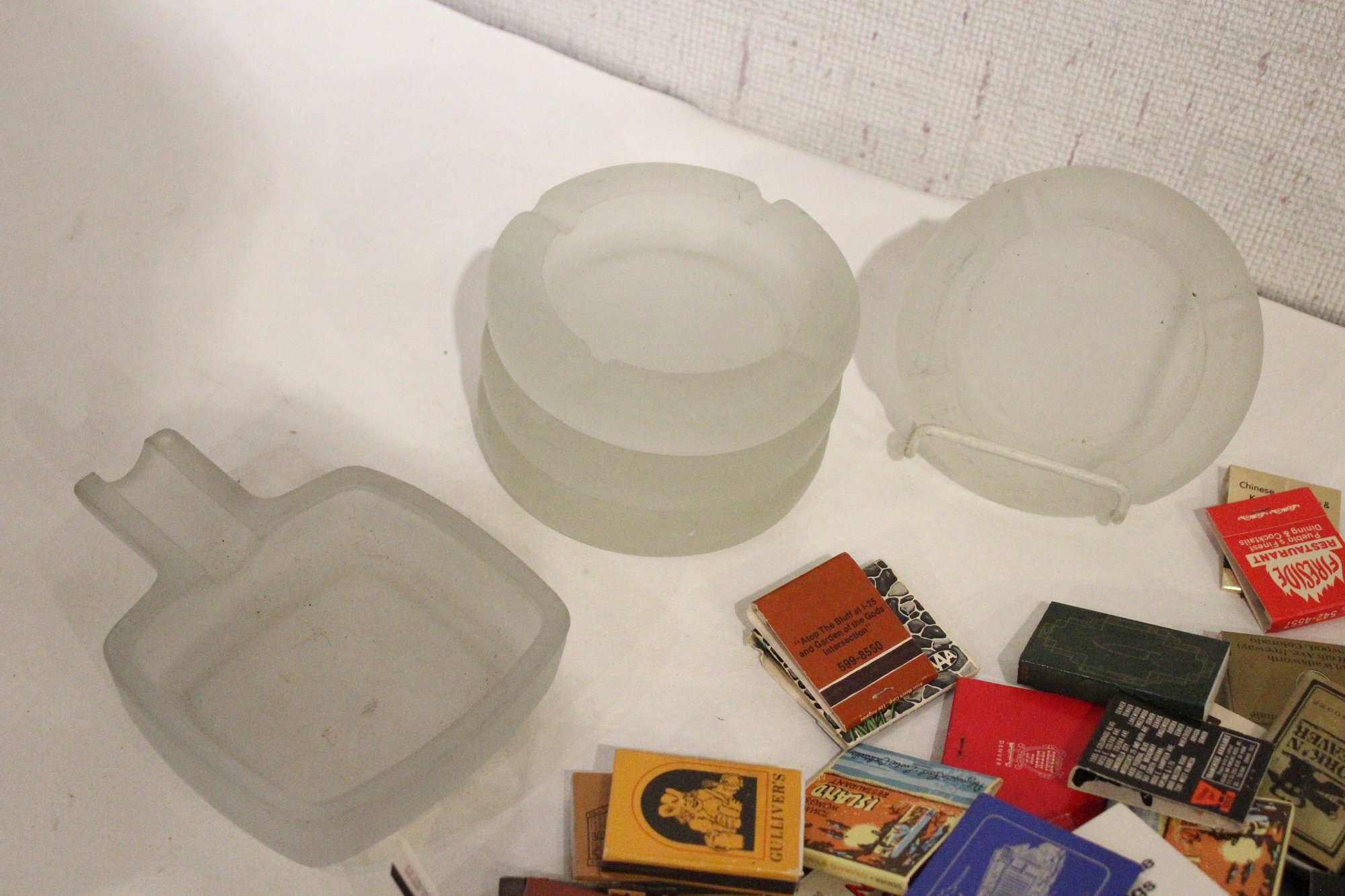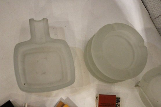 5 frosted glass ashtrays 5" and a large pile of vintage matches. These items can be shipped.