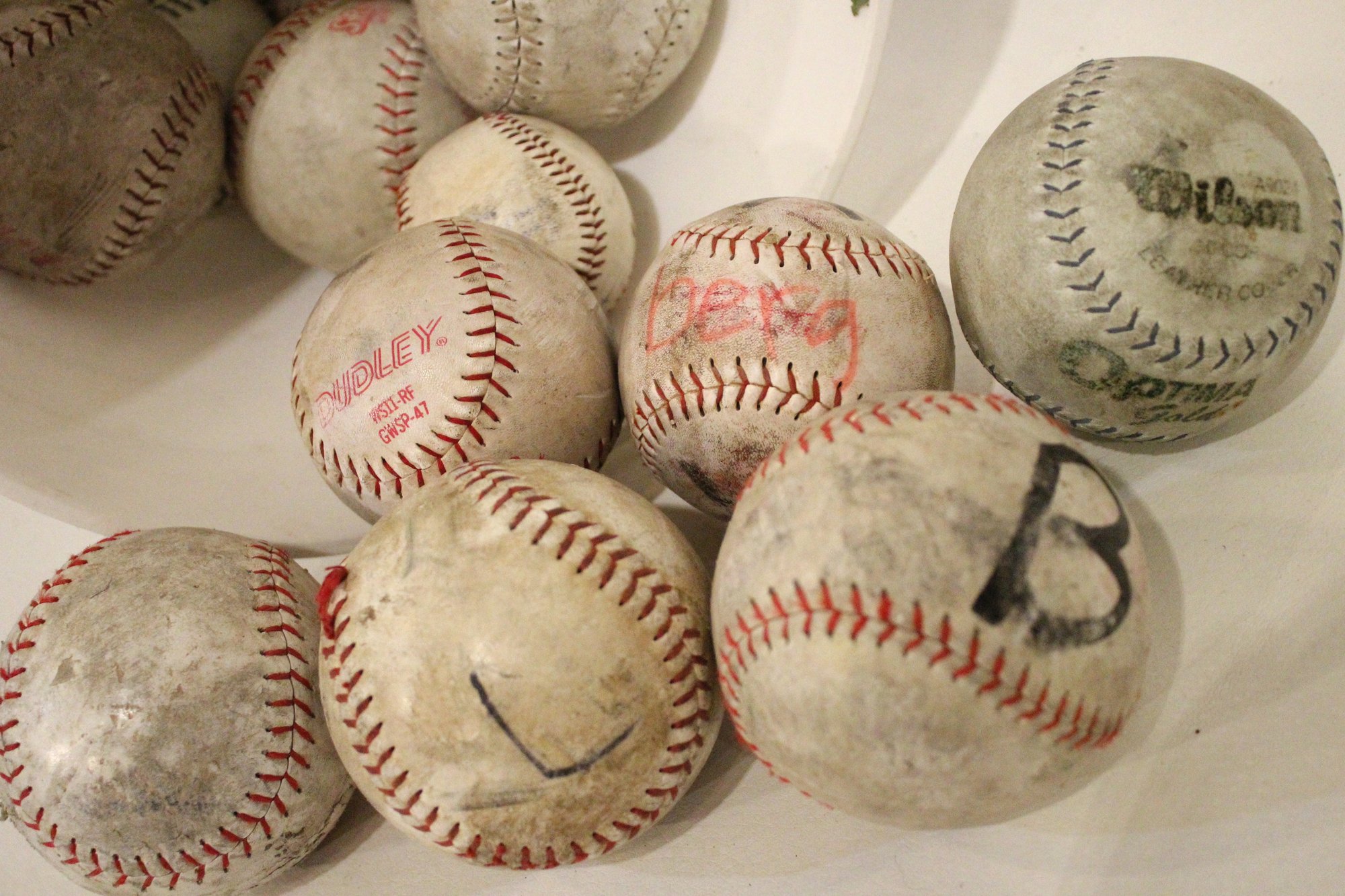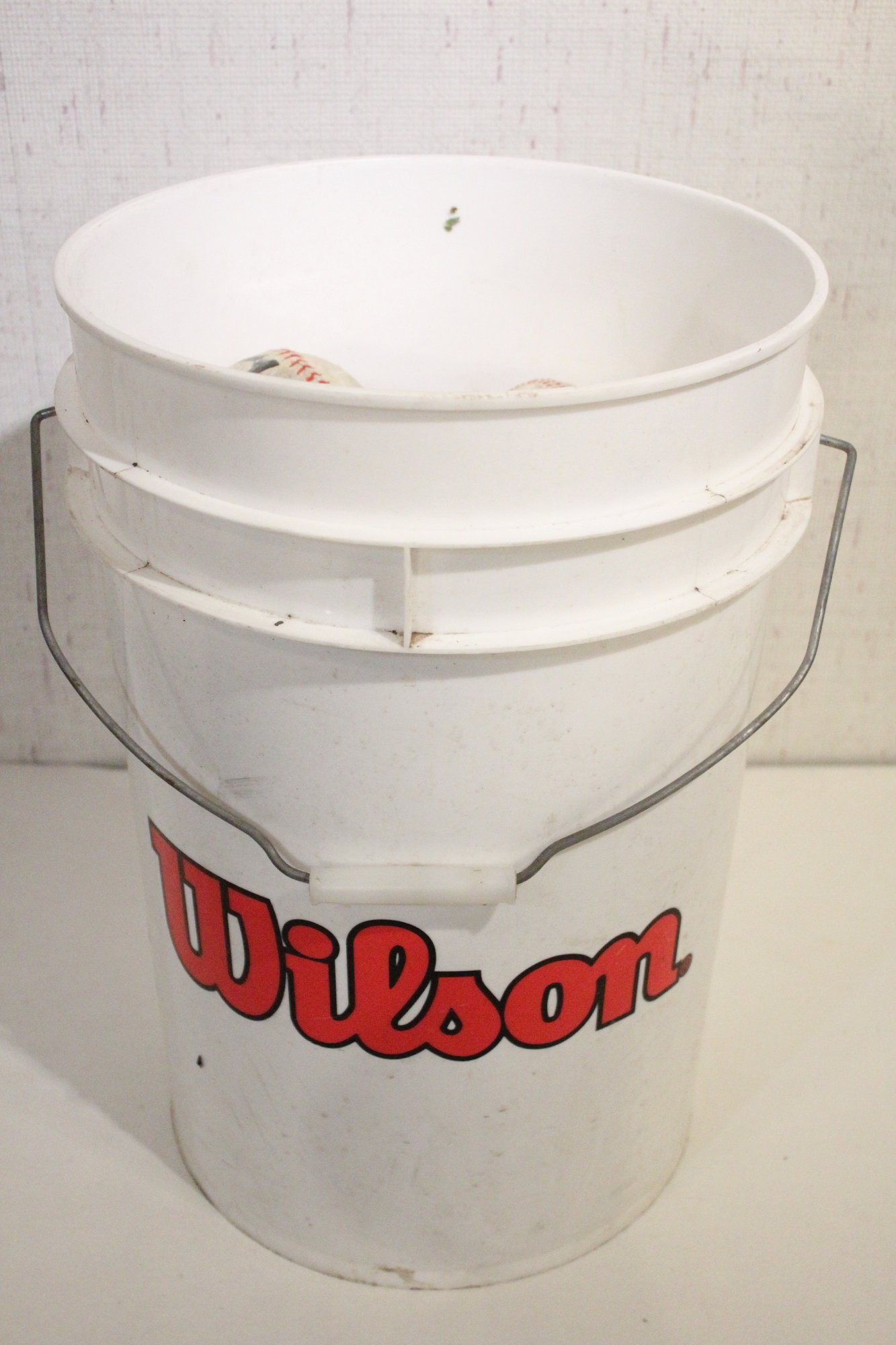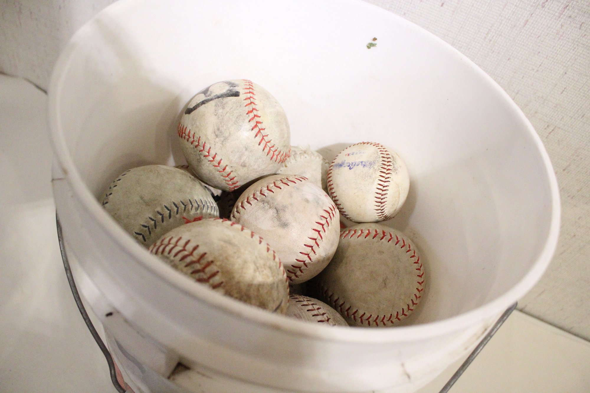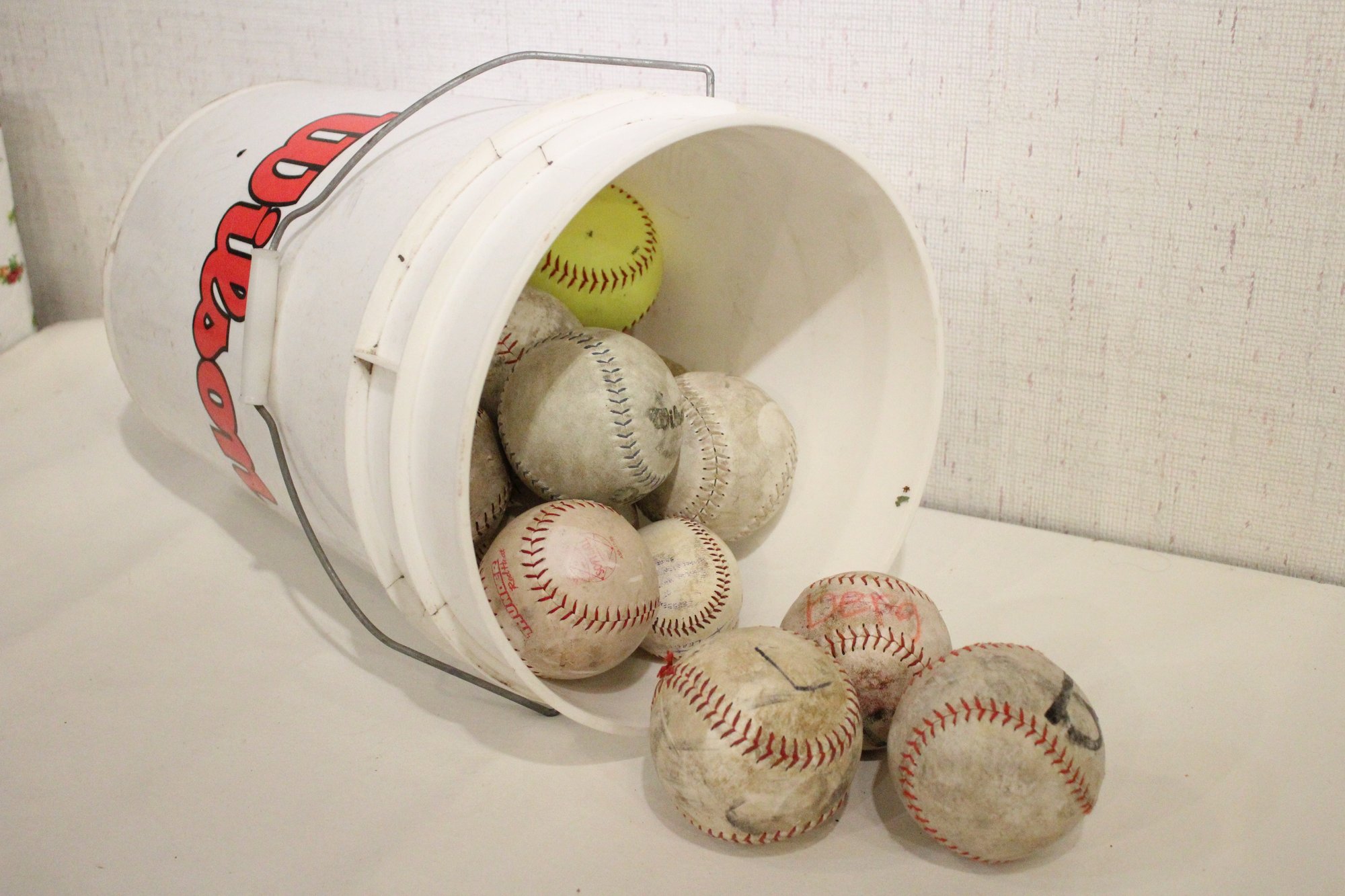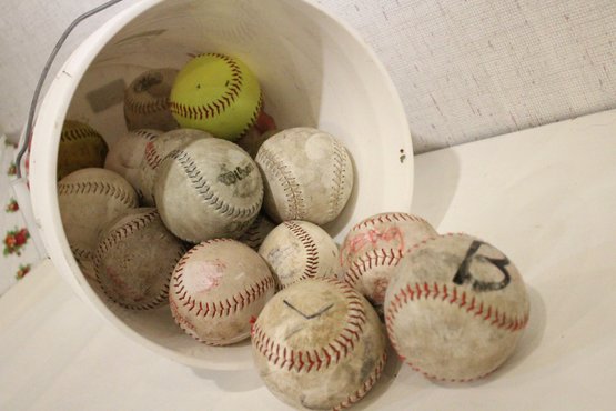 A 5 gallon pale with lid, full of used baseballs and soft balls. These items can be shipped.