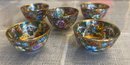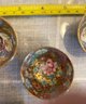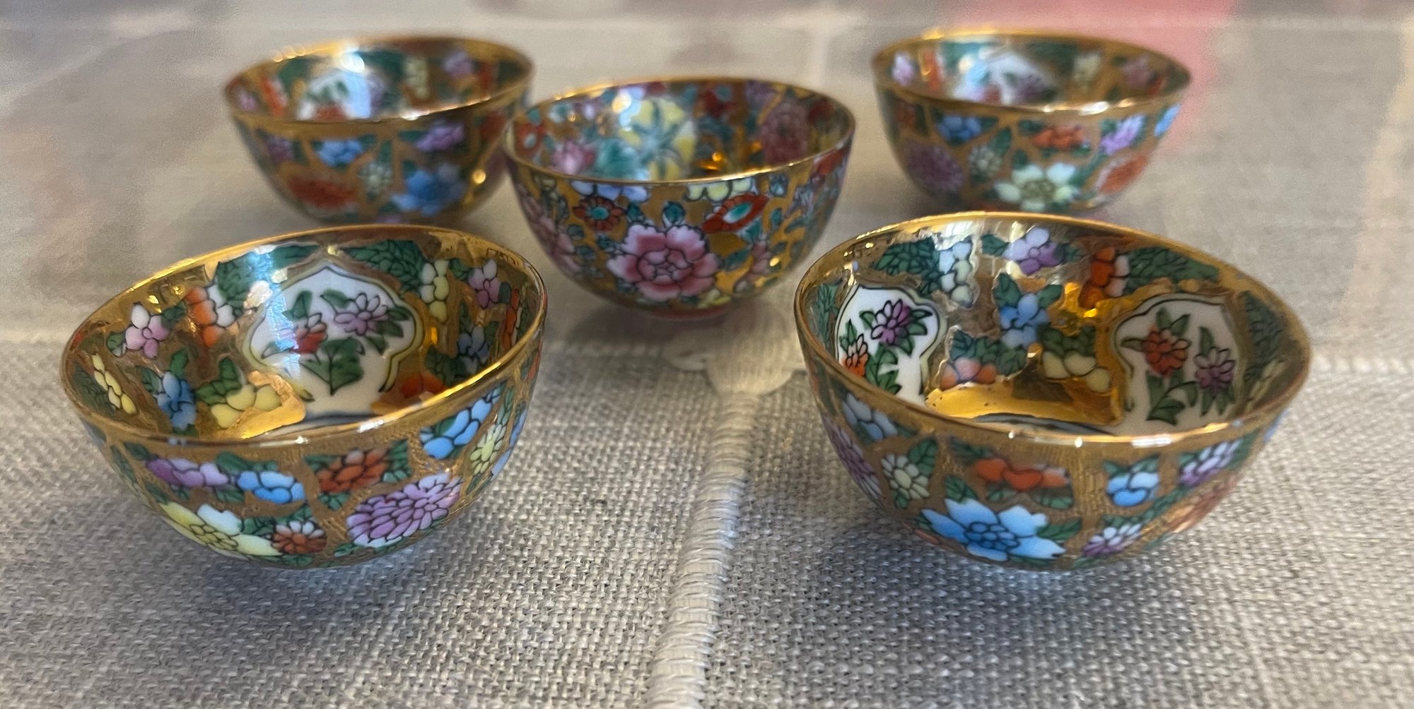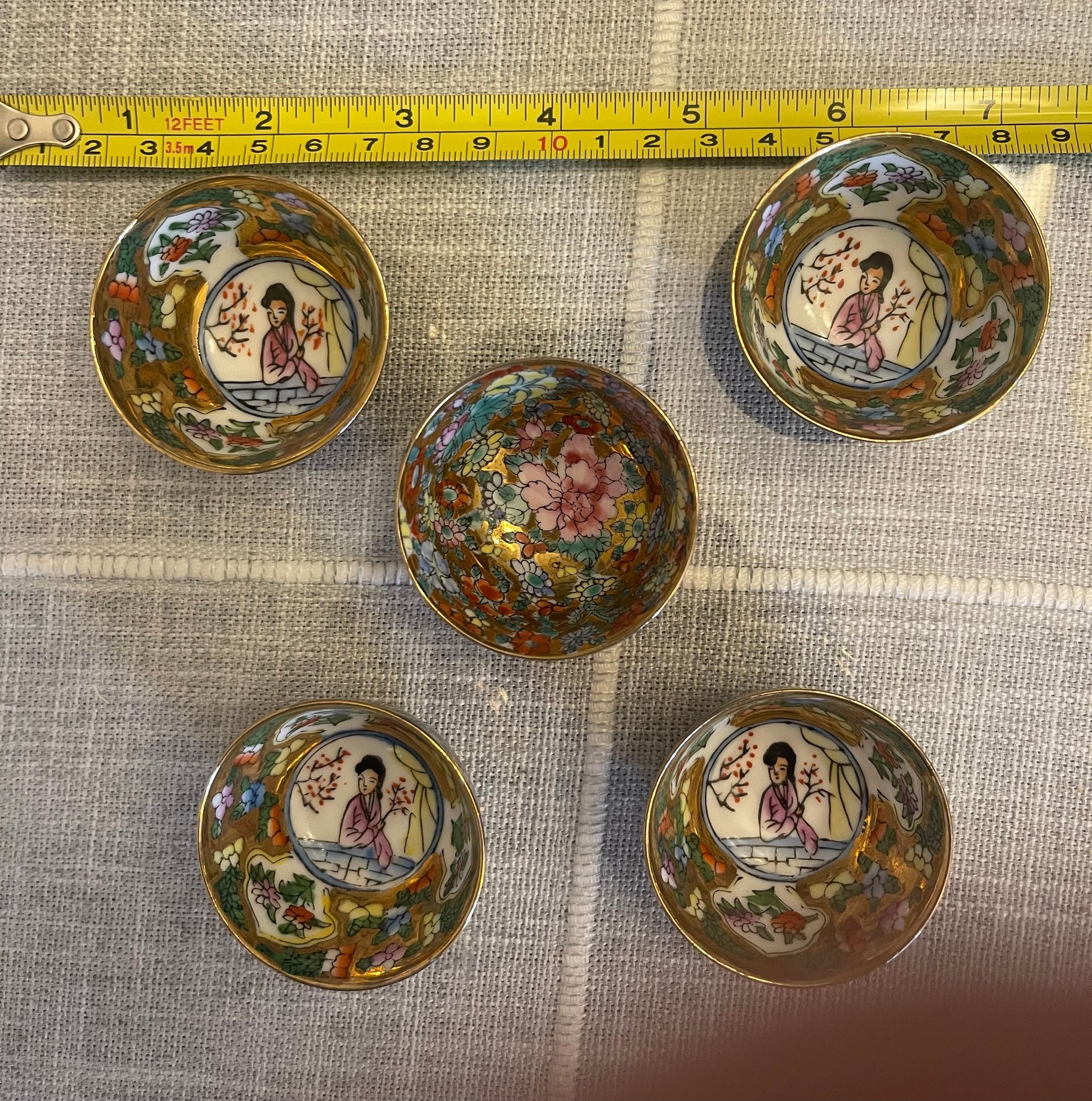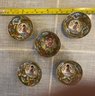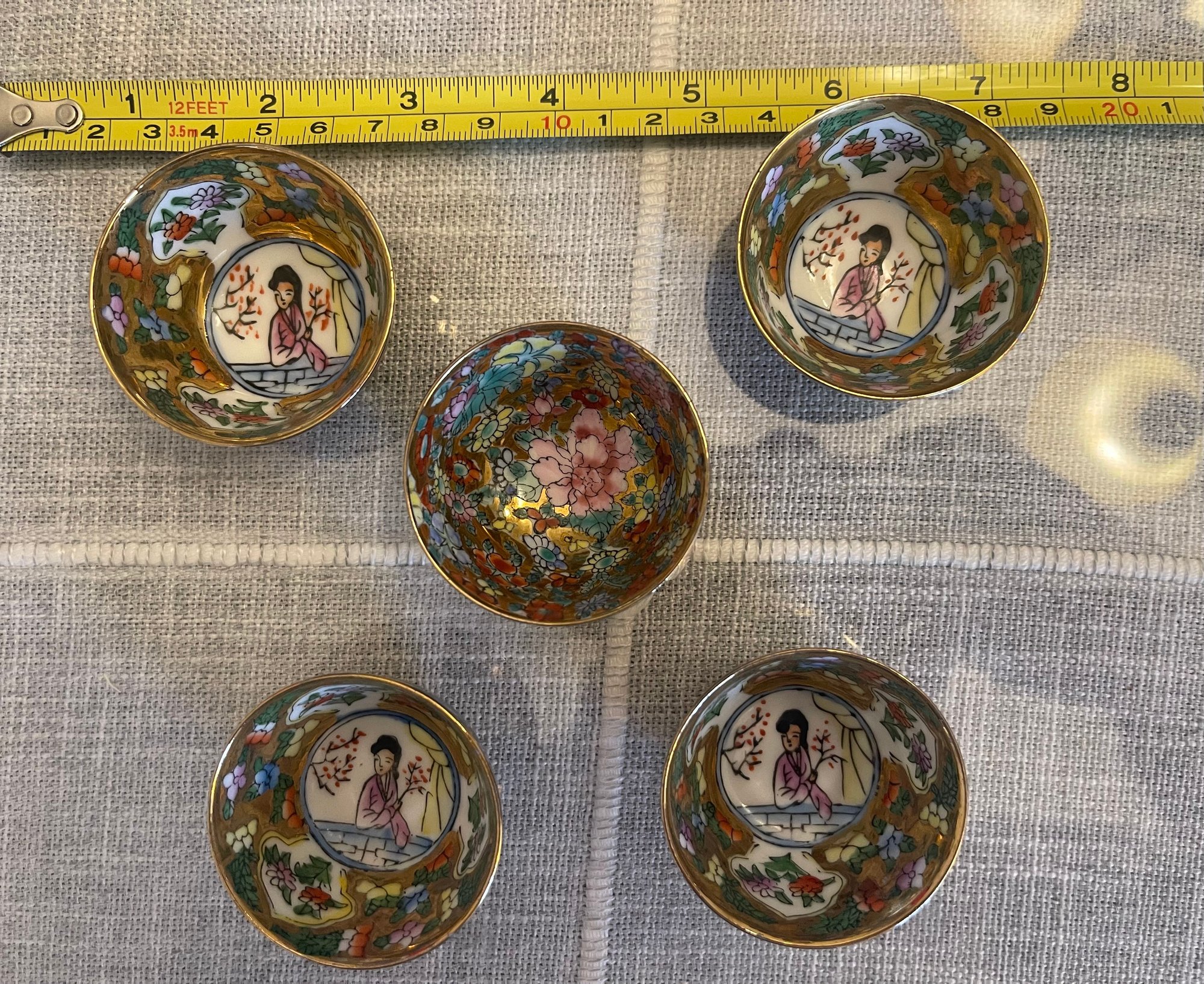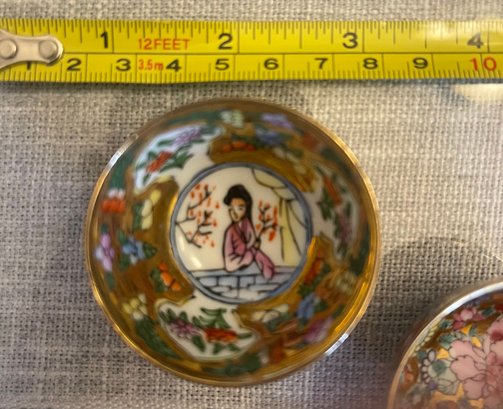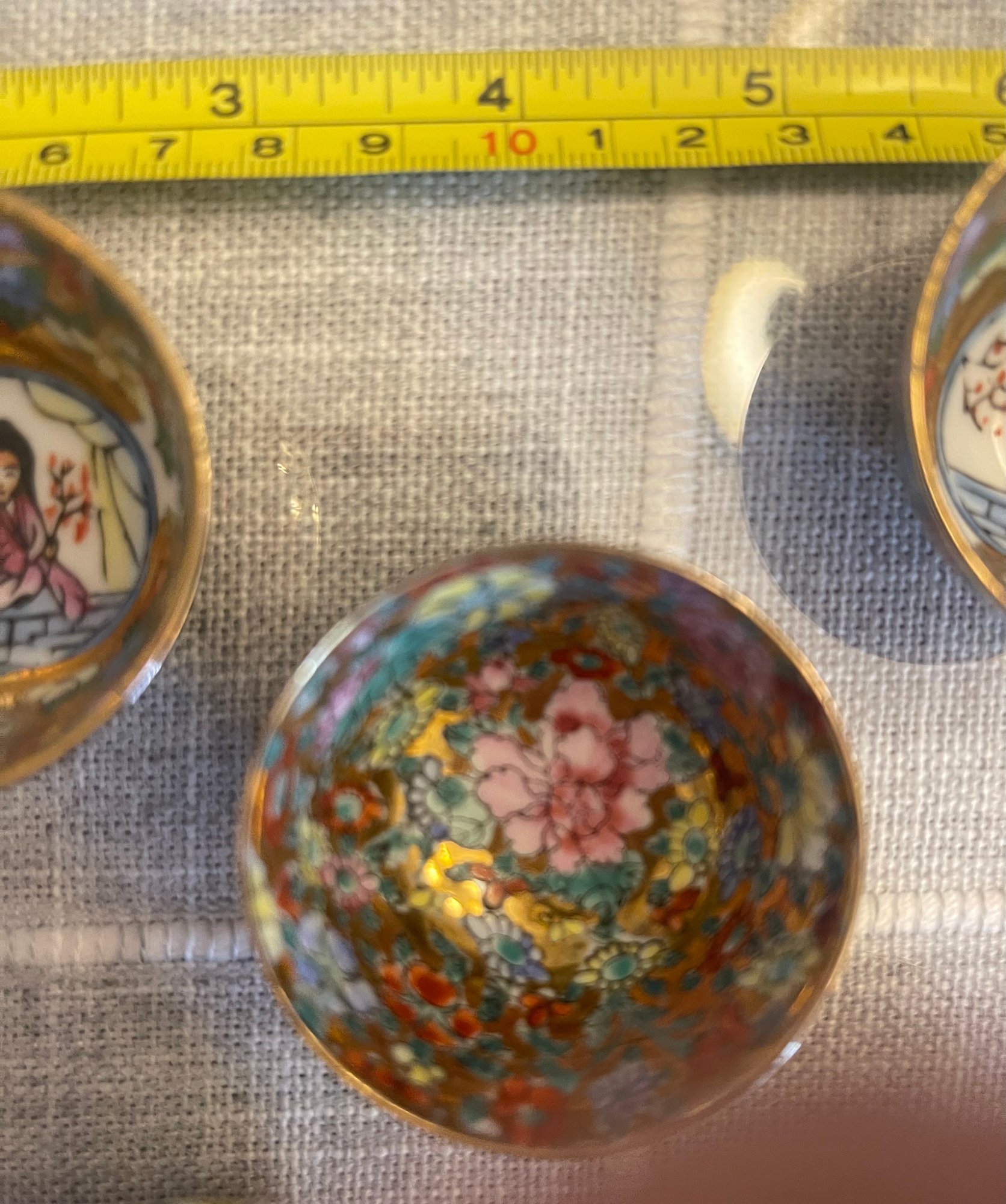 Approximately 2 inch diameter. beautiful floral pattern with gold rim, 4 have female asian figure in center.