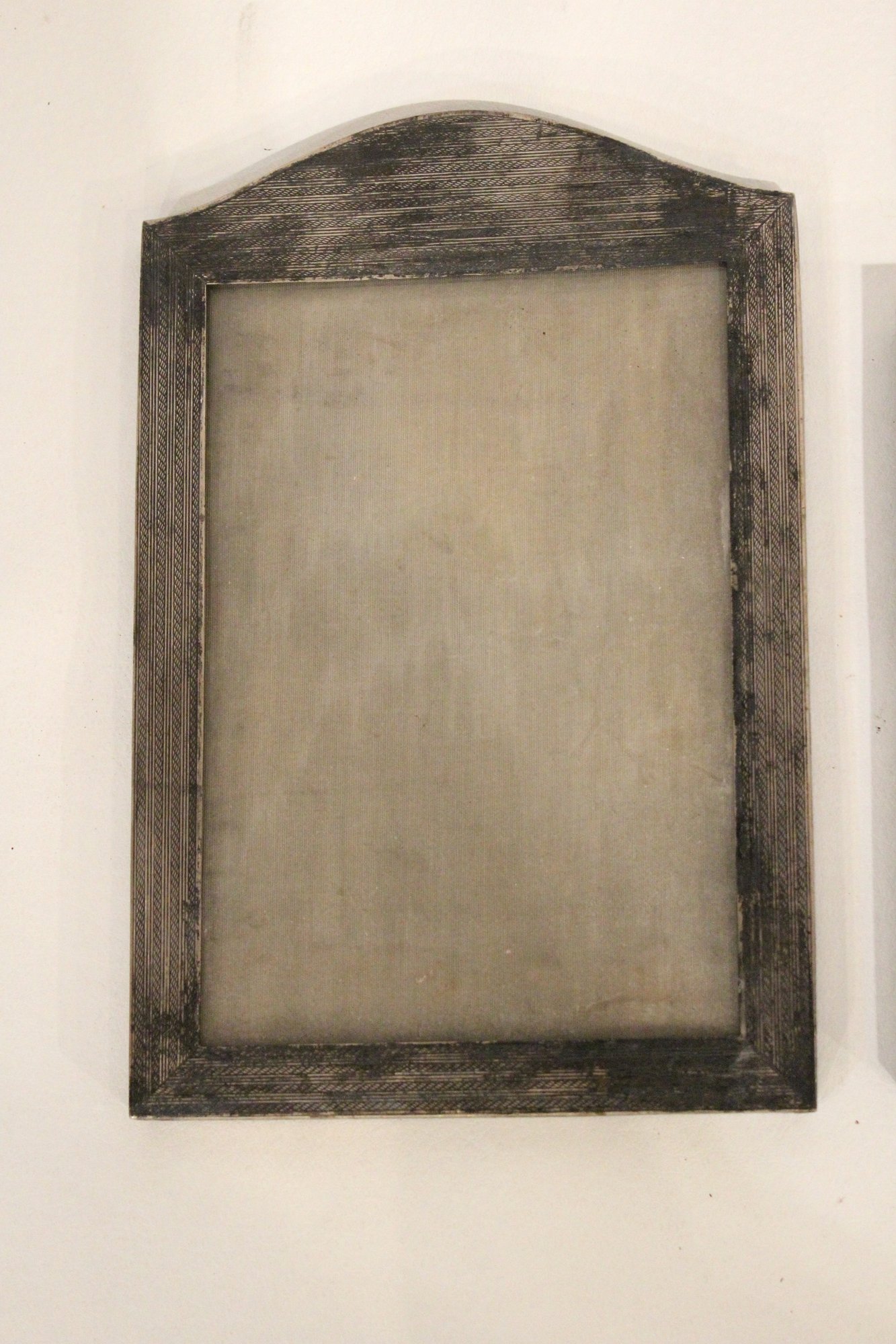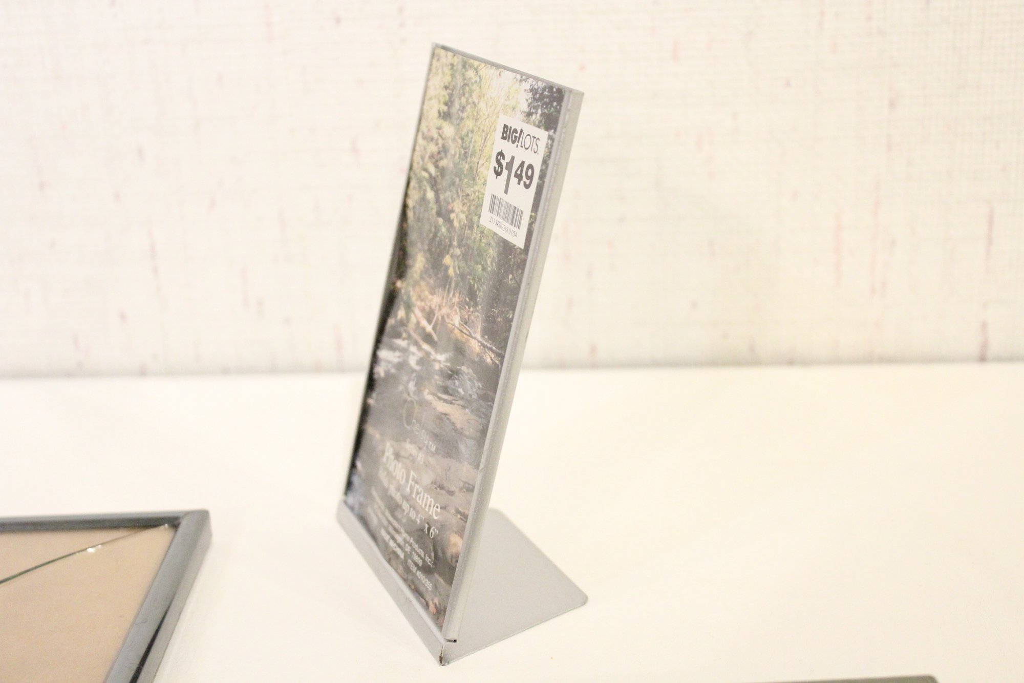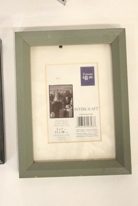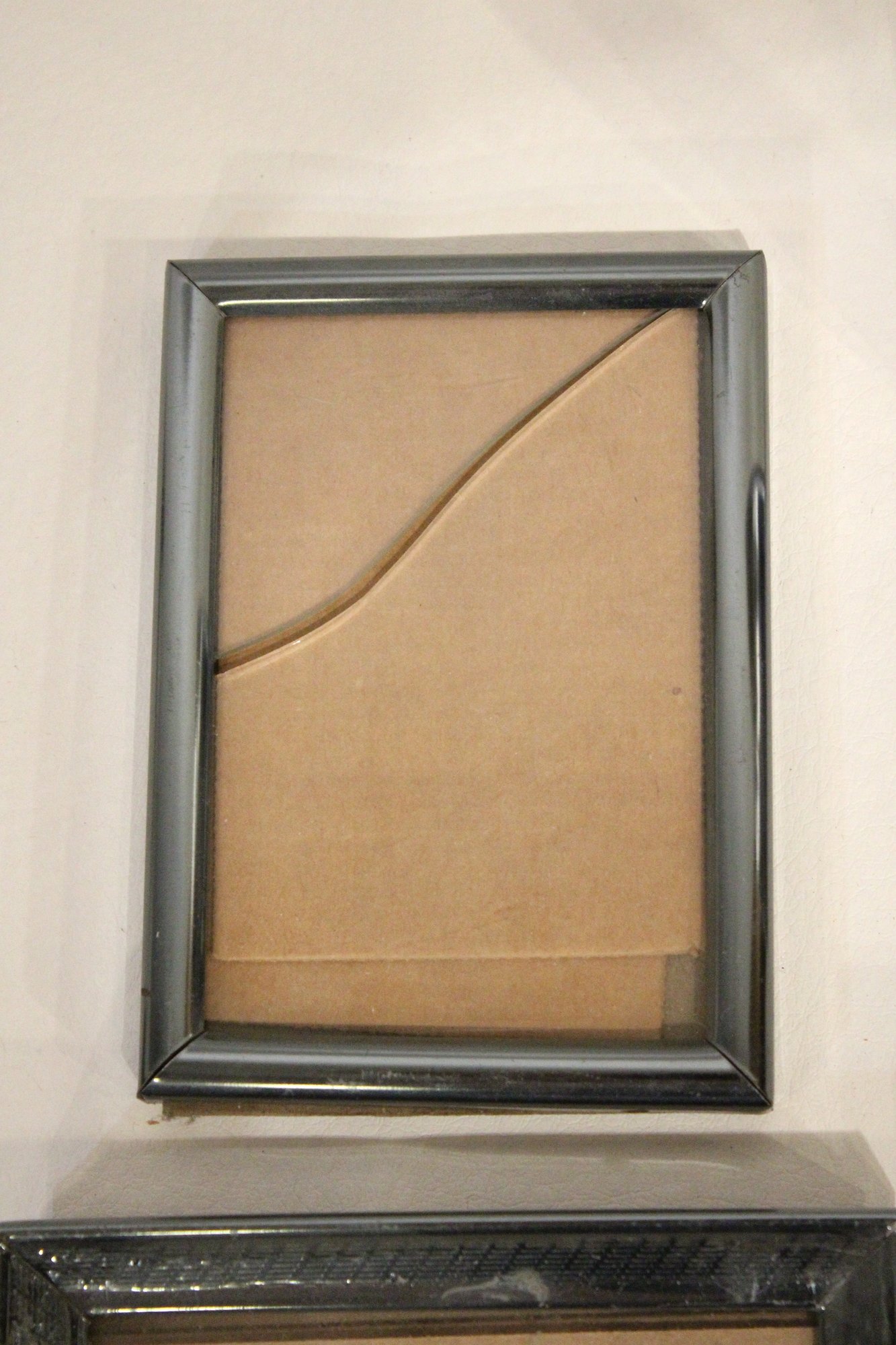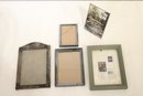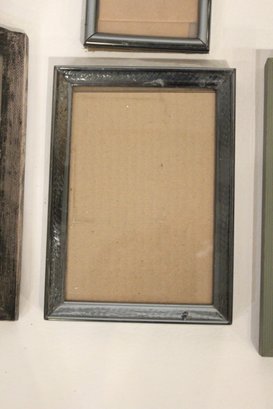 A distressed wood picture frame 9.5" x 6", a decorative black metal frame 7.5" x 5.5", a small smooth black metal frame with cracked glass 5.5" x 3.5", a green painted frame at 8.5" x 7", and lastly a standing metal minimal frame at 4" x 6". These items can be shipped.