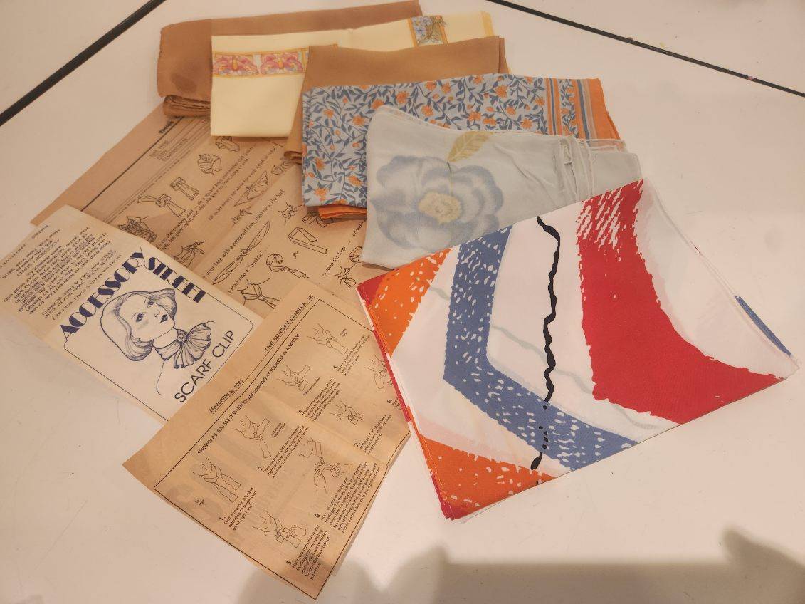 6 beautiful scarves and a vintage brochure with instructions for tying scarves