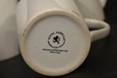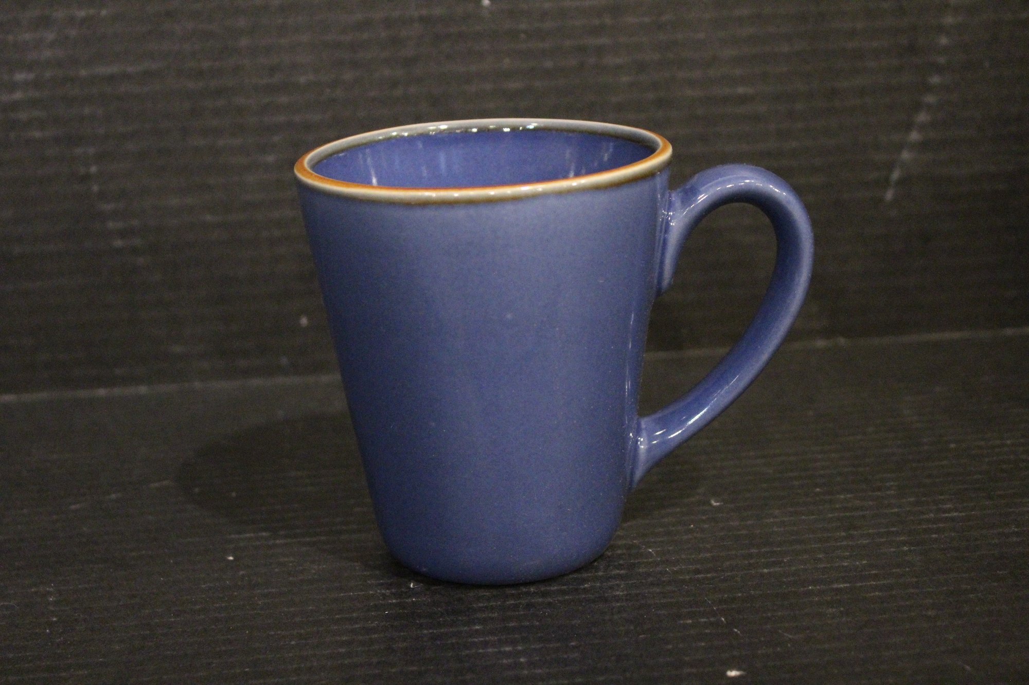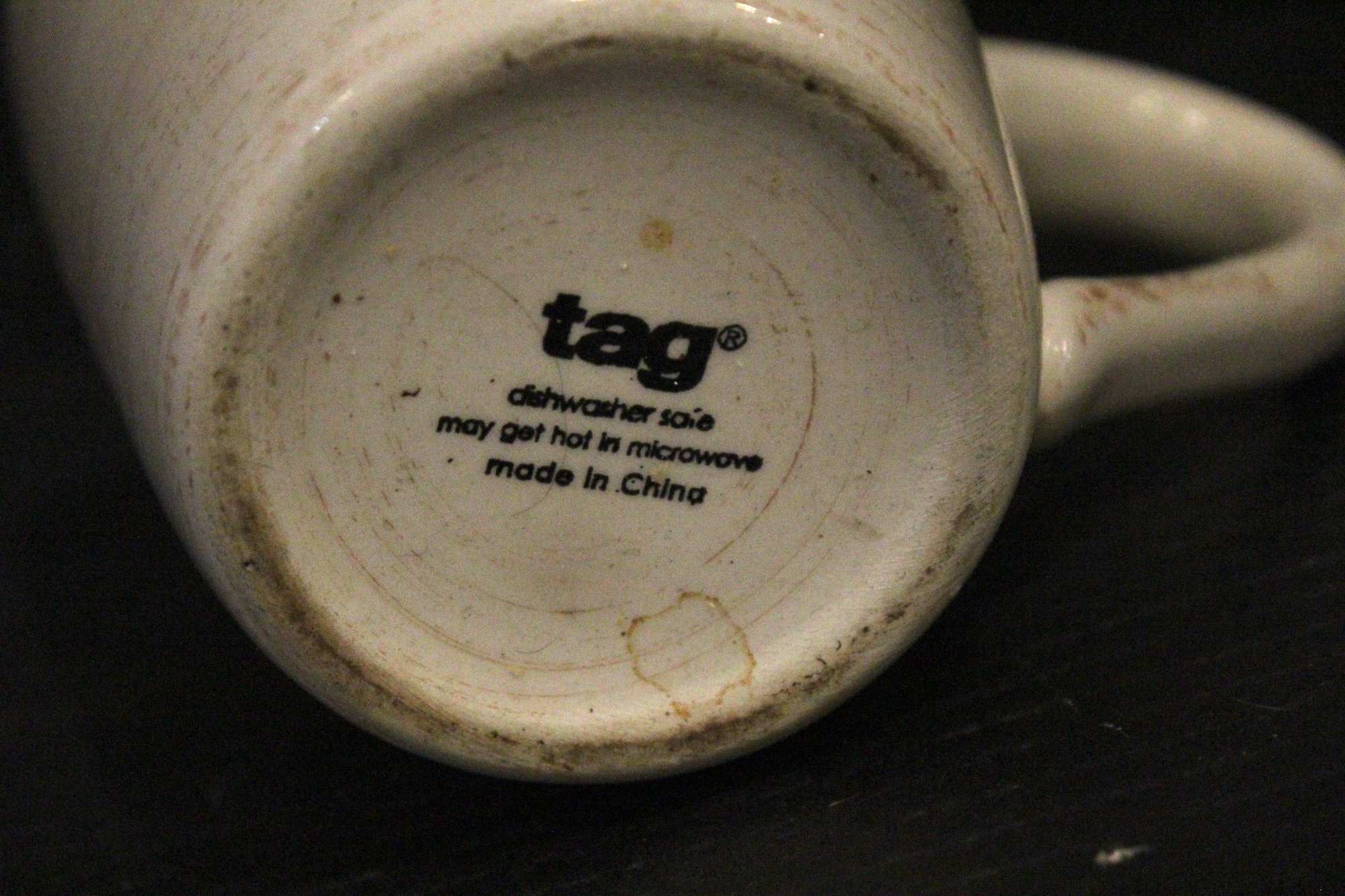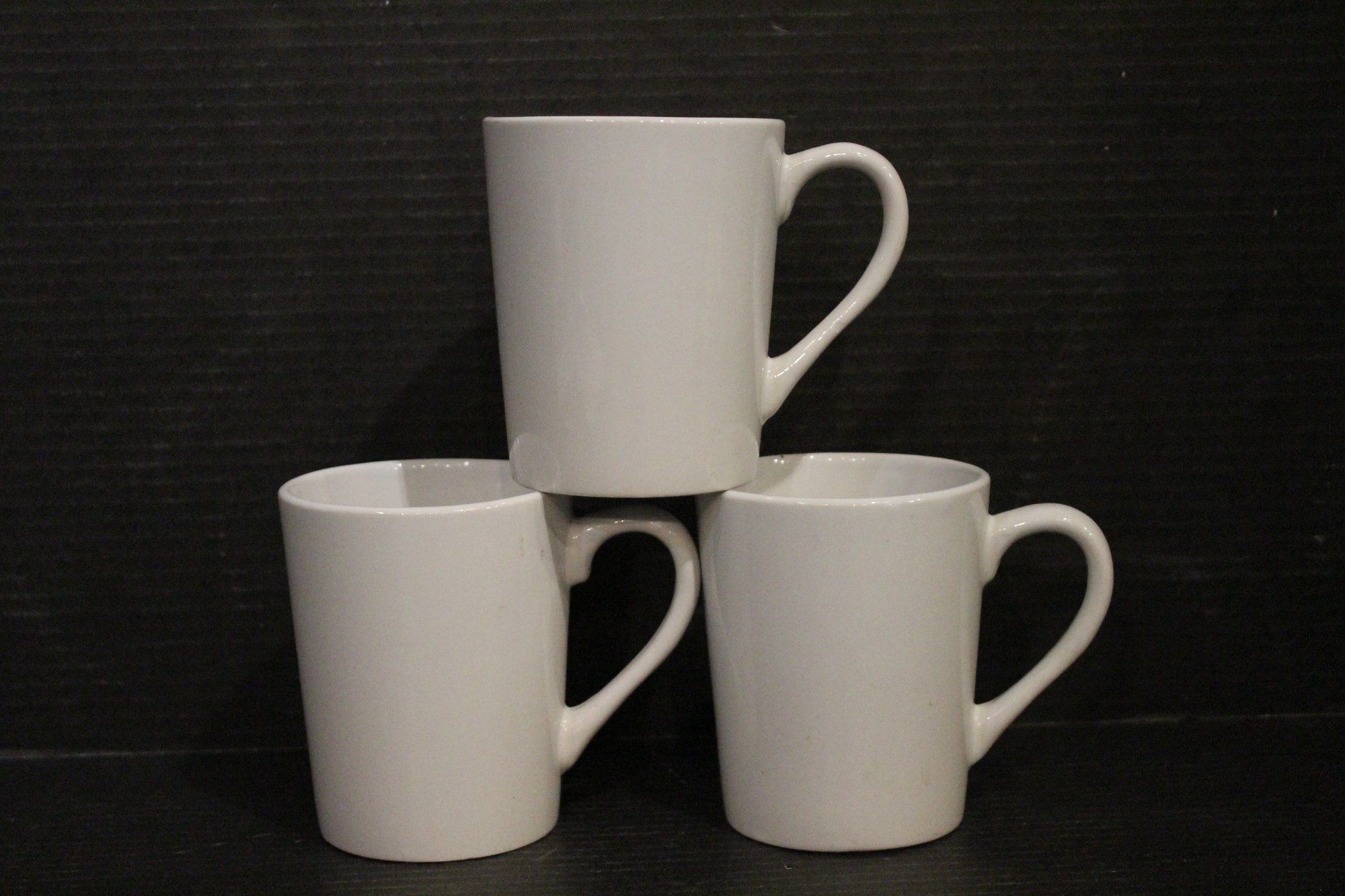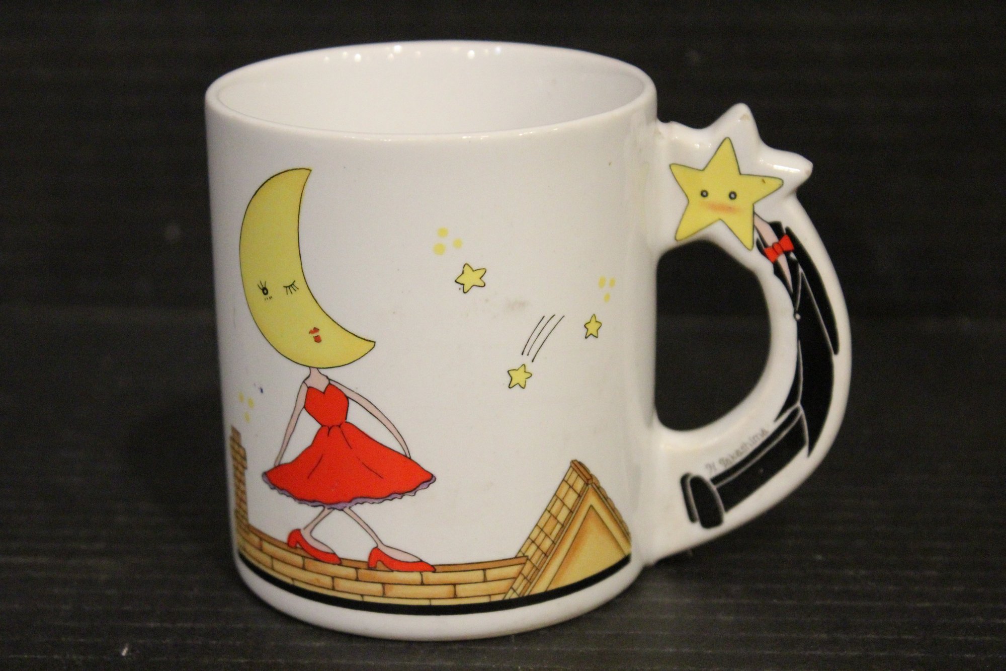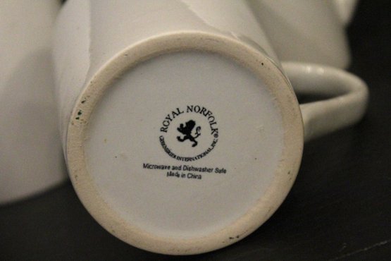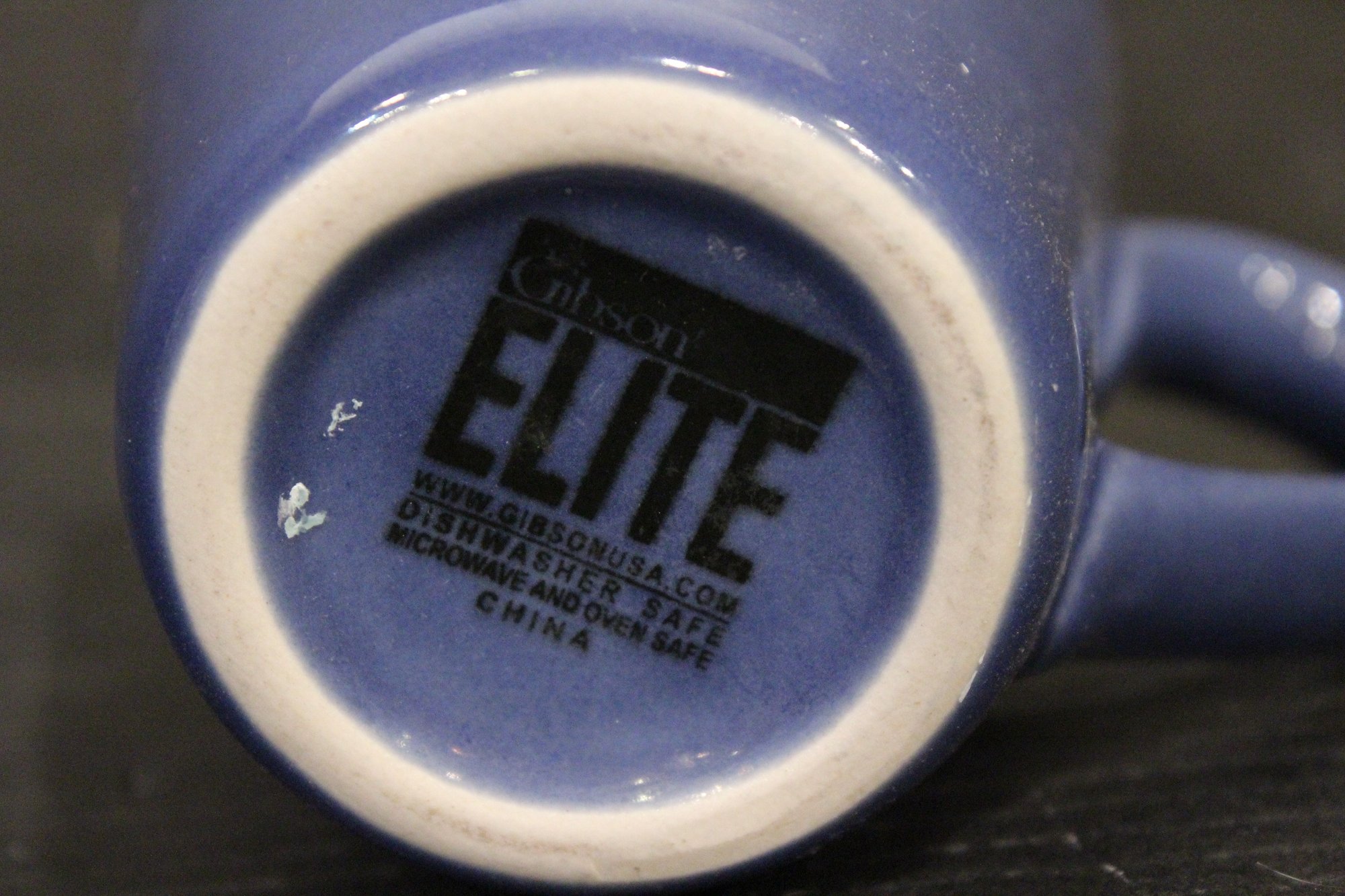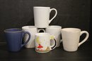 A blue and brown Gibson Elite studio mug at 4.5" x 3.5", 3 matching white Royal Norfolk ceramic mugs at 4.5" x 3.5". A white a brown Tag studio mug at 4.5" x 3.5", and lastly a vintage H. Takashima Star Yellow Moon ceramic coffee tea mug cup, made in Japan, 3.75" x 3". These items can be shipped.