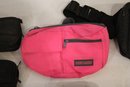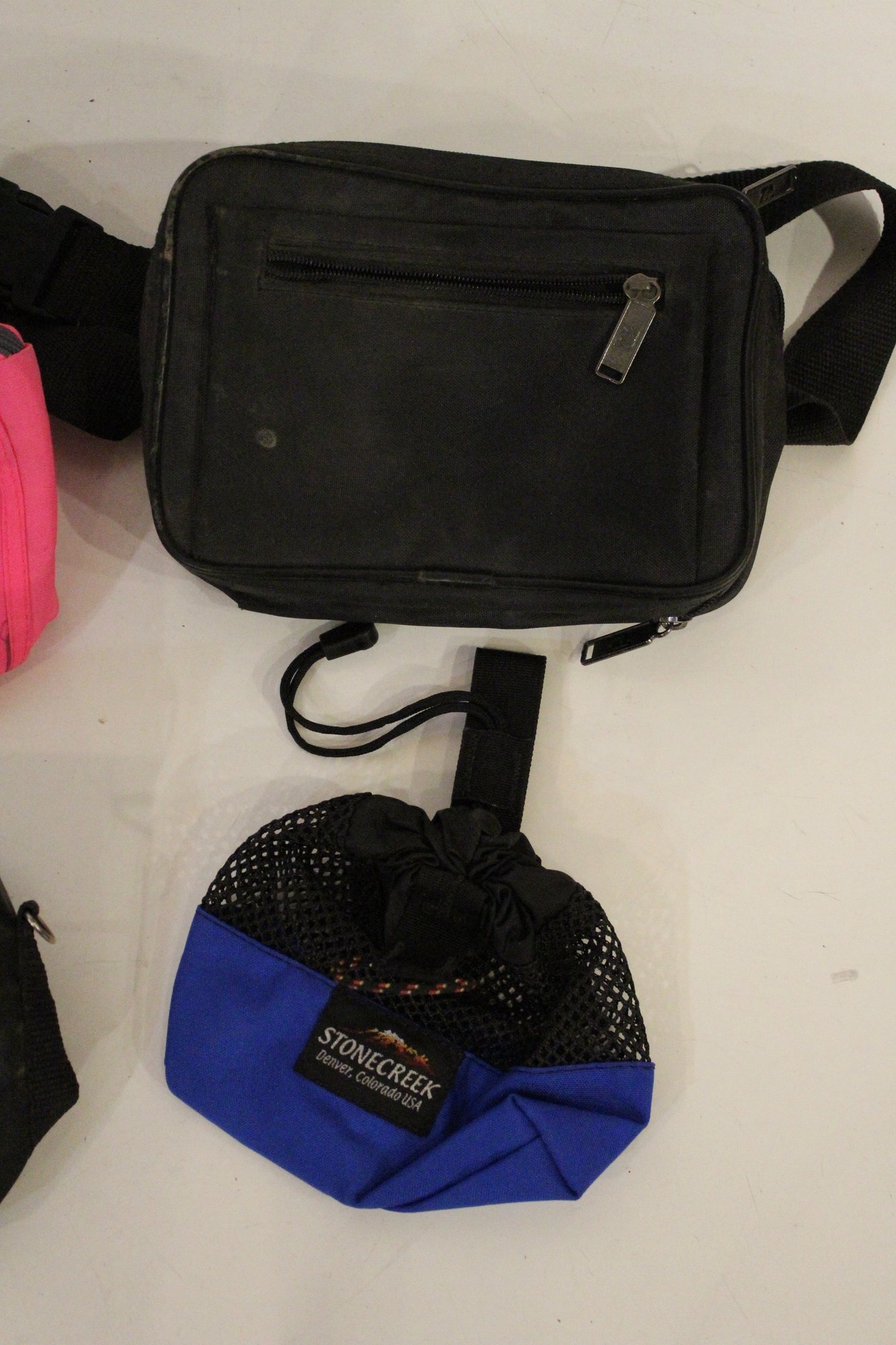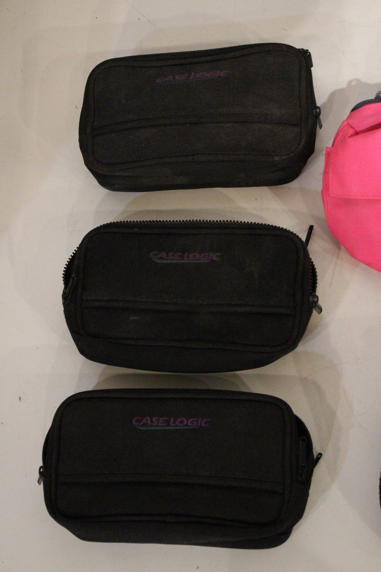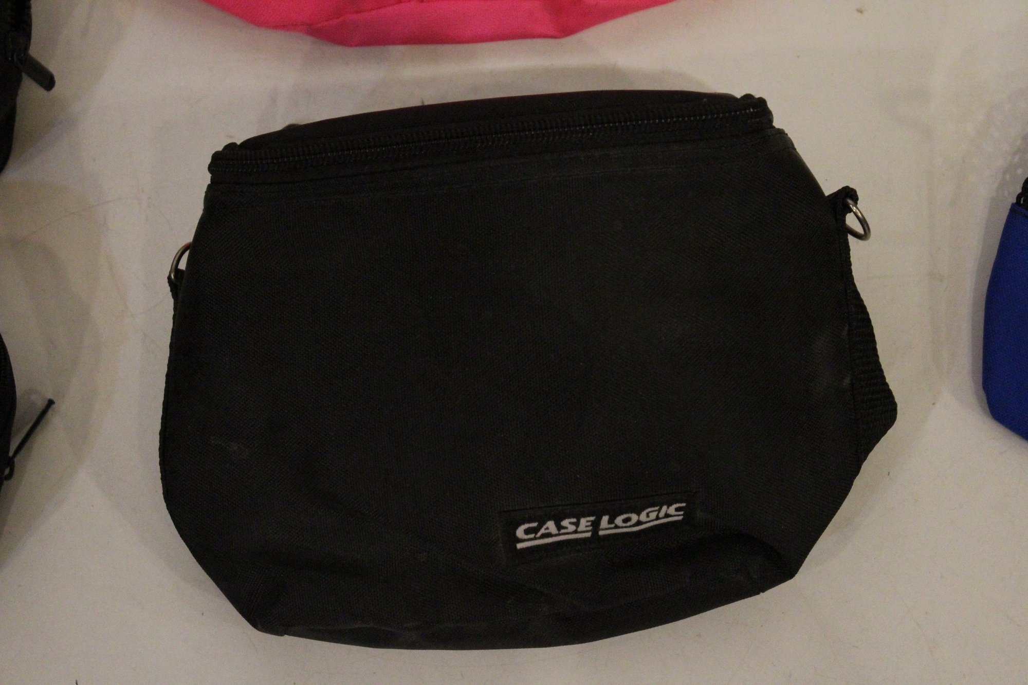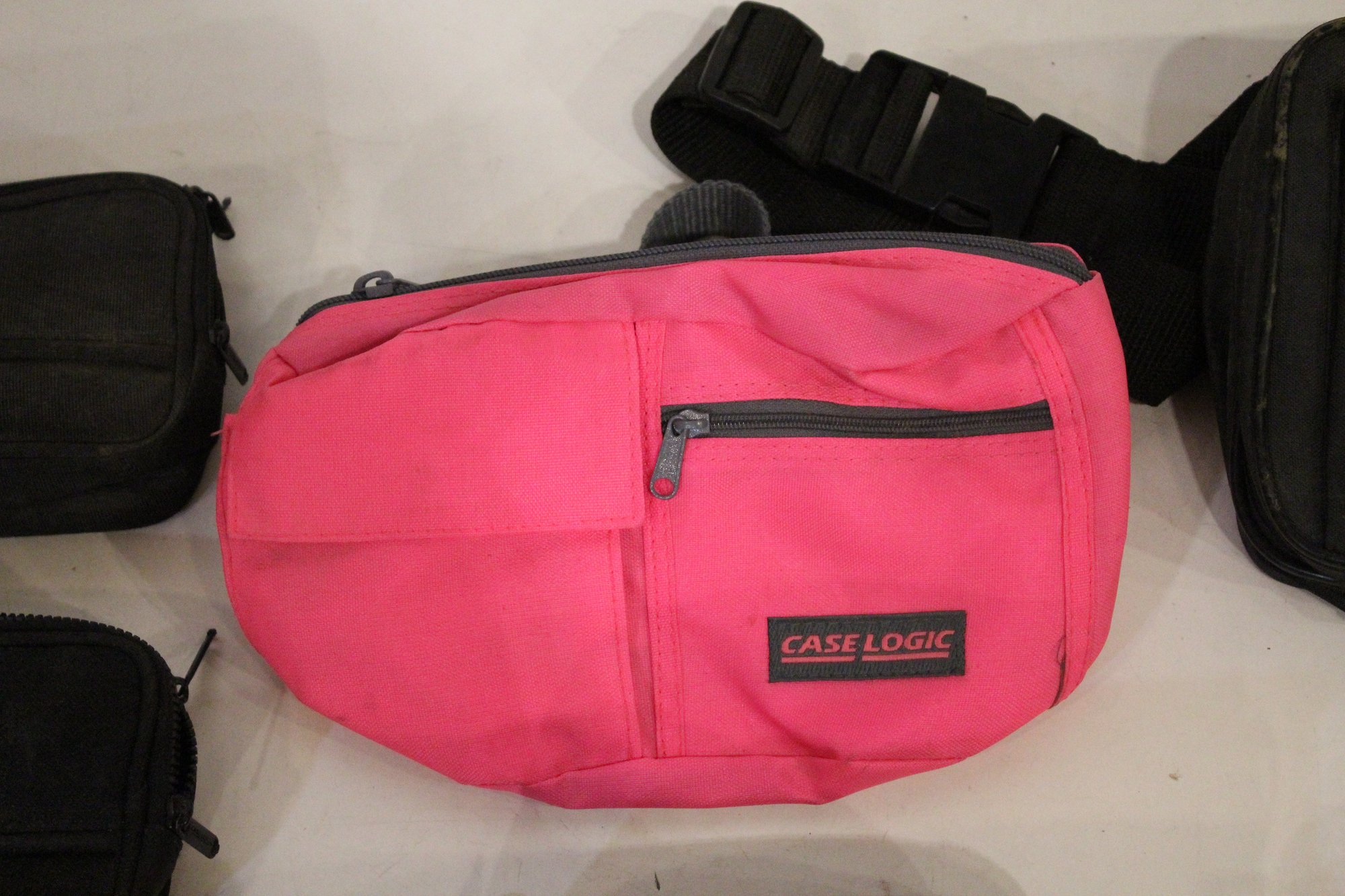 3 small Case Logic pouches that can be used as or attached to a fanny pack 7" x 4" x 2". A bright pink Case Logic 9" x 6", and a black pouch at 8" x 6". As well as a Case Logic black fanny pack 8" x 6" x 3", and lastly a blue Stone Creek Denver netted pouch 6" x 5". These items can be shipped