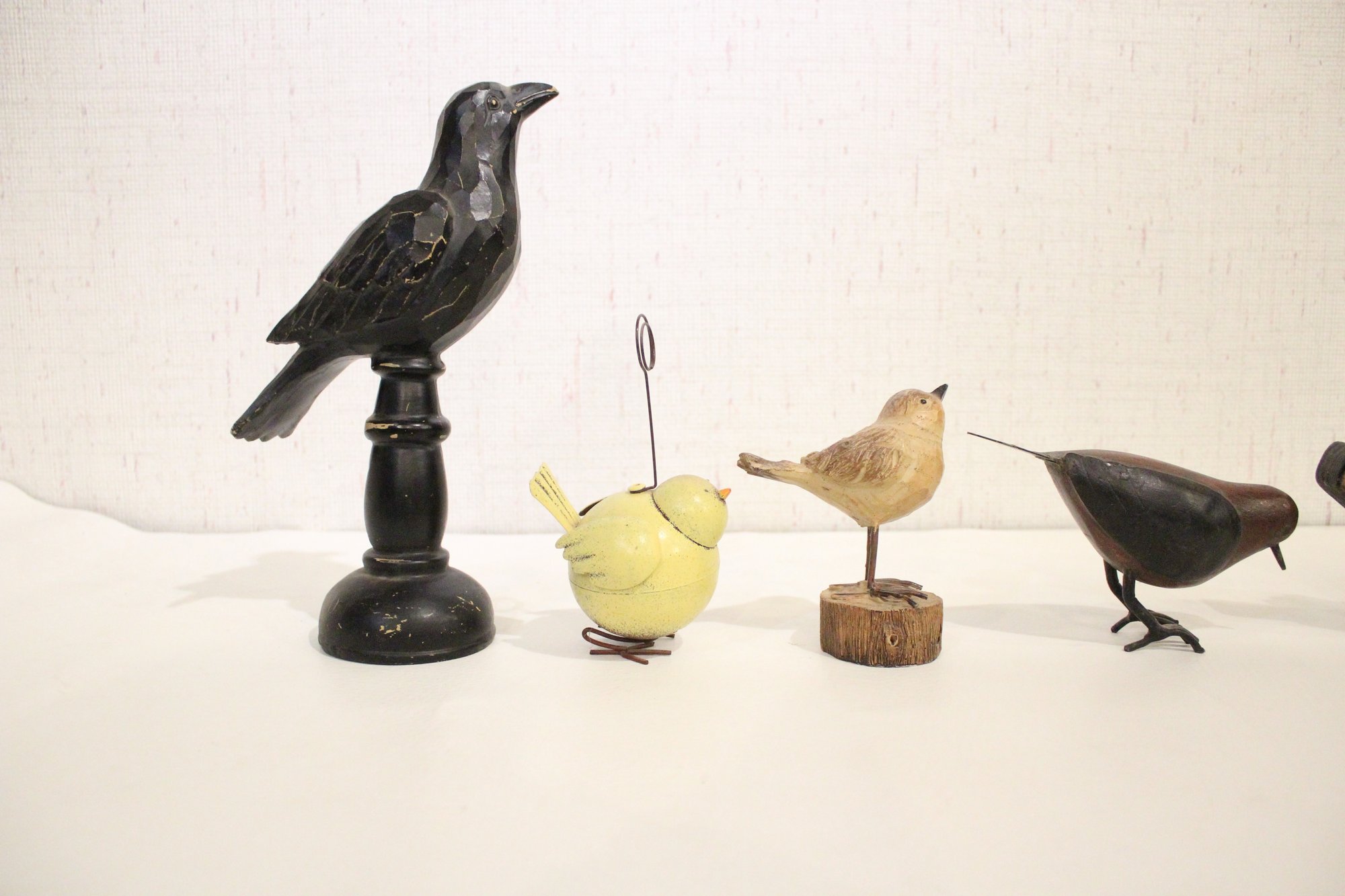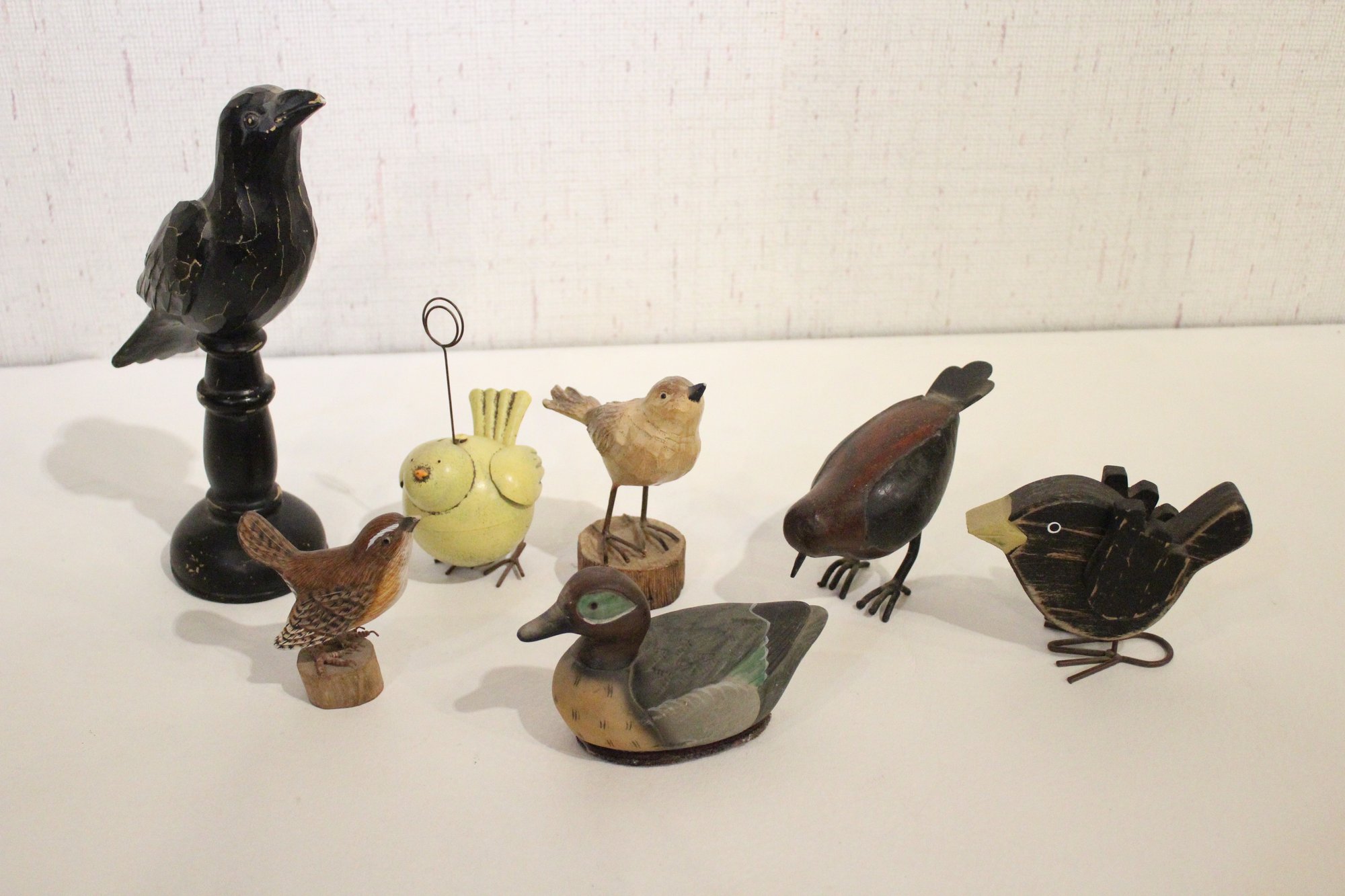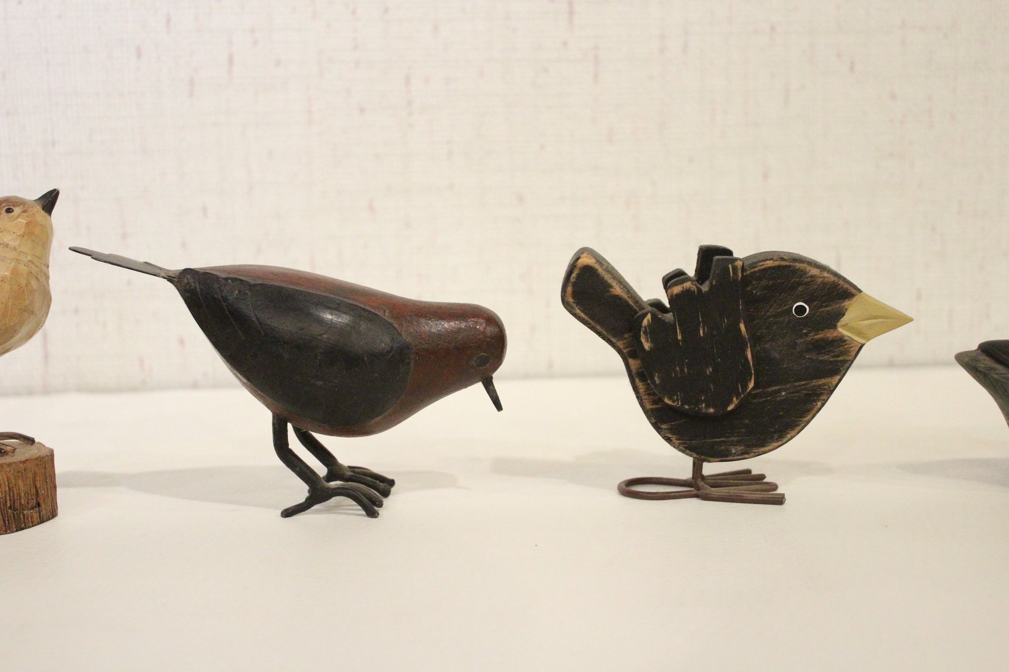 A collection of 7 folk art carved wooden bird figures 9.5" tall - 3.5" tall. These items can be shipped.