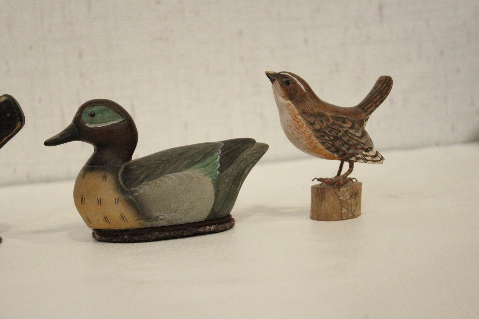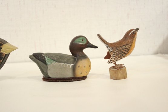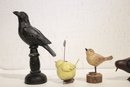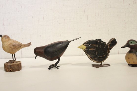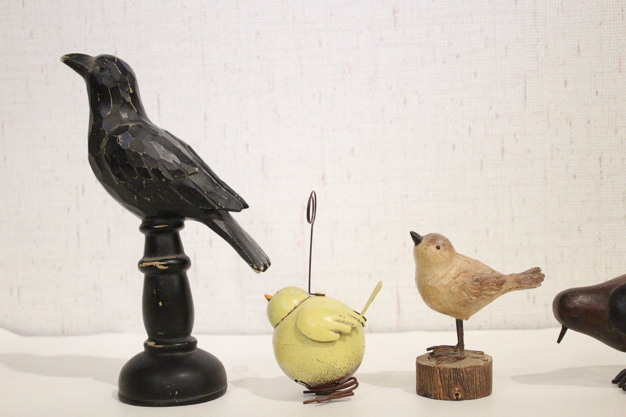 A collection of 7 folk art carved wooden bird figures 9.5" tall - 3.5" tall. These items can be shipped.
