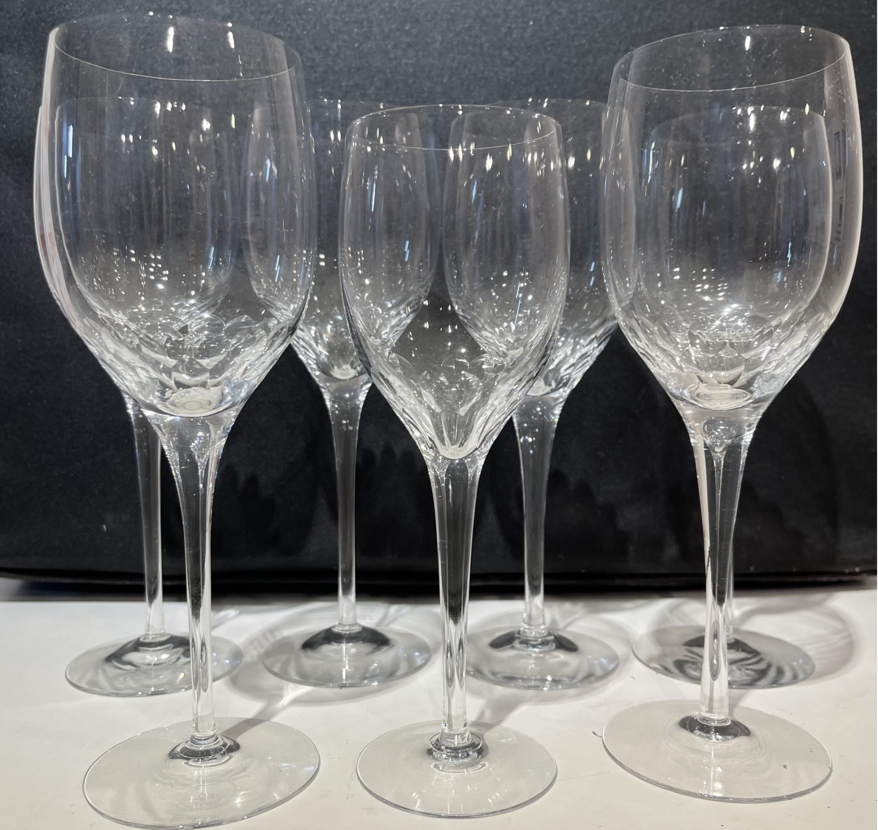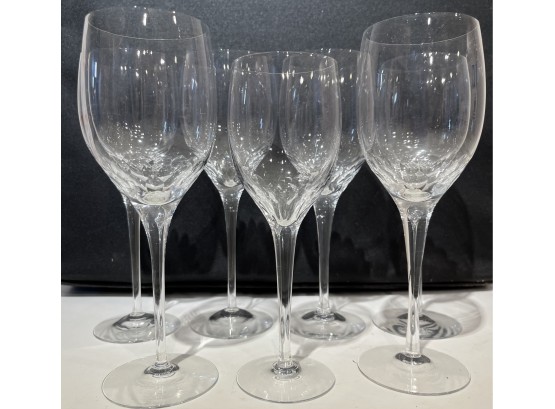 6 wine goblets of 8 inch size and 1, 6 inch size. Swedish crystal by Orrefors, in the Prelude pattern.