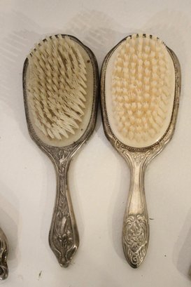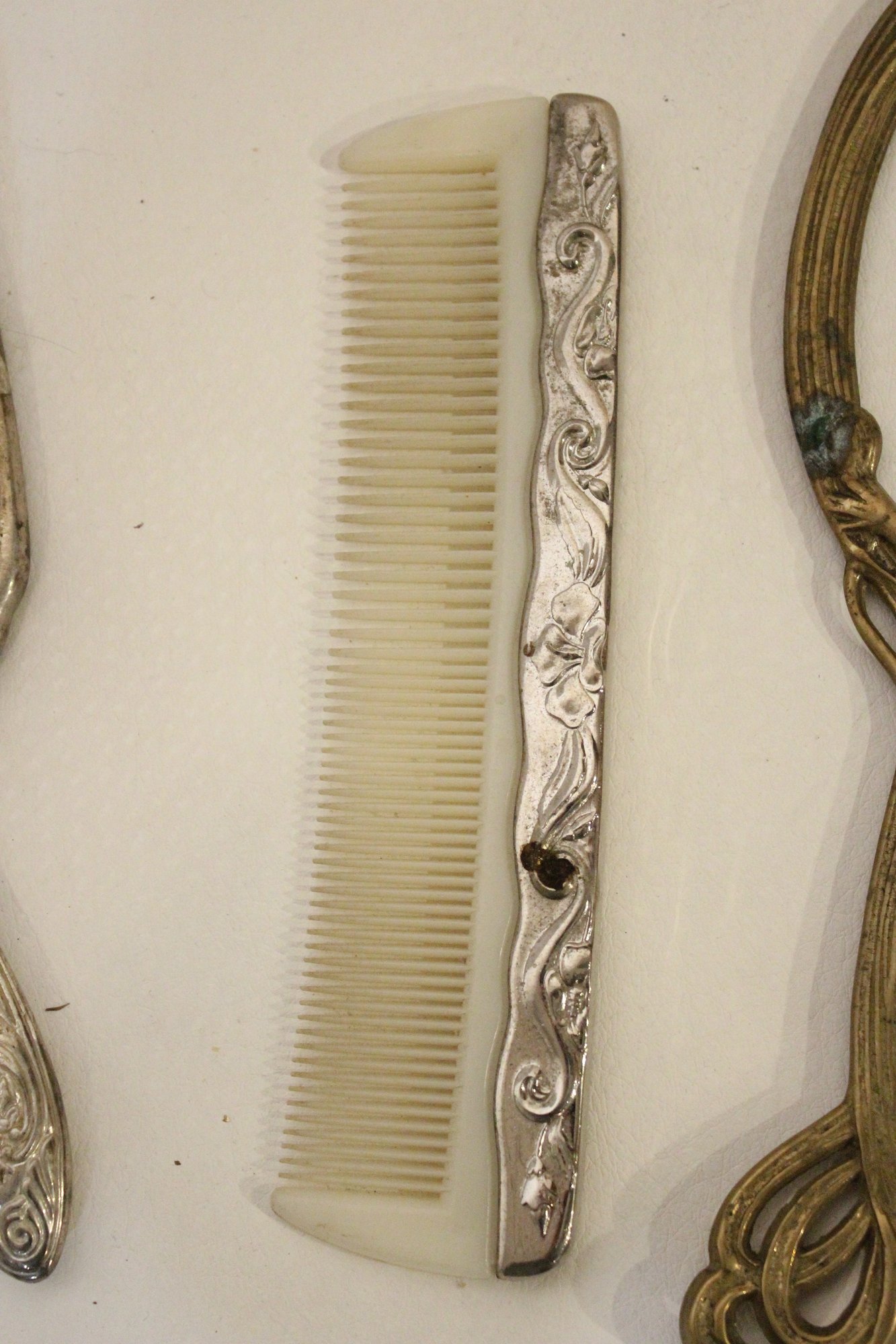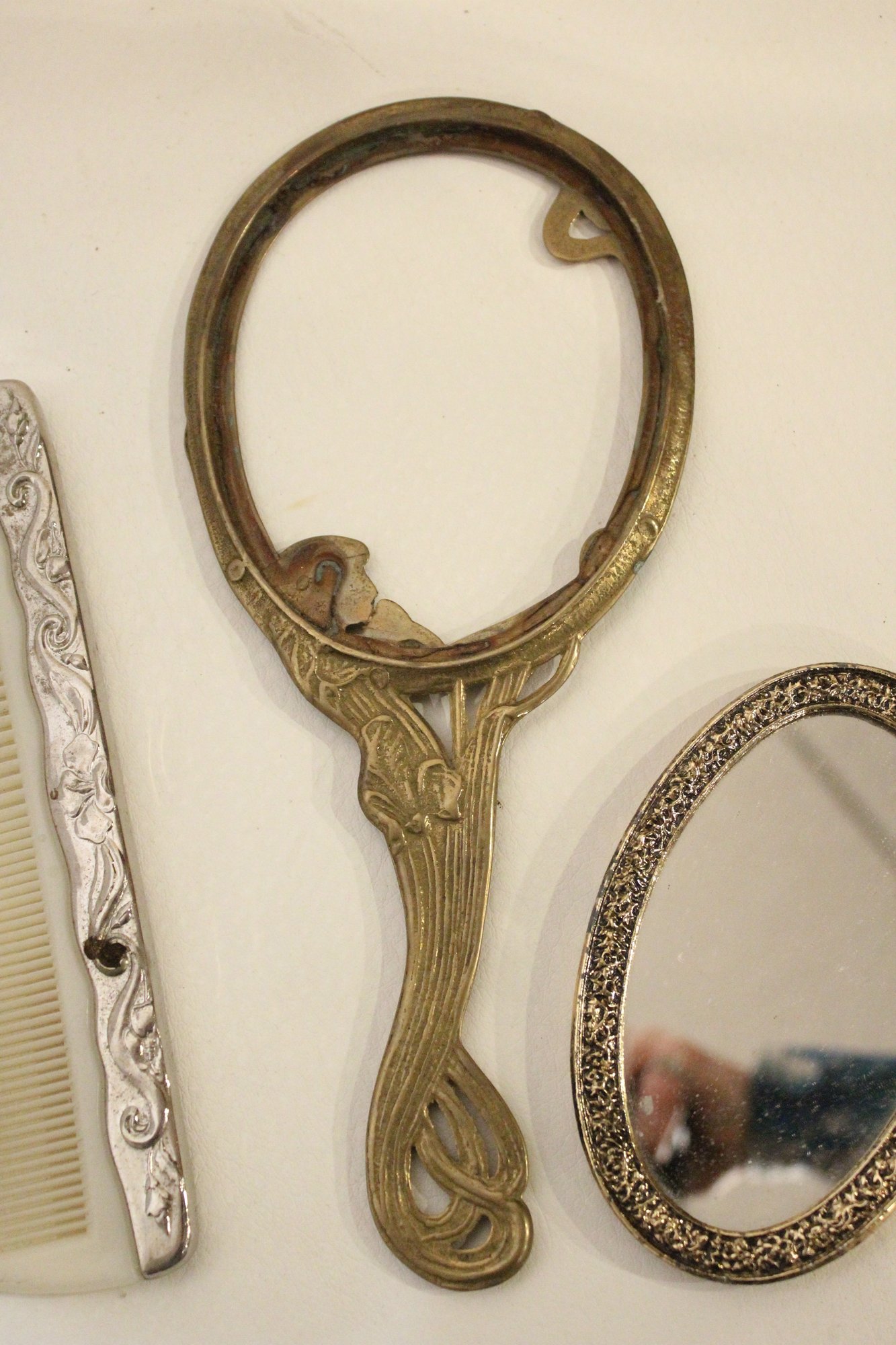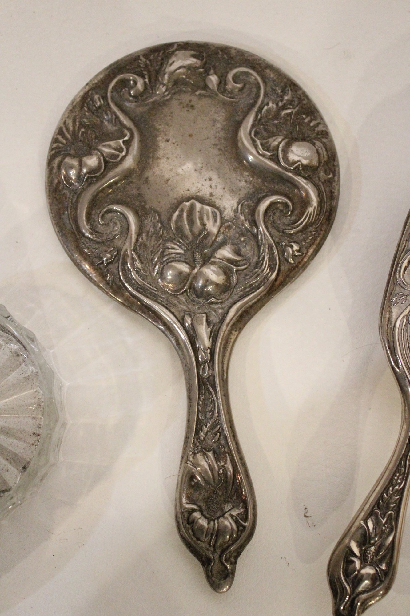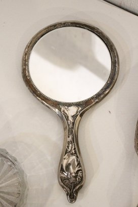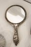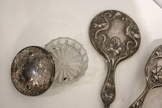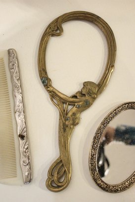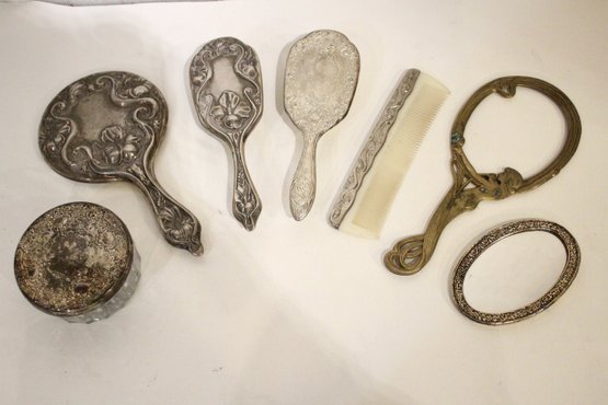 A vintage cut glass powder jar with an ornate silver plated lid 4" x 2", a vintage silver plated handheld mirror with Hibiscus flower 10" x 5", a matching vintage Art Nouveau silver plated vanity brush with Hibiscus flower 8". A vintage silver plated vanity brush with ornate floral and scroll designs 8", with a matching vintage silver plated vanity comb 7.5". An Art Nouveau style hand held golden brass graceful woman 10" x 4.5", and lastly an Art Nouveau brass mirror 5" x 3".