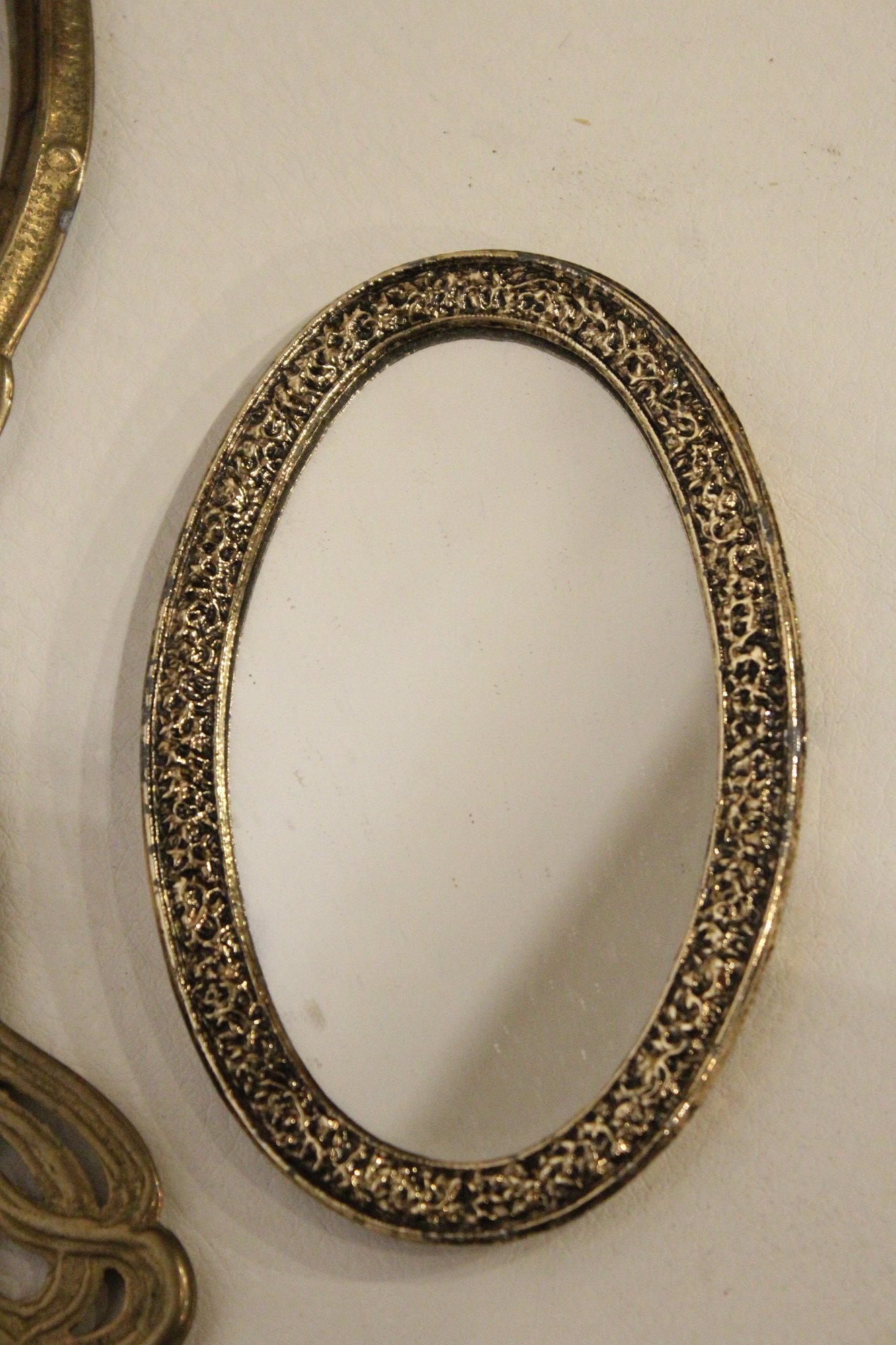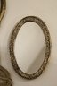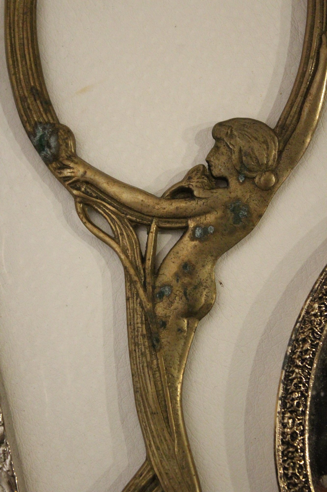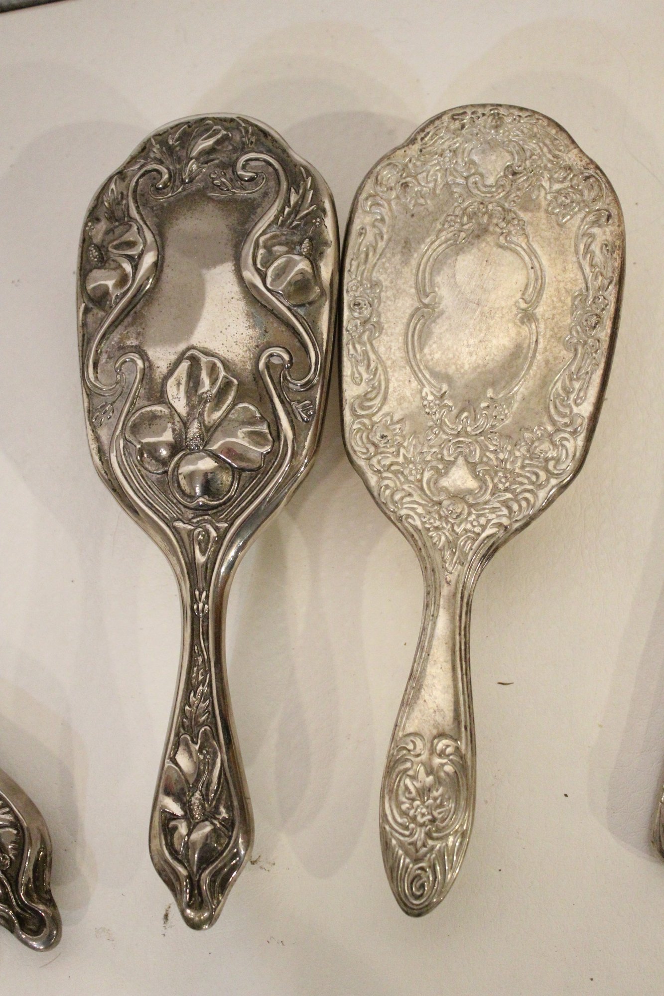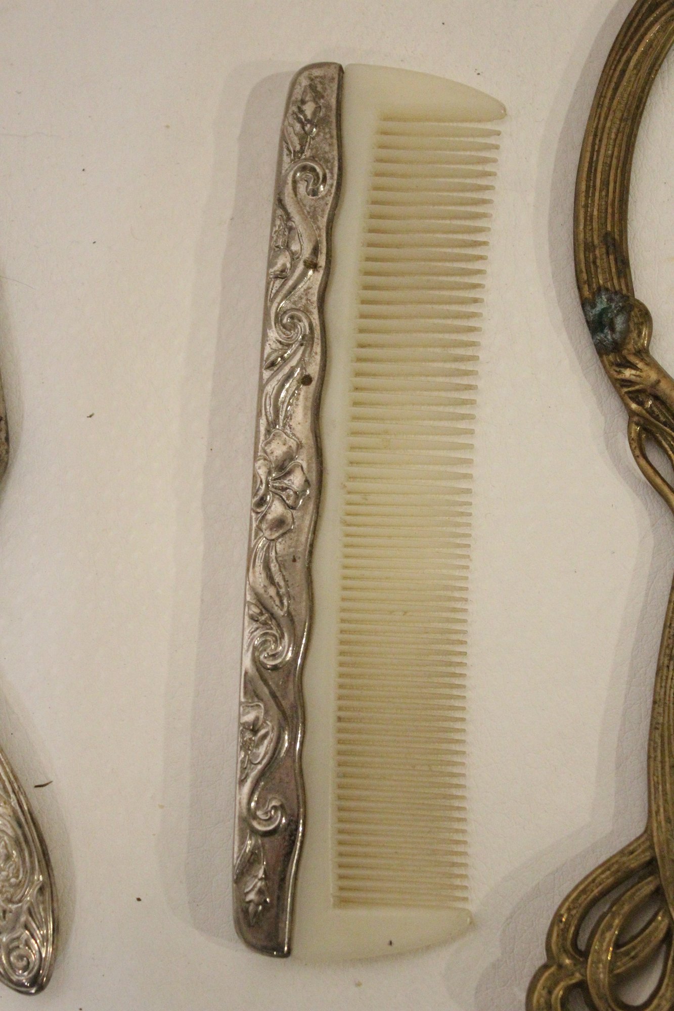 A vintage cut glass powder jar with an ornate silver plated lid 4" x 2", a vintage silver plated handheld mirror with Hibiscus flower 10" x 5", a matching vintage Art Nouveau silver plated vanity brush with Hibiscus flower 8". A vintage silver plated vanity brush with ornate floral and scroll designs 8", with a matching vintage silver plated vanity comb 7.5". An Art Nouveau style hand held golden brass graceful woman 10" x 4.5", and lastly an Art Nouveau brass mirror 5" x 3".