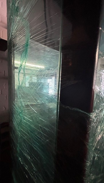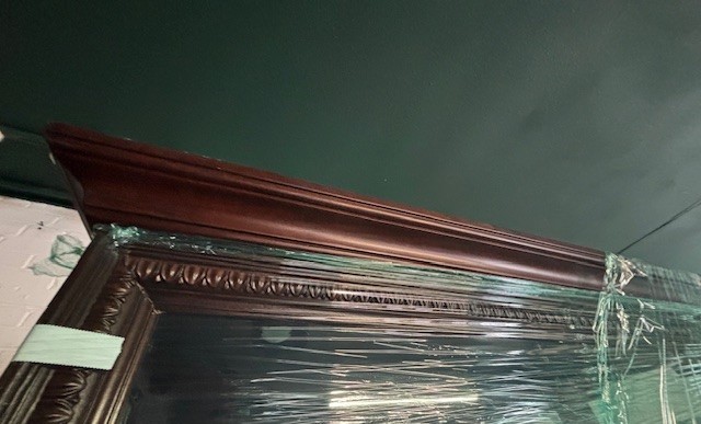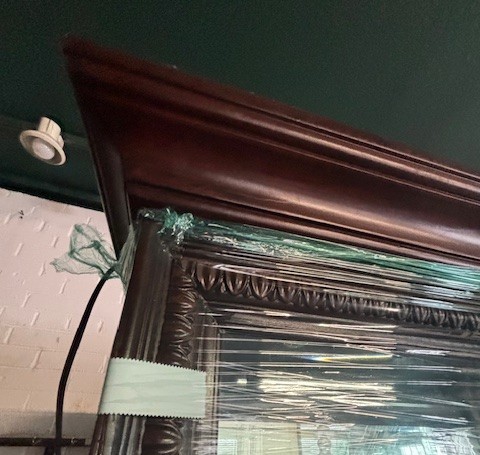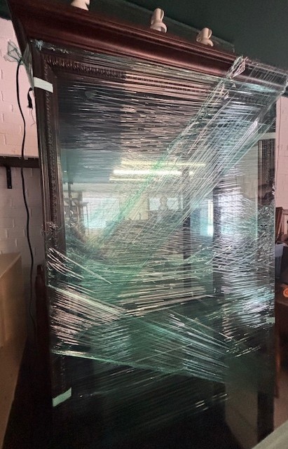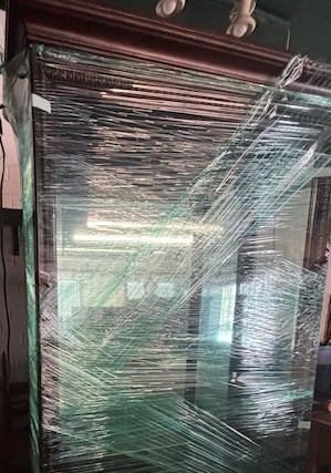 This piece is 8' tall by 4' wide and 1' deep, with 5 glass shelves and glass doors that open on each end, the front is all glass. The top has a beveled molding with ornate second to give it a deeper more extinguished look. We have this wrapped in plastic for easy transport, it is one piece and tall. Good condition. This item will not ship. Can be delivered for 45.00 within Denver City area.