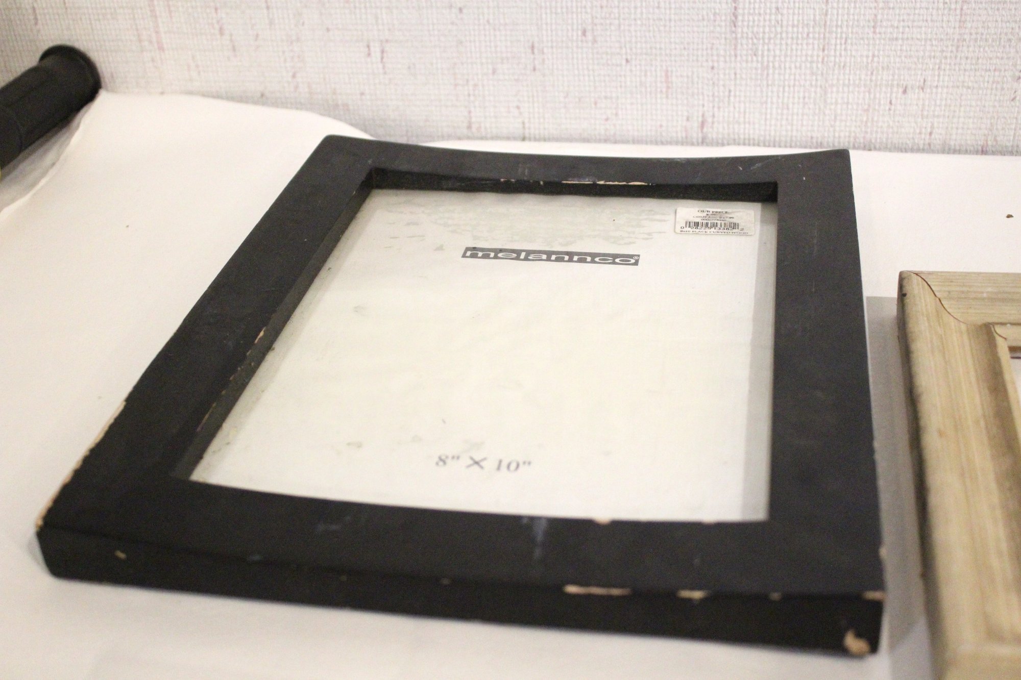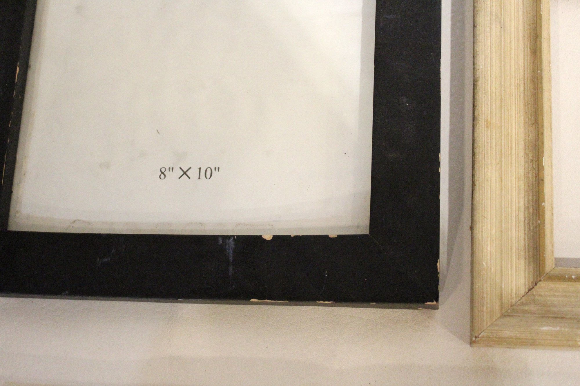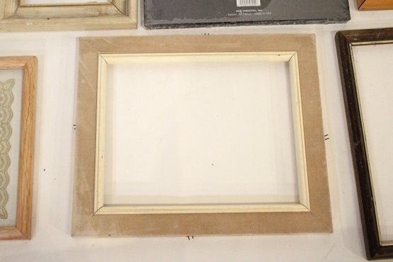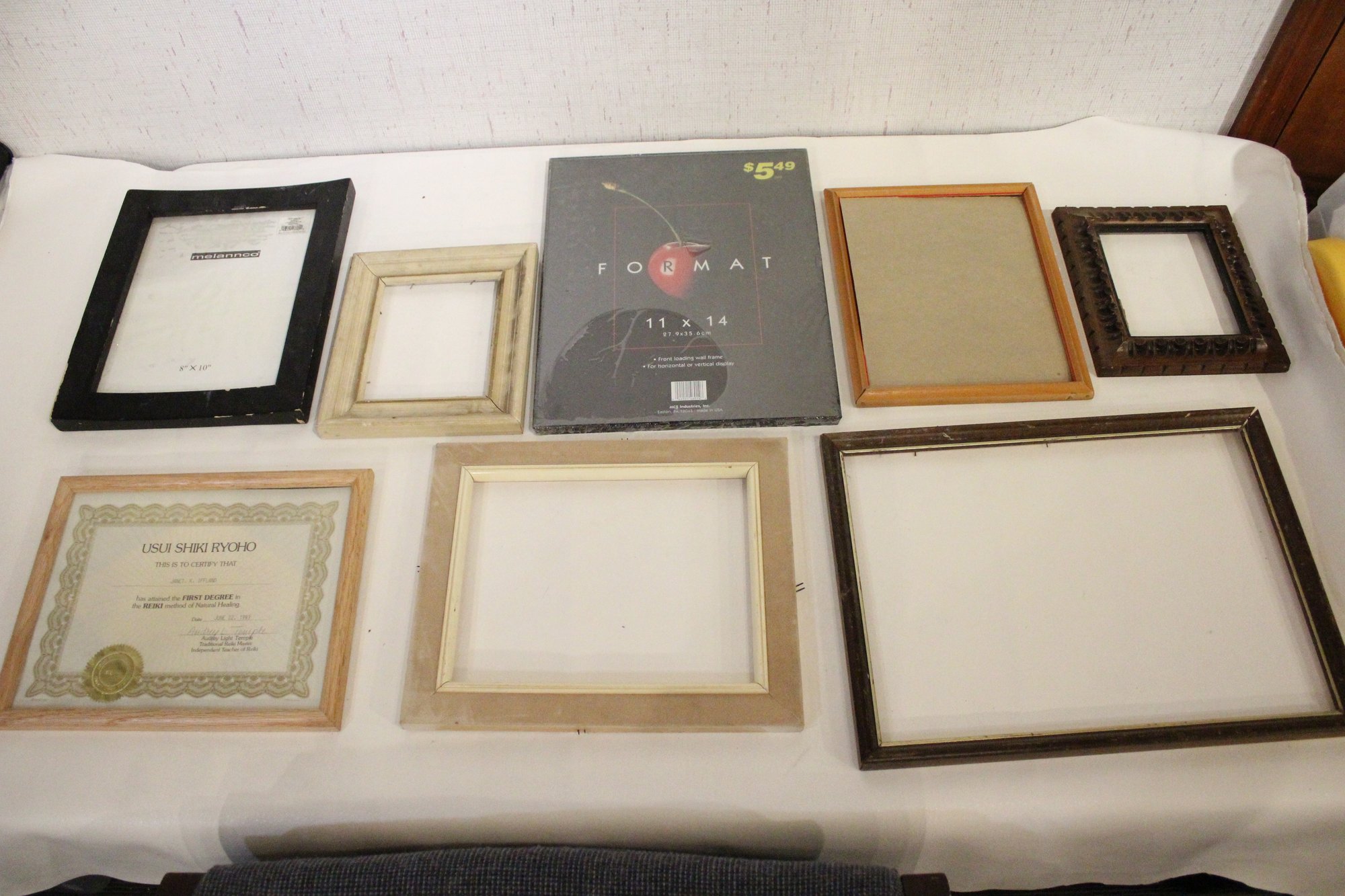 A Melannco wood, black painted and curved frame holds 8" x 10", a wood white painted frame holds 5" x 7" no glass, a minimal black metal frame holds 11" x 14". A wood frame hold 8" x 10", no glass, a small carved wood frame holds 5" x 7", no glass. A light wood document frame holds 9" x 11", an inner fabric frame piece holds 8" x 10", and wood frame holds 15" x 10", is very worn and no glass. These items can be shipped.