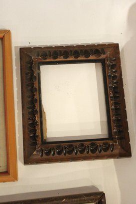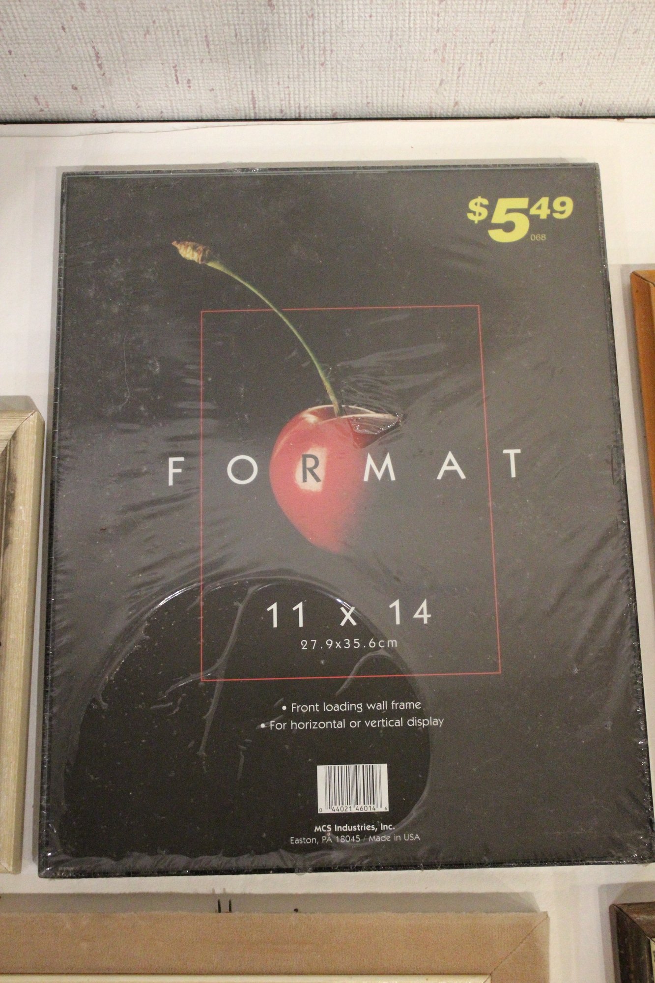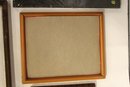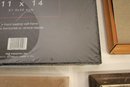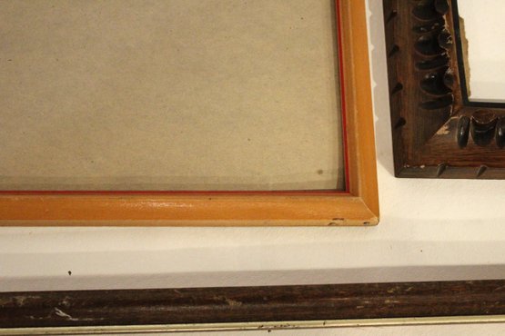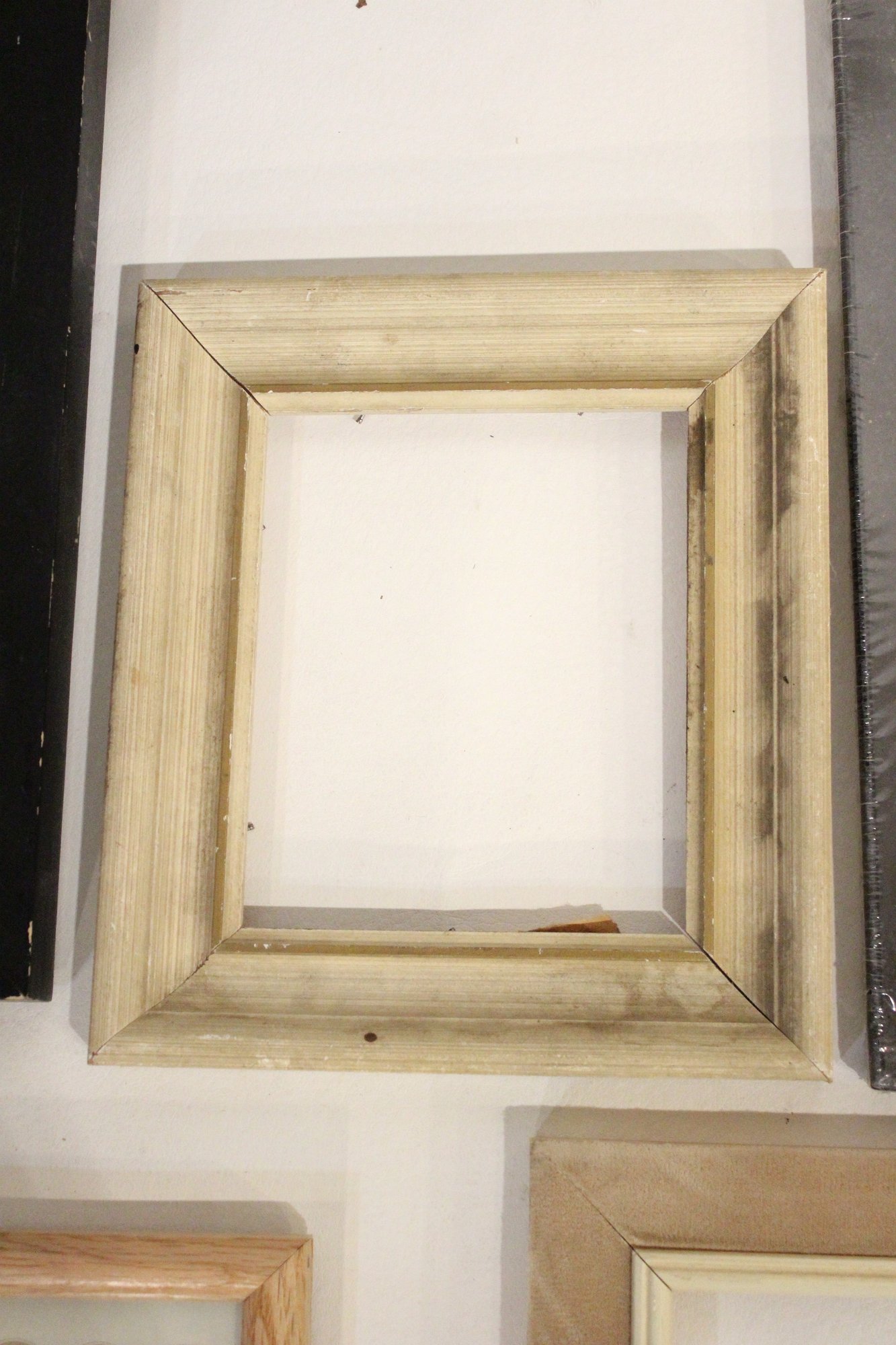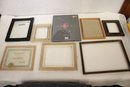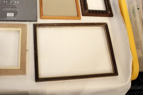 A Melannco wood, black painted and curved frame holds 8" x 10", a wood white painted frame holds 5" x 7" no glass, a minimal black metal frame holds 11" x 14". A wood frame hold 8" x 10", no glass, a small carved wood frame holds 5" x 7", no glass. A light wood document frame holds 9" x 11", an inner fabric frame piece holds 8" x 10", and wood frame holds 15" x 10", is very worn and no glass. These items can be shipped.