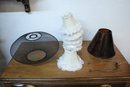 A large round black metal wire lamp shade, 13" x 7", 6 small white floral lamp shades, 6" tall, a rustic brown/orange translucent lamp shade, 8" tall, and a gold toned lamp shade holder. These items can be shipped.