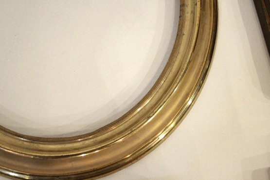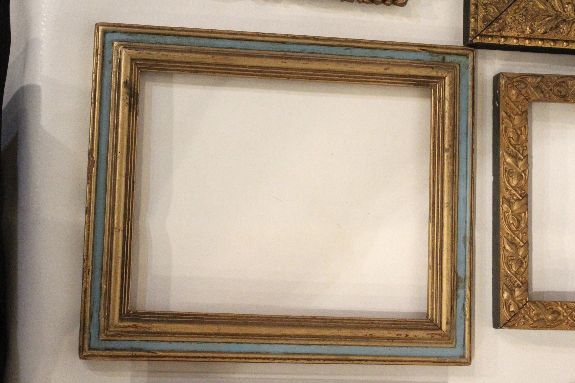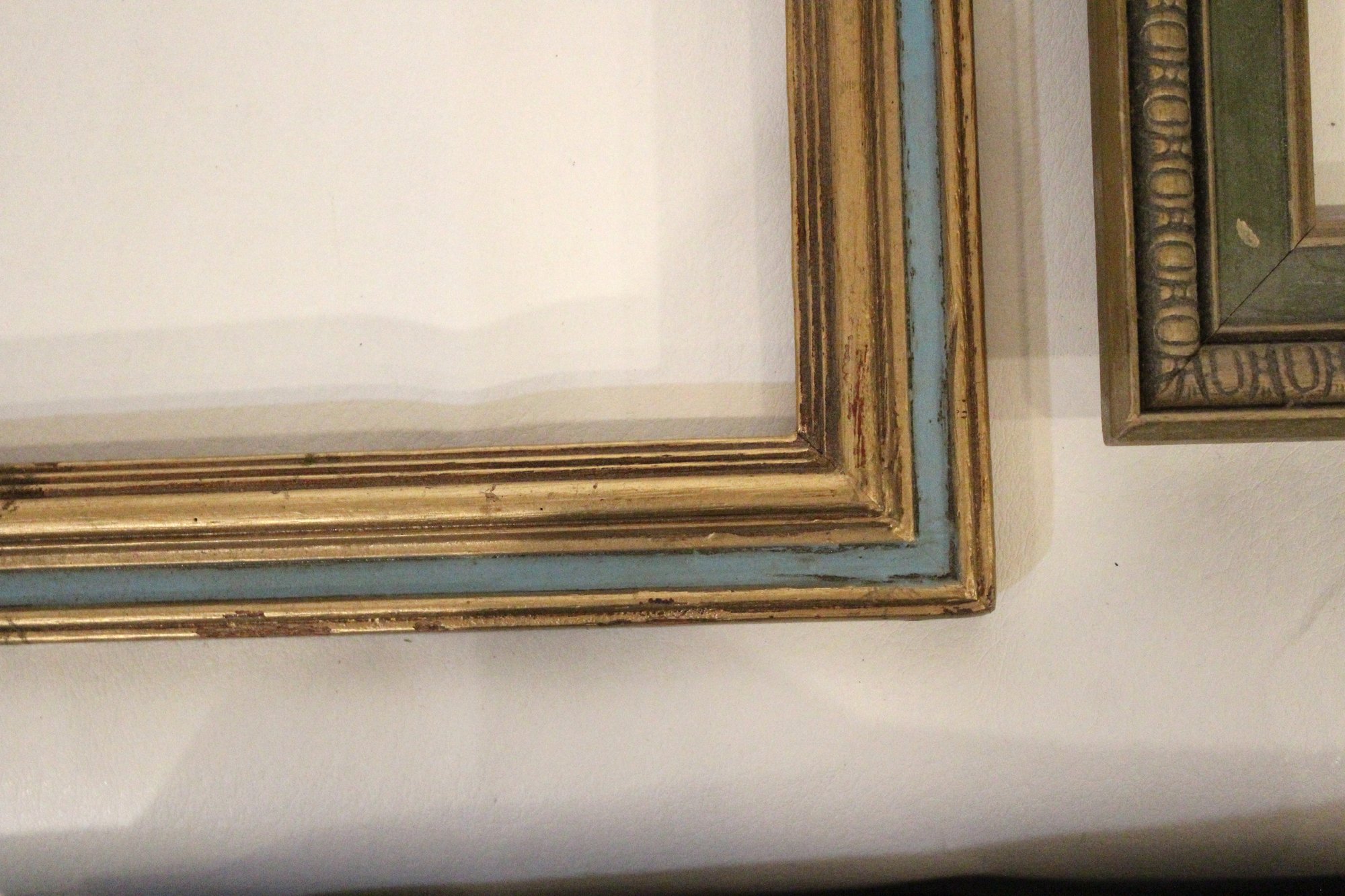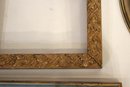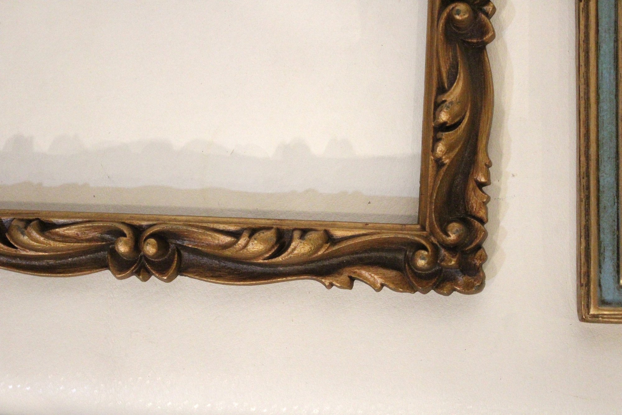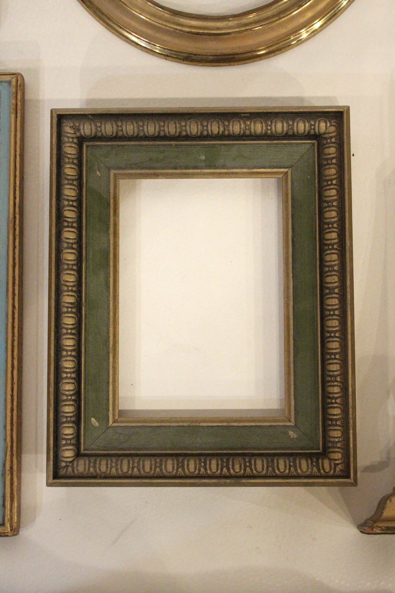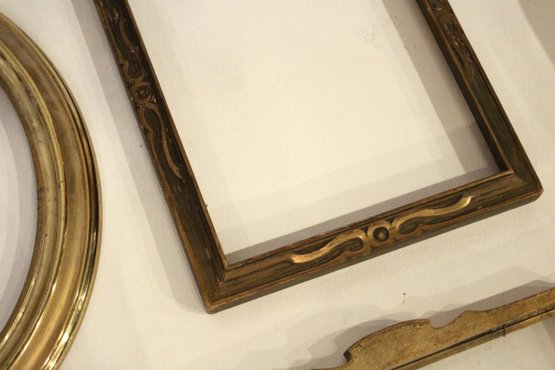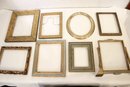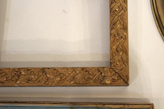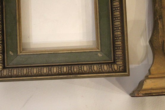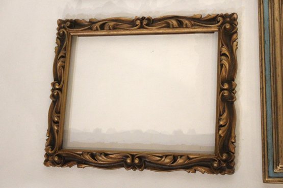 An assortment of vintage gilt gesso wood carved and painted frames. A large ornate gold painted frame, holds 8" x 10", a smaller ornate gold painted frame, holds 8" x 10", a vintage gold toned oval frame, holds 8" x 10". A wood frame with gold painted detailing 7.5" x 9.5", A wood carved and gold painted frame holds 8" x 10", a wood gold and teal painted frame holds 8" x 10". A wood green and gold painted frame holds 5" x 7", and lastly a standing wood gold panted frame with a pice of glass, no back, holds 8" x 10". These frames do not have glass accept for the last standing frame. These items can be shipped.