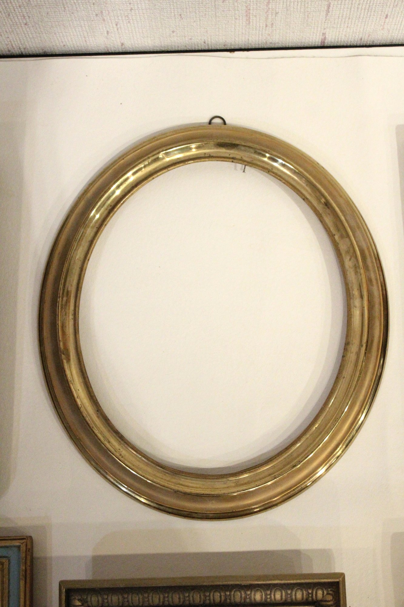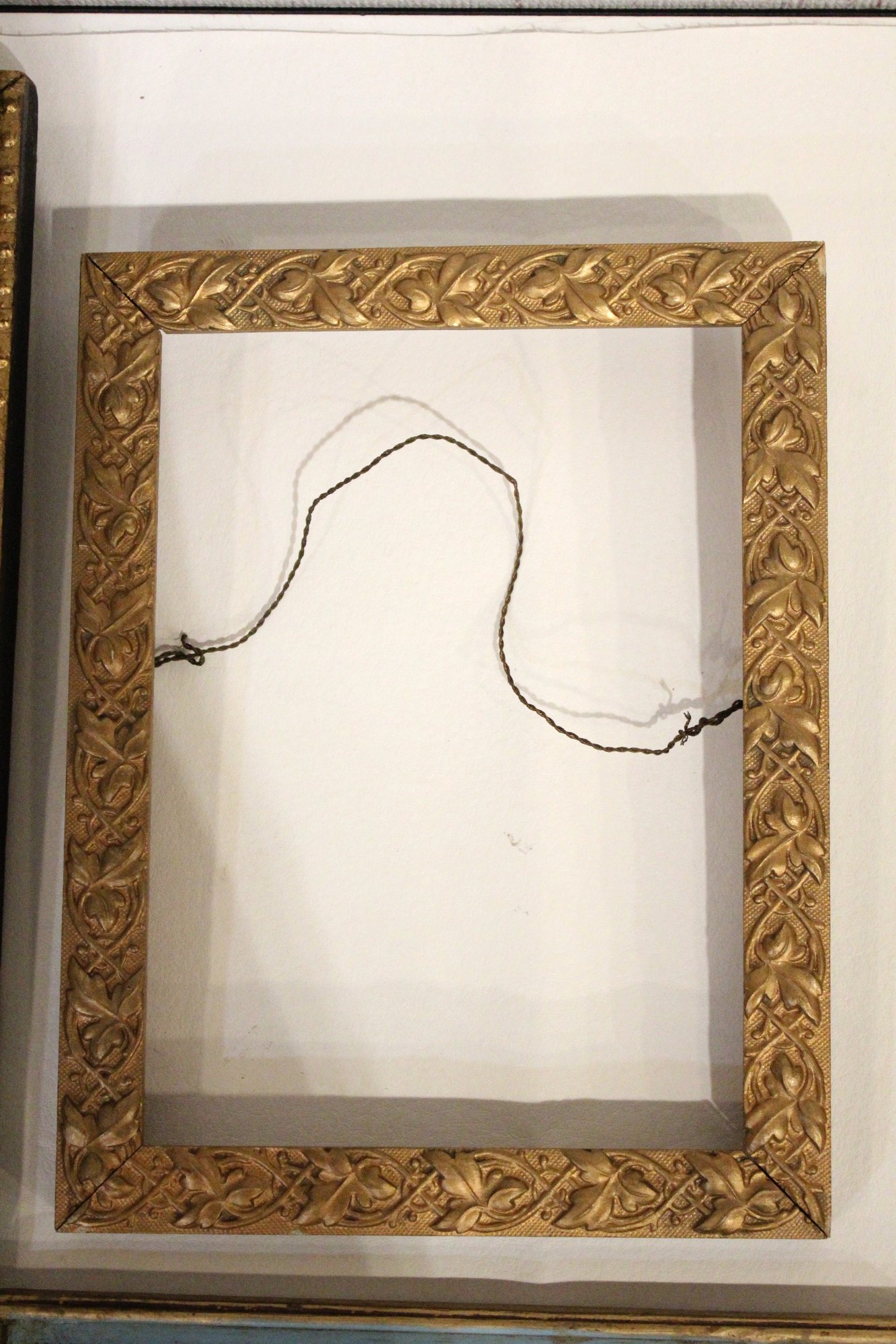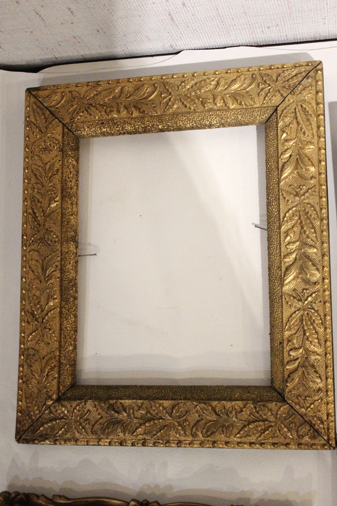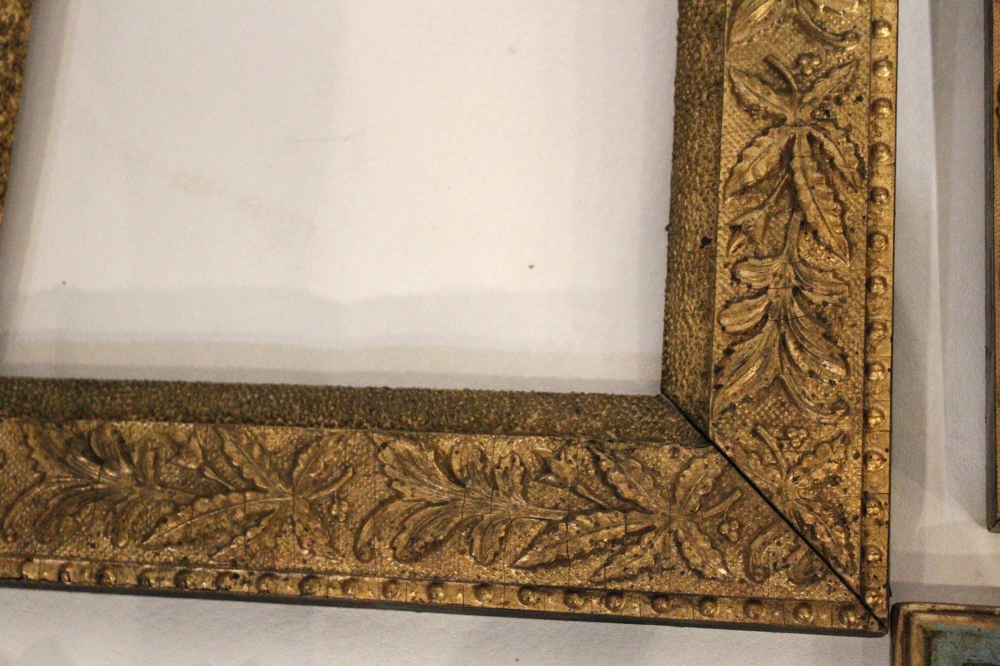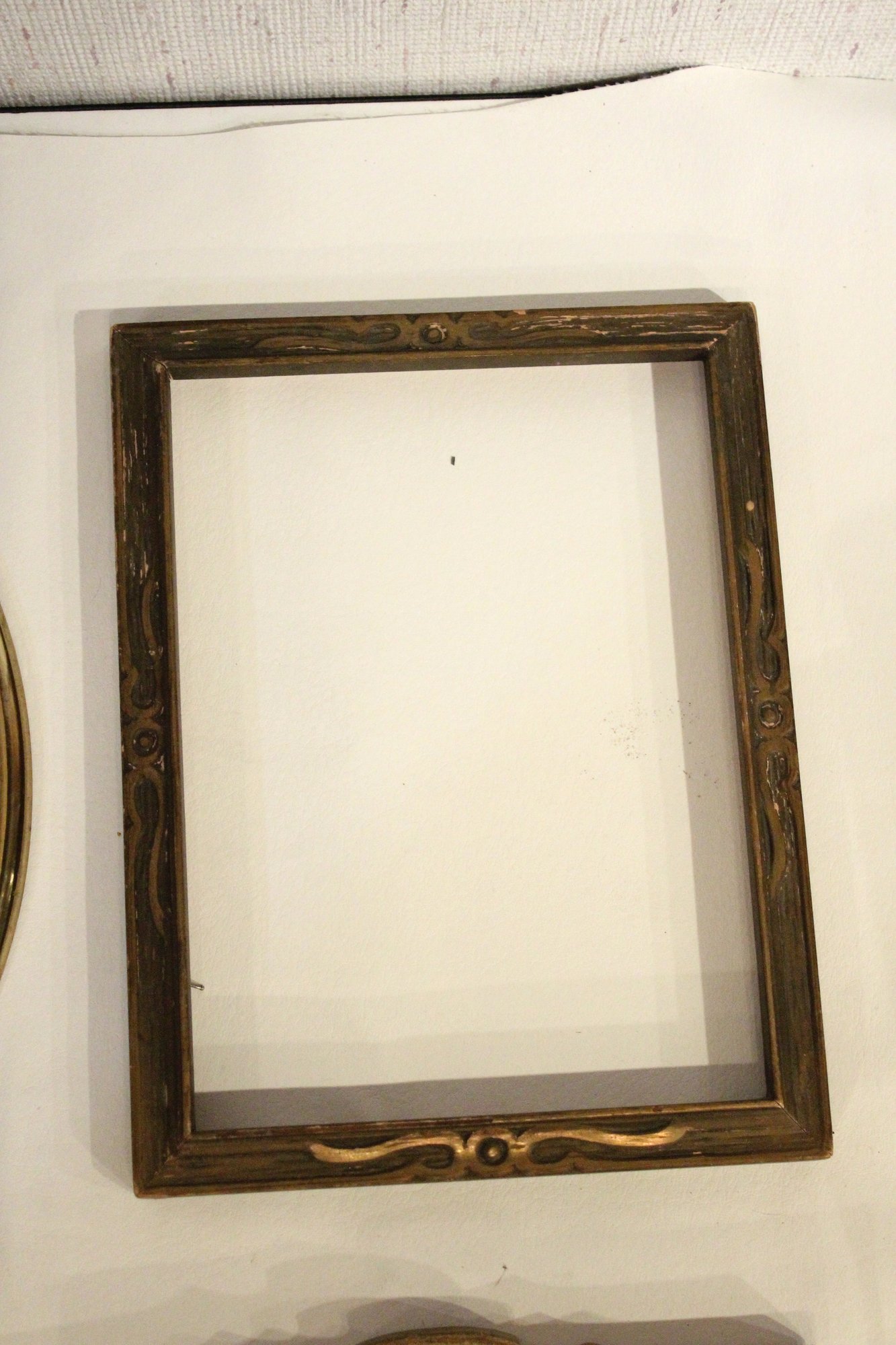 An assortment of vintage gilt gesso wood carved and painted frames. A large ornate gold painted frame, holds 8" x 10", a smaller ornate gold painted frame, holds 8" x 10", a vintage gold toned oval frame, holds 8" x 10". A wood frame with gold painted detailing 7.5" x 9.5", A wood carved and gold painted frame holds 8" x 10", a wood gold and teal painted frame holds 8" x 10". A wood green and gold painted frame holds 5" x 7", and lastly a standing wood gold panted frame with a pice of glass, no back, holds 8" x 10". These frames do not have glass accept for the last standing frame. These items can be shipped.