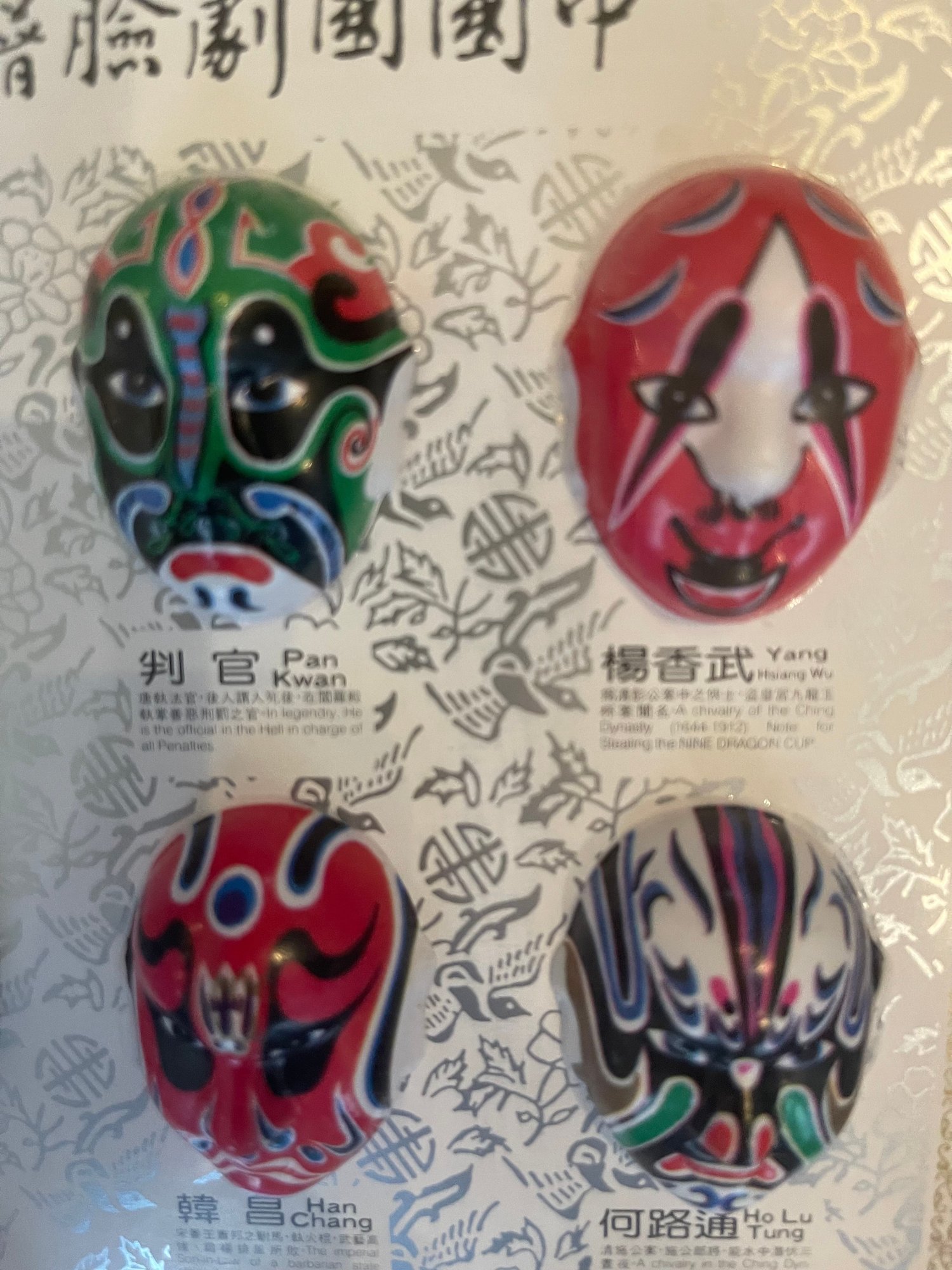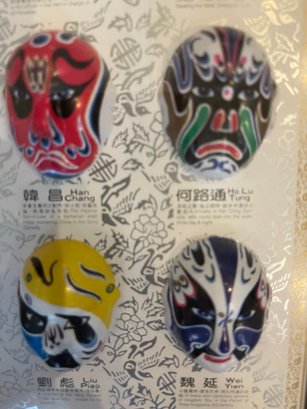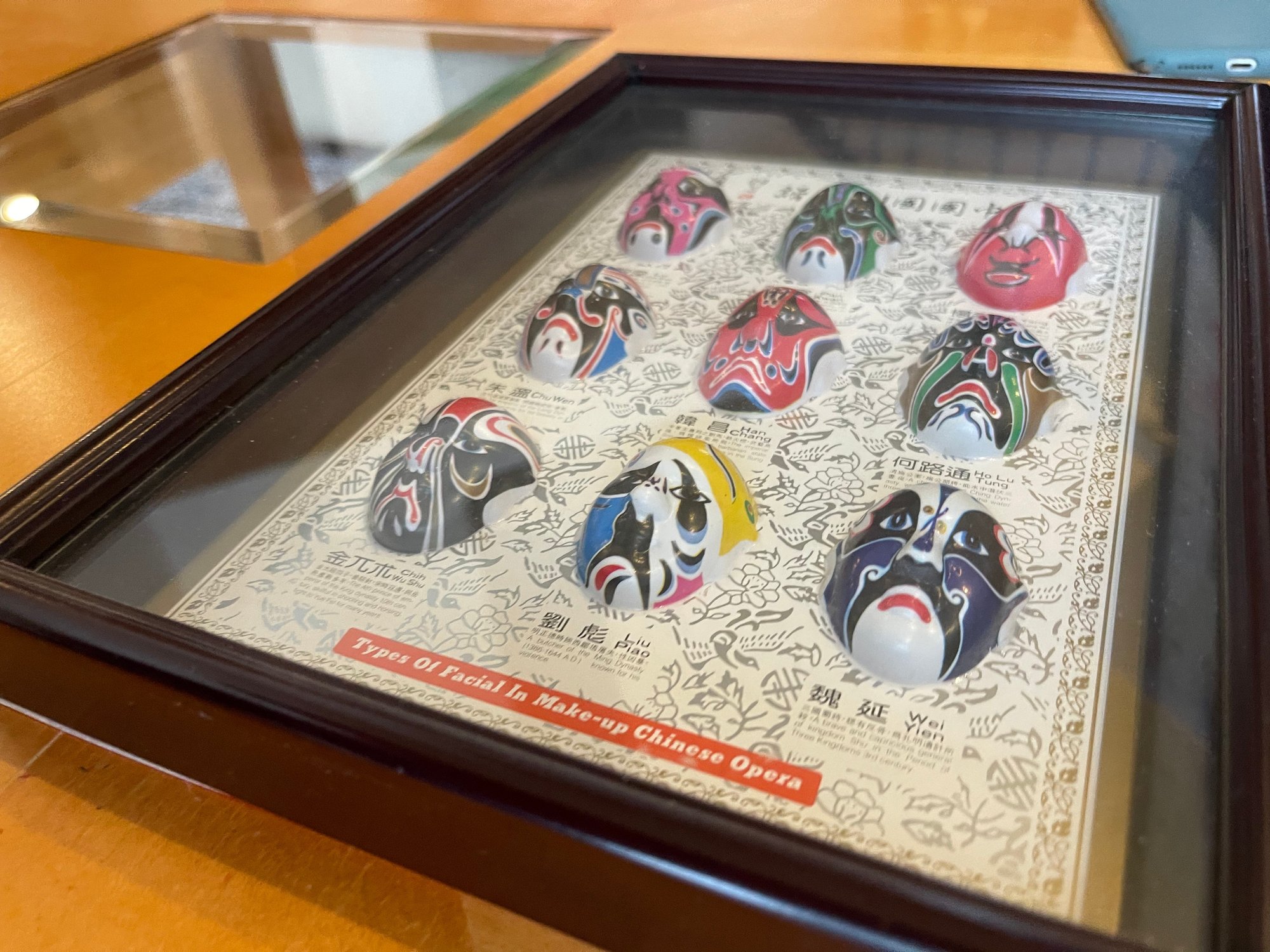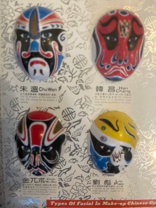 9 masks, 1.75 inches high each, nicely framed in a black frame with glass. 11.5 x 8.5 frame.