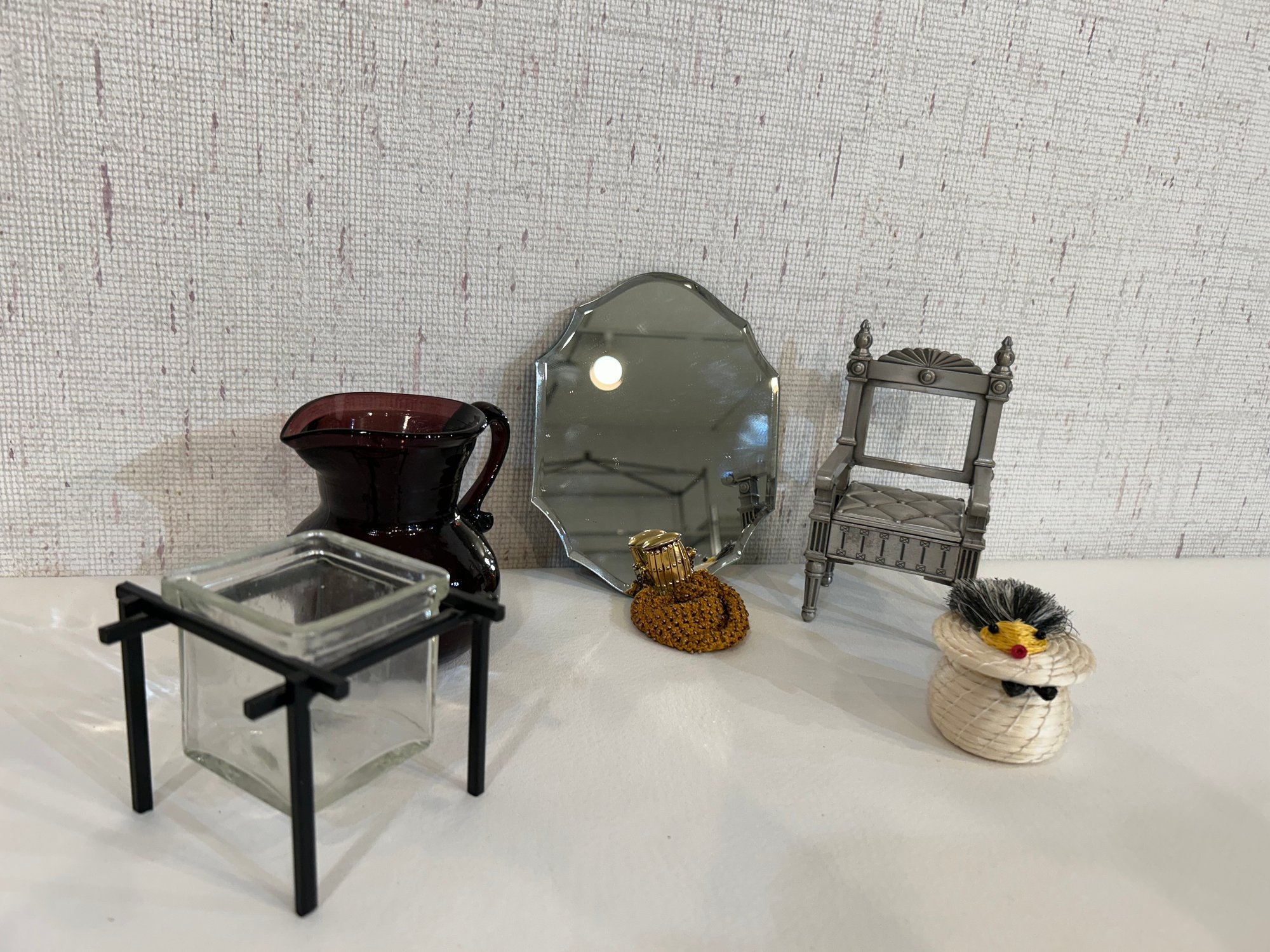 6 small, fun decor items including a mirror, candle holder, trinket boxes and a purple pitcher