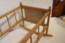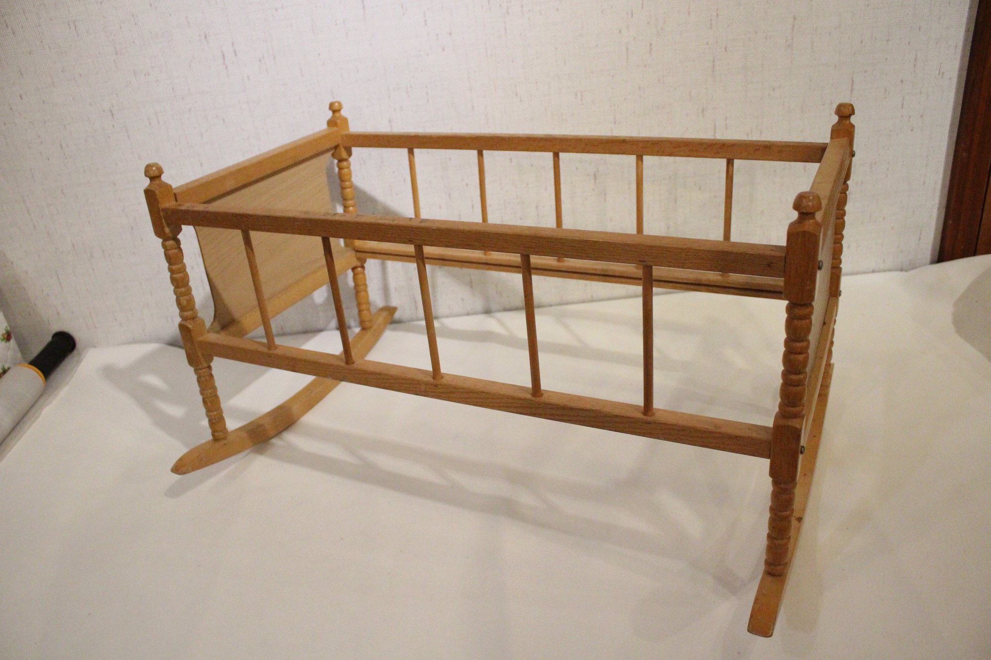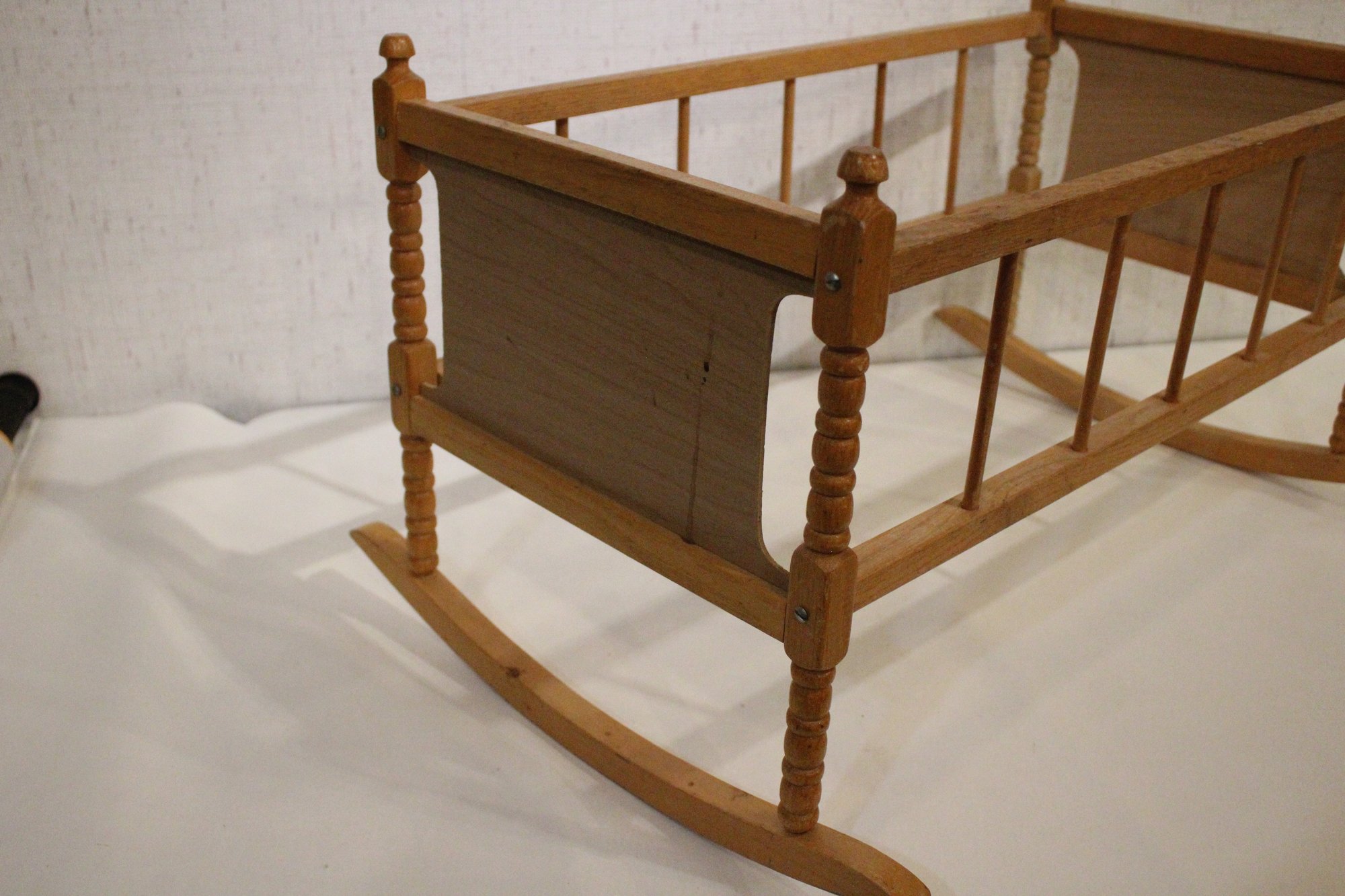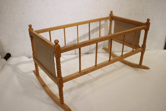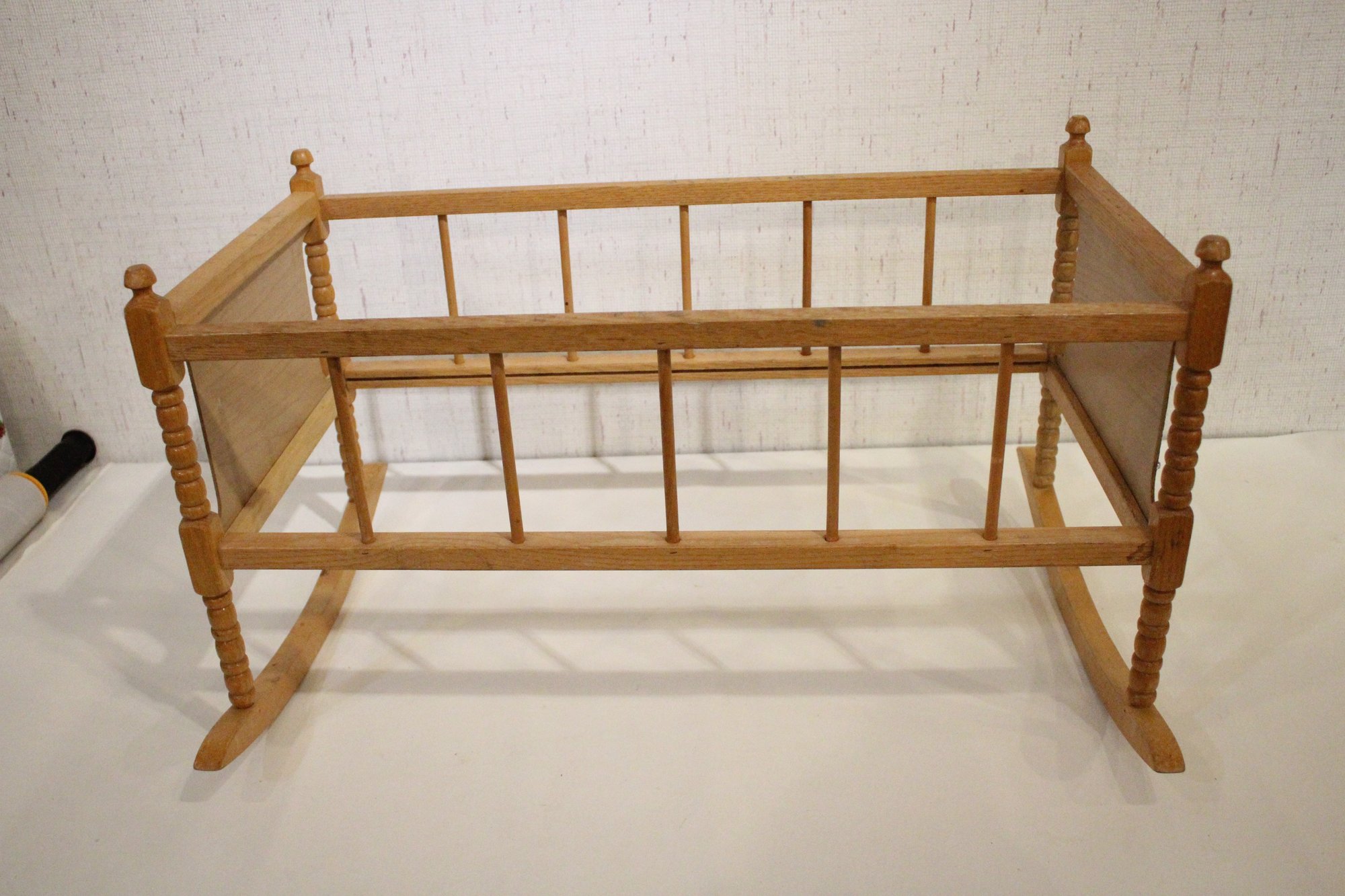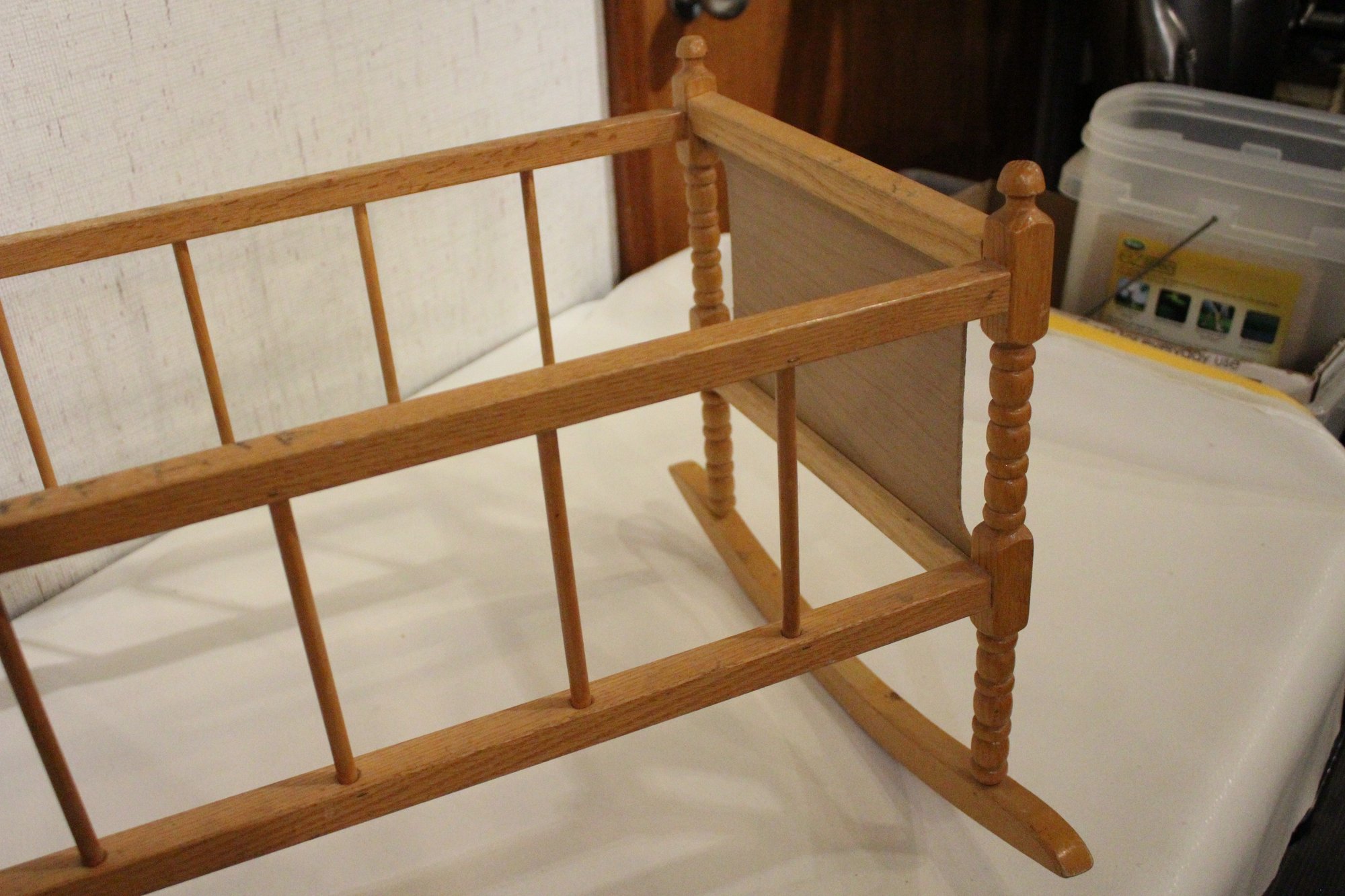 A vintage wooden rocking baby doll crib, 23" x 13" x 18". This item can be shipped.