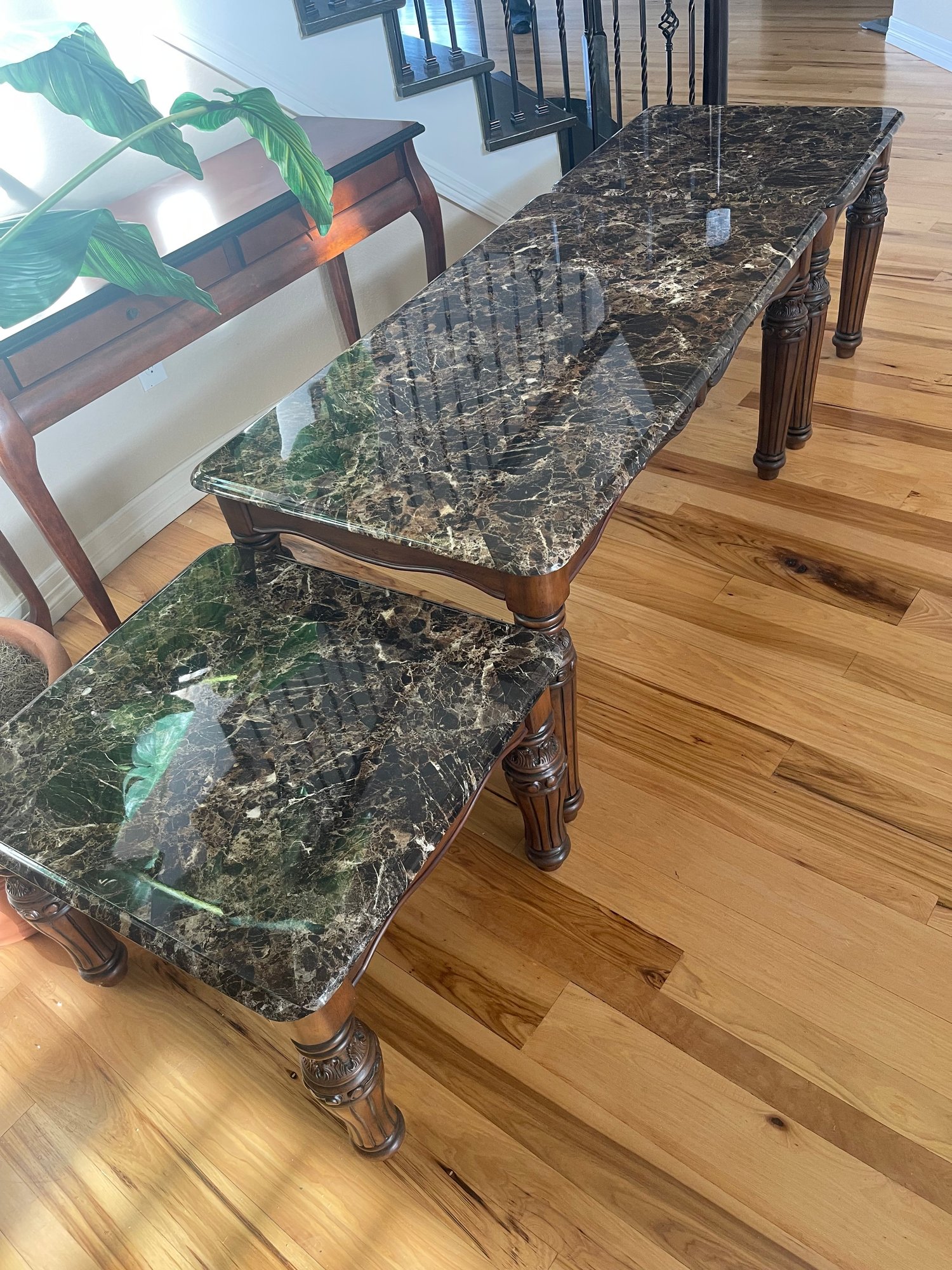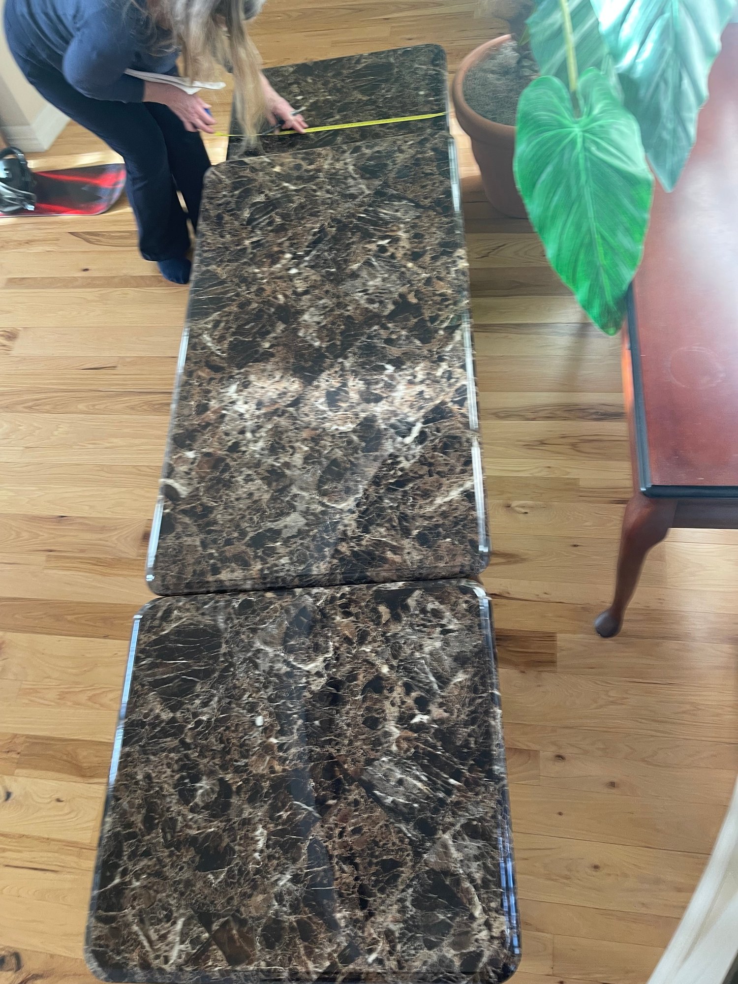 This is the largest, long rectangular table in the photo. 24 high x 26.5 d x 47 inches wide Not eligible for shipping