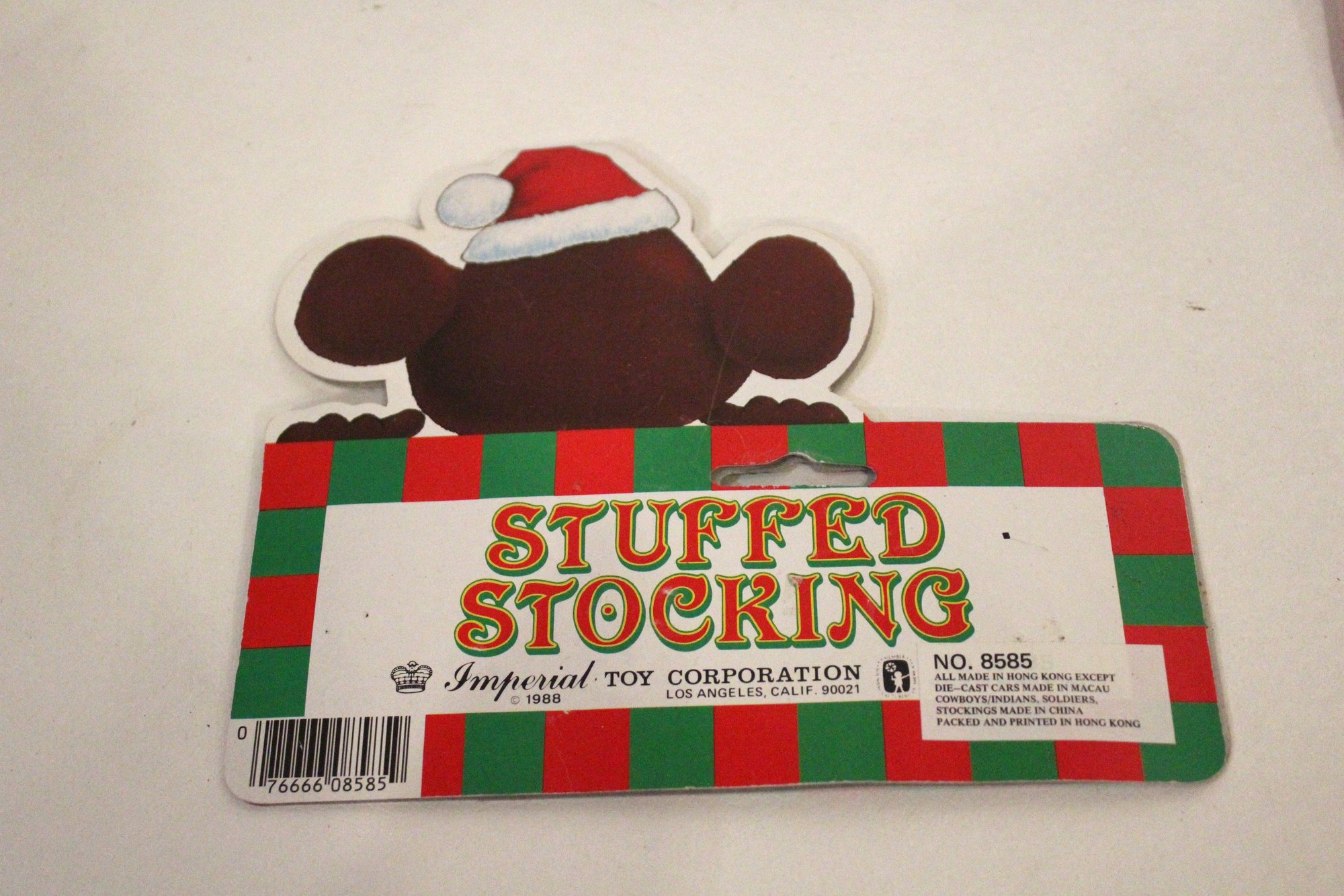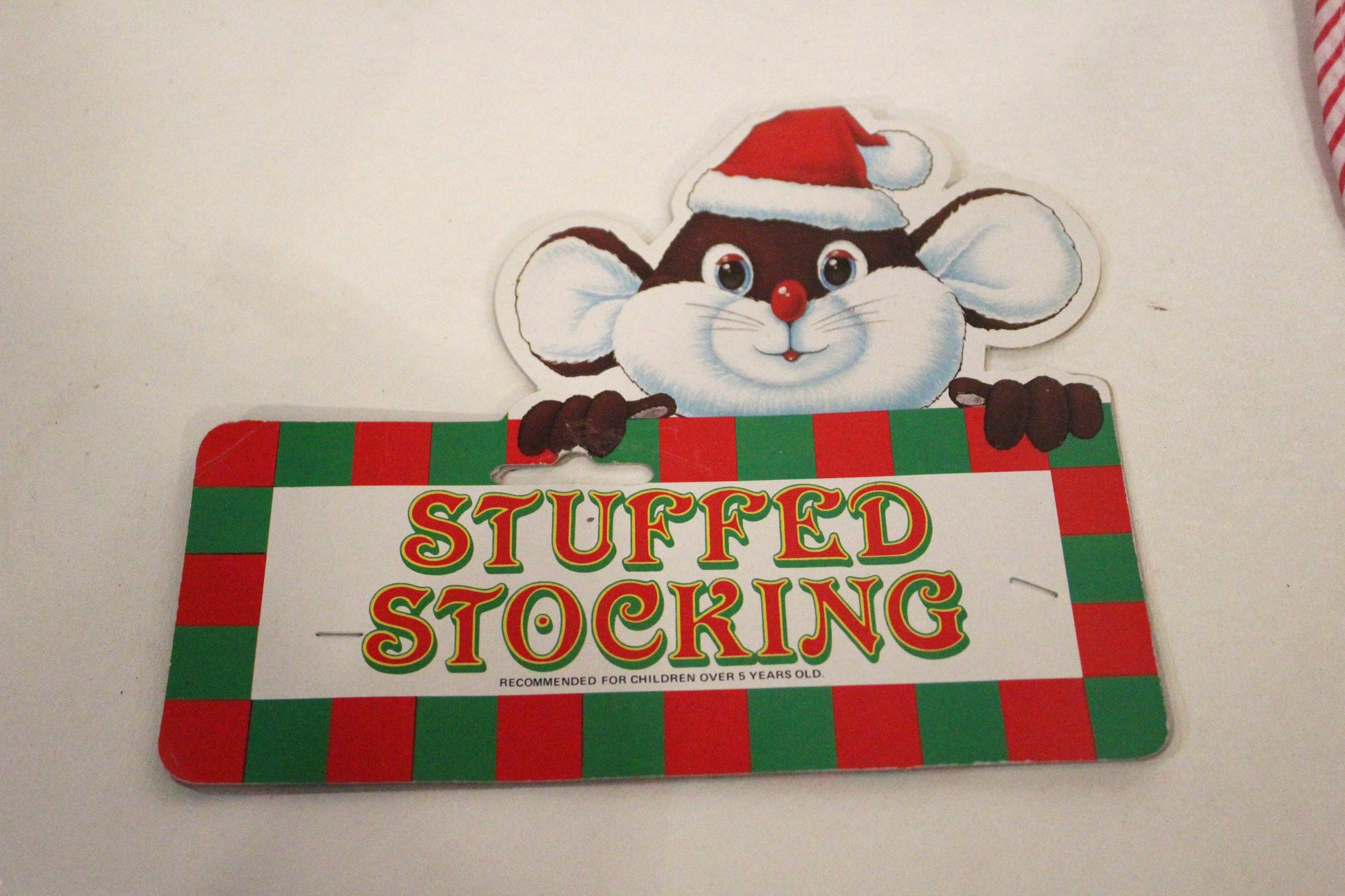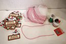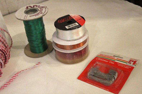 A pack of "Stuffed Stocking" cards, 8" x 6", a pack of thin Christmas stockings 11" x 18", and 4 used spindles of ribbon, and a pack of Christmas ornament hooks. These items can be shipped.