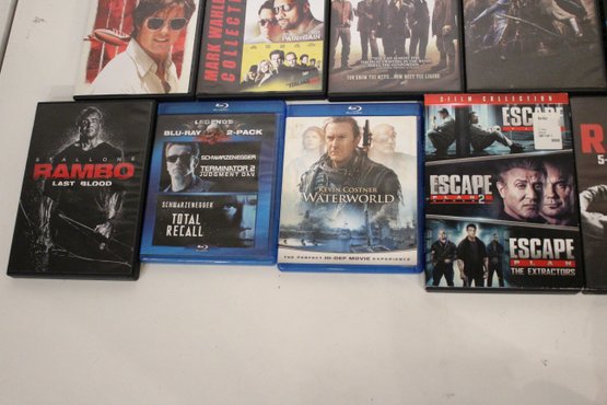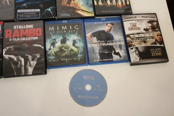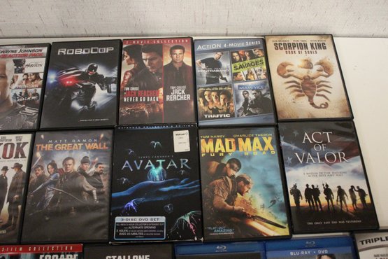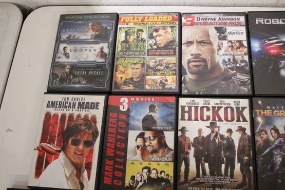 An action-packed DVD and Blu-ray movie lot featuring popular blockbusters, military films, sci-fi, and crime thrillers starring Dwayne Johnson, Tom Cruise, Sylvester Stallone, Matt Damon, and more. Some of the multi-pack movies are missing their discs. These items can be shipped.