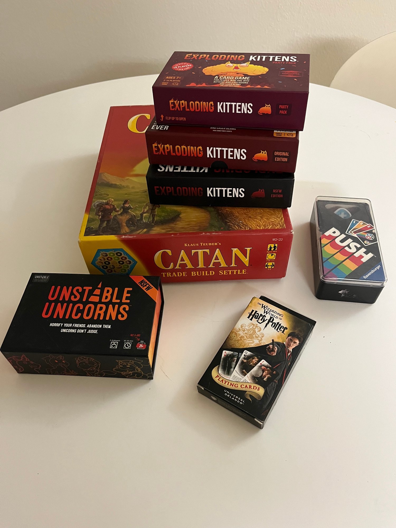 7 board games/cards including; Catan, Unstable Unicorns, Exploding Kittens; Original Addition, Party Pack, and NFSW Edition, Push and Harry Potter cards. These items can be shipped.
