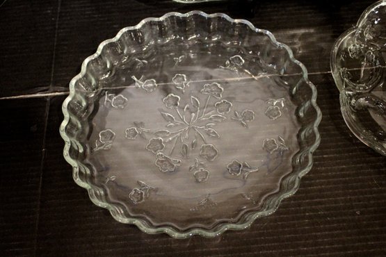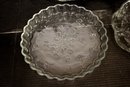 Anchor Hocking Savannah 10" clear glass quiche or tart pan featuring an embossed floral pattern and fluted edges.