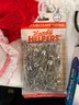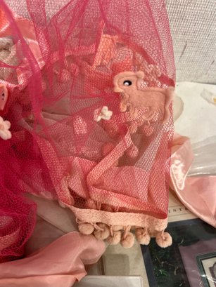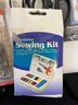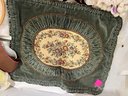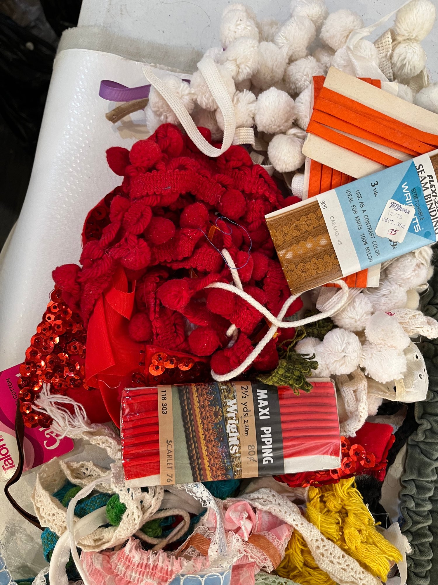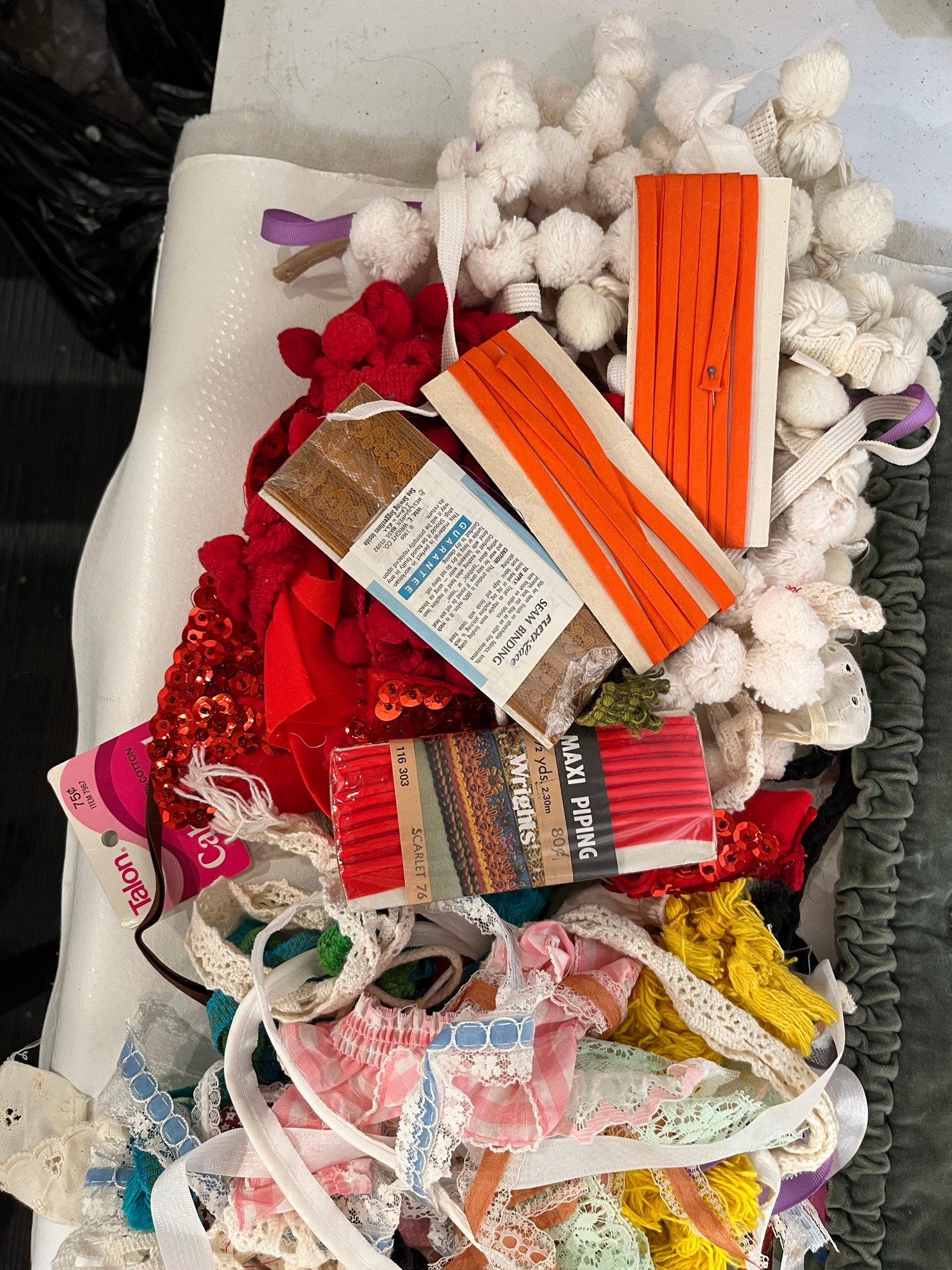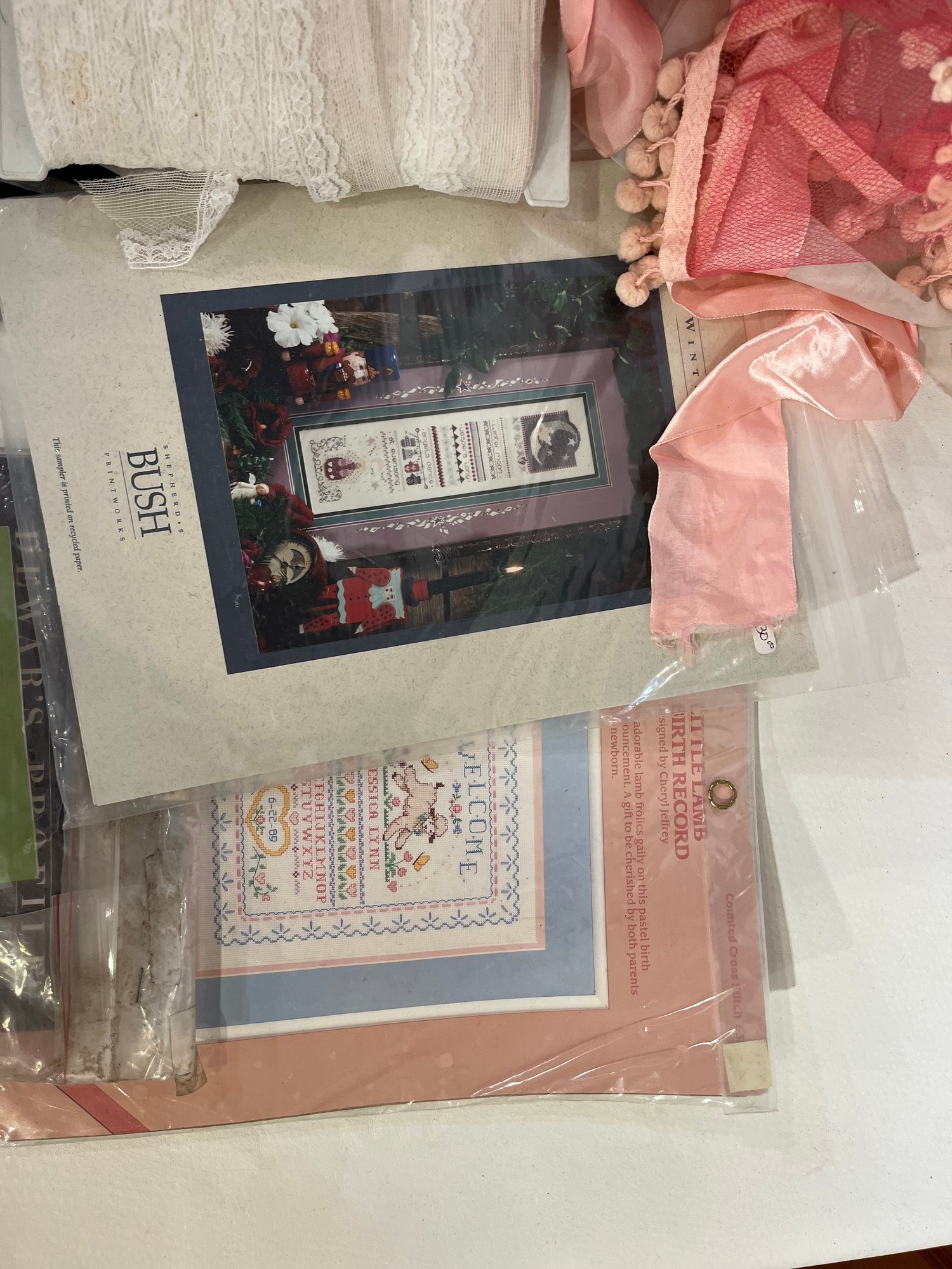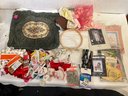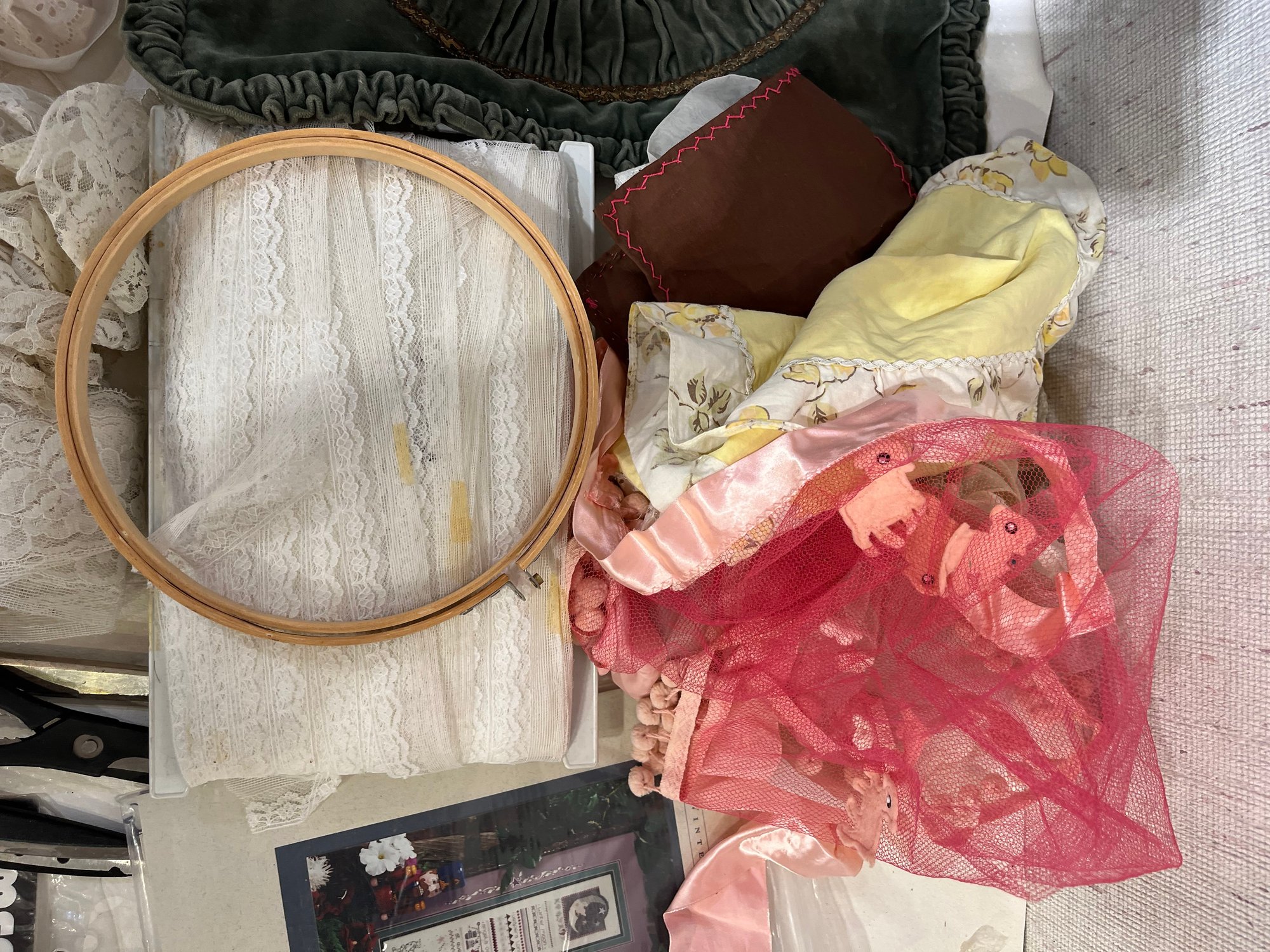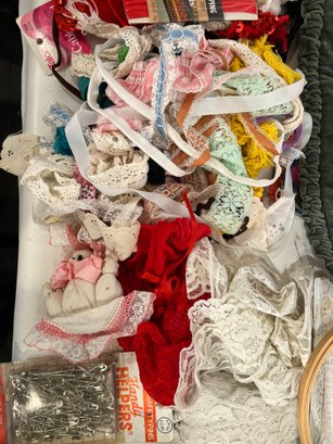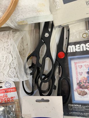 A large lot of sewing supplies including trim, safety pins, scissors, cross stitch supplies, and green pillow case sized pieces of green fabric. These items can be shipped.
