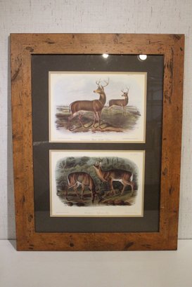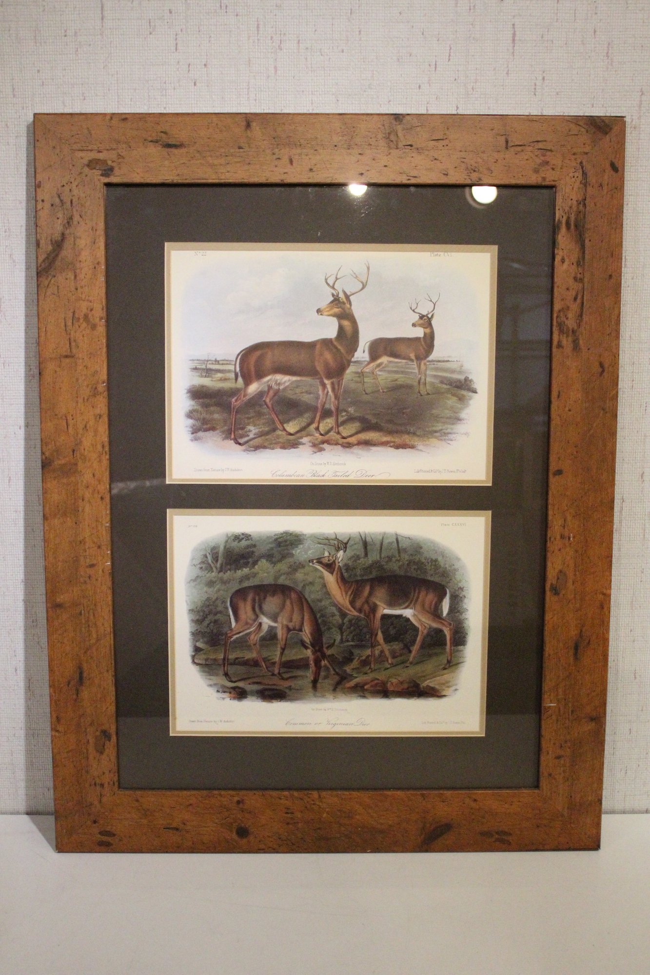 An antique framed John James Audubon Columbian Black-tailed Deer lithograph from The Viviparous Quadrupeds of North America series, produced by J.T. Bowen between 1845 and 1848. The frame is a thick 3" wood frame that holds 20" x 27.5" images, with the 2 smaller sizes at 13" x 9.75". This item can not be shipped.