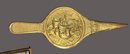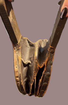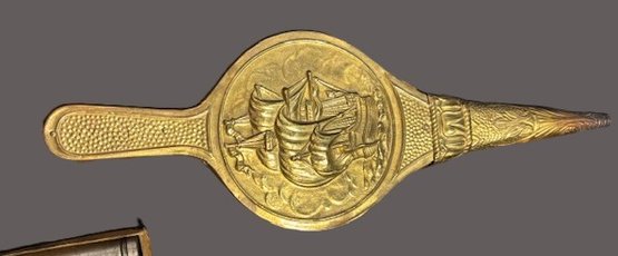 Antique brass fireplace bellows with colonial carving, with leather in flaps.