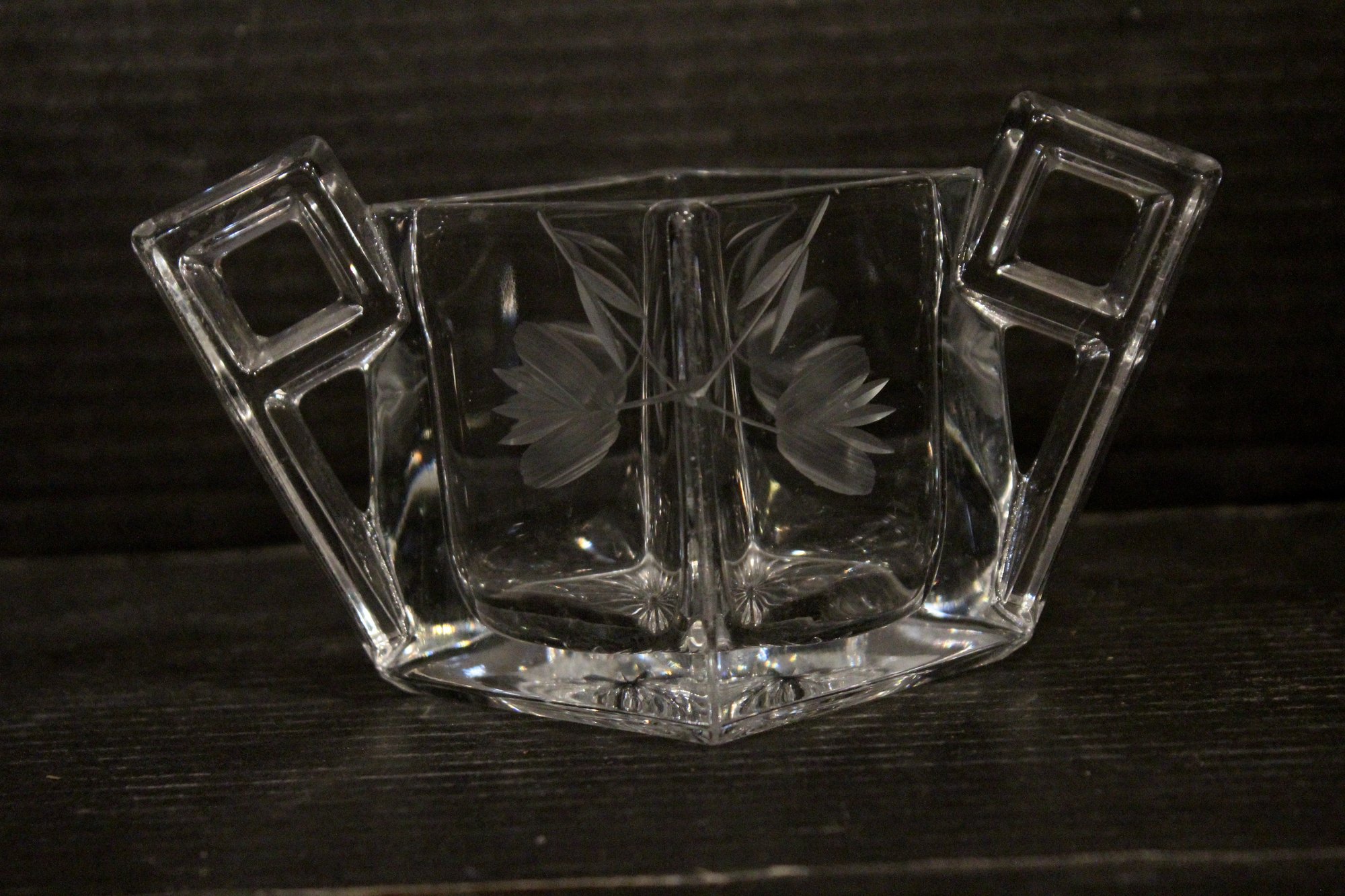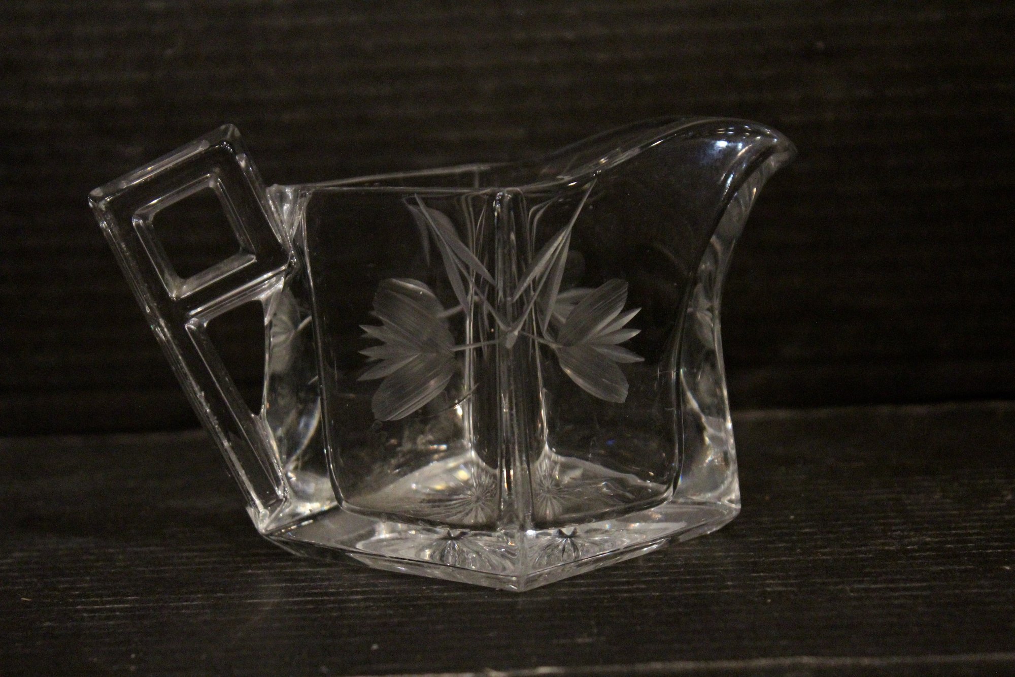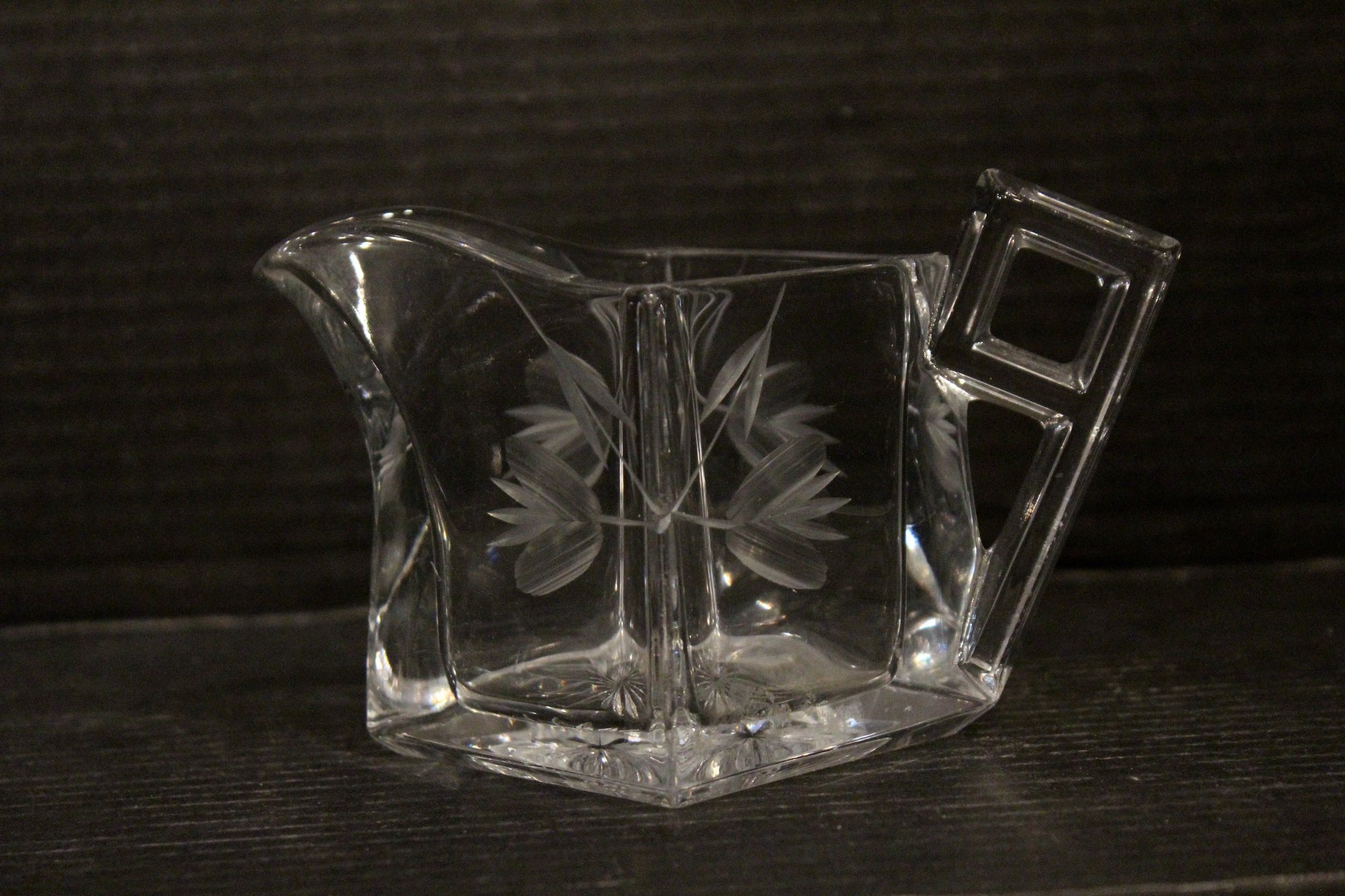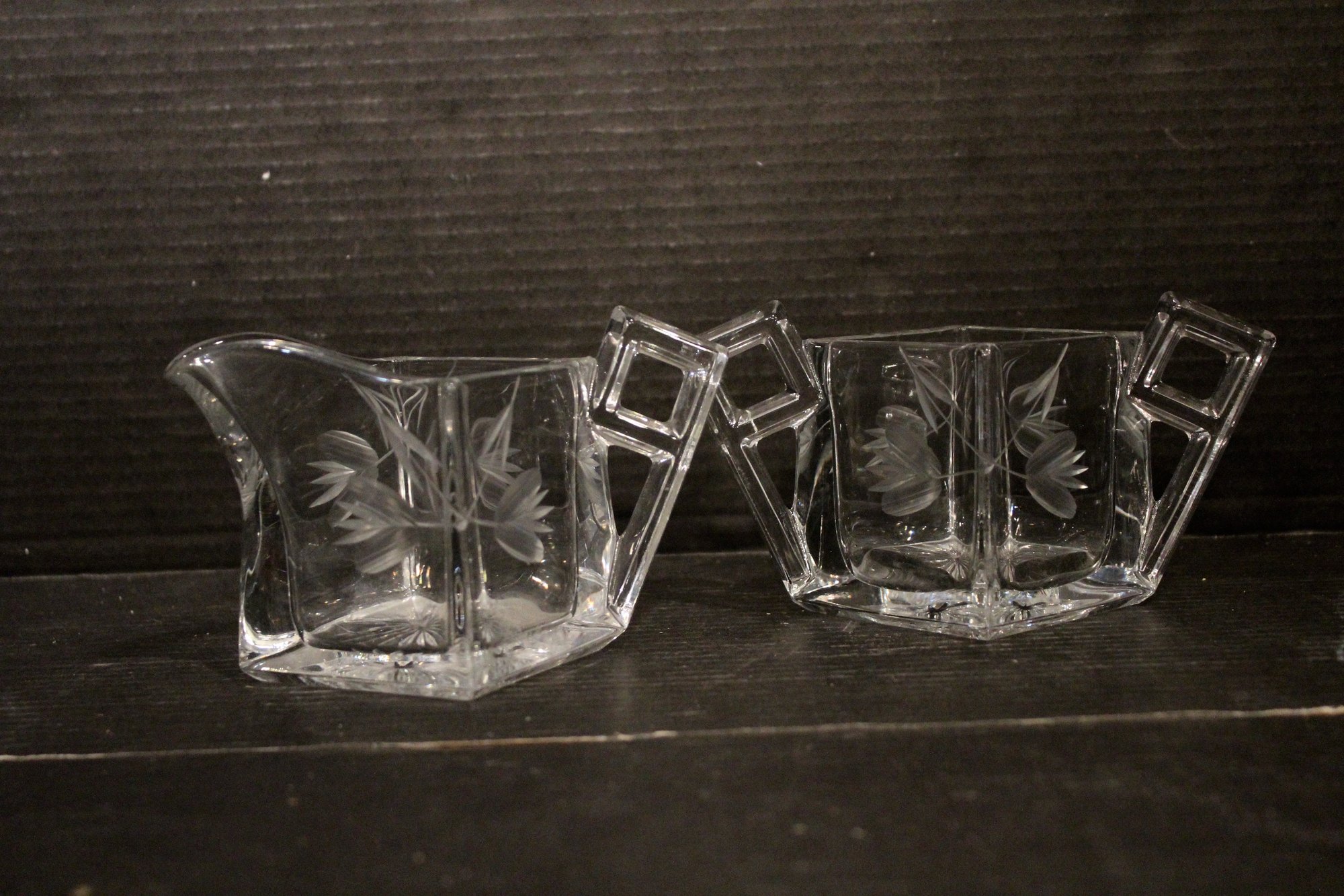antique Heisey "Quator pattern" Art Deco etched glass creamer and sugar set 4" x 6"