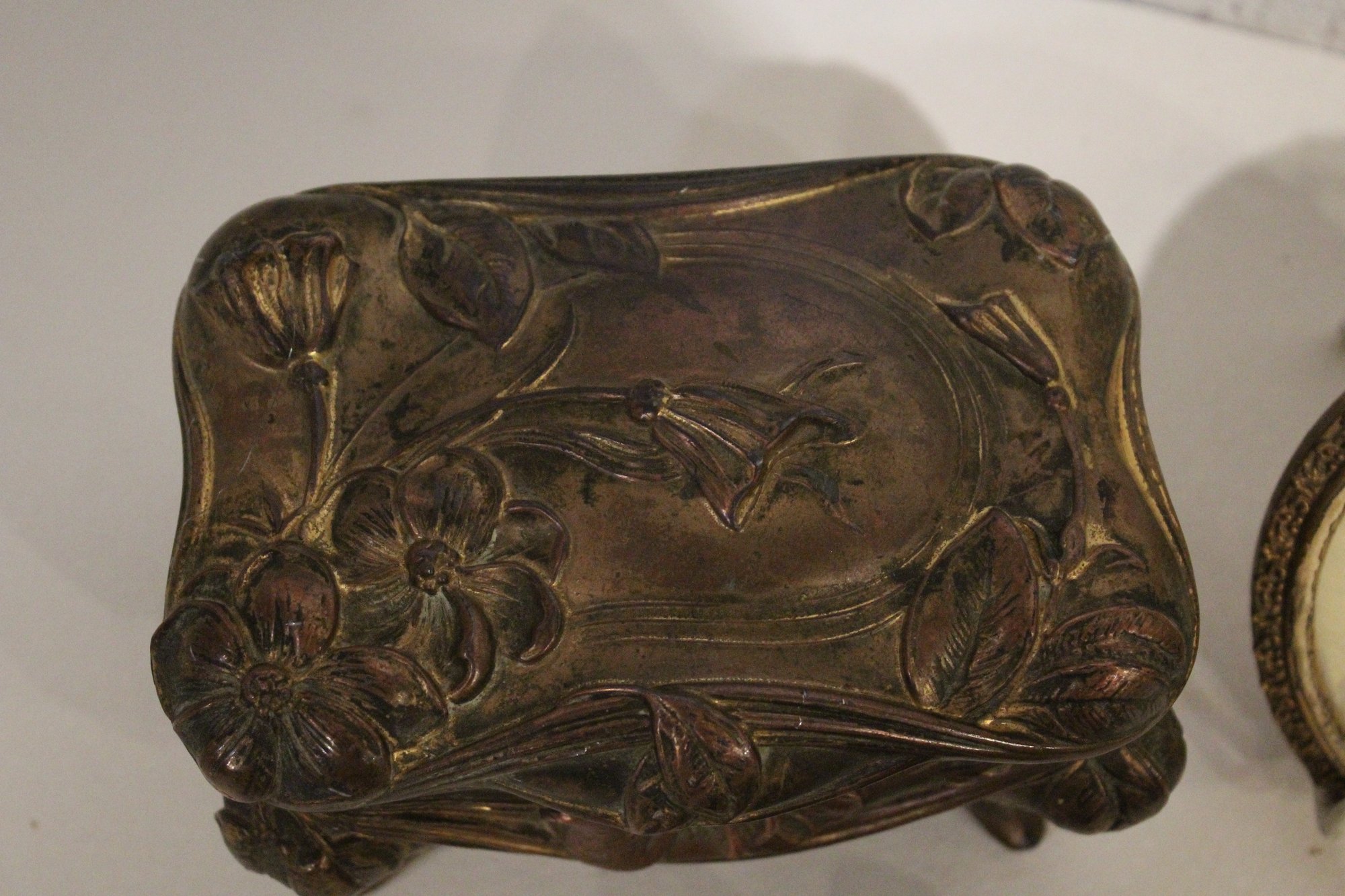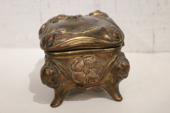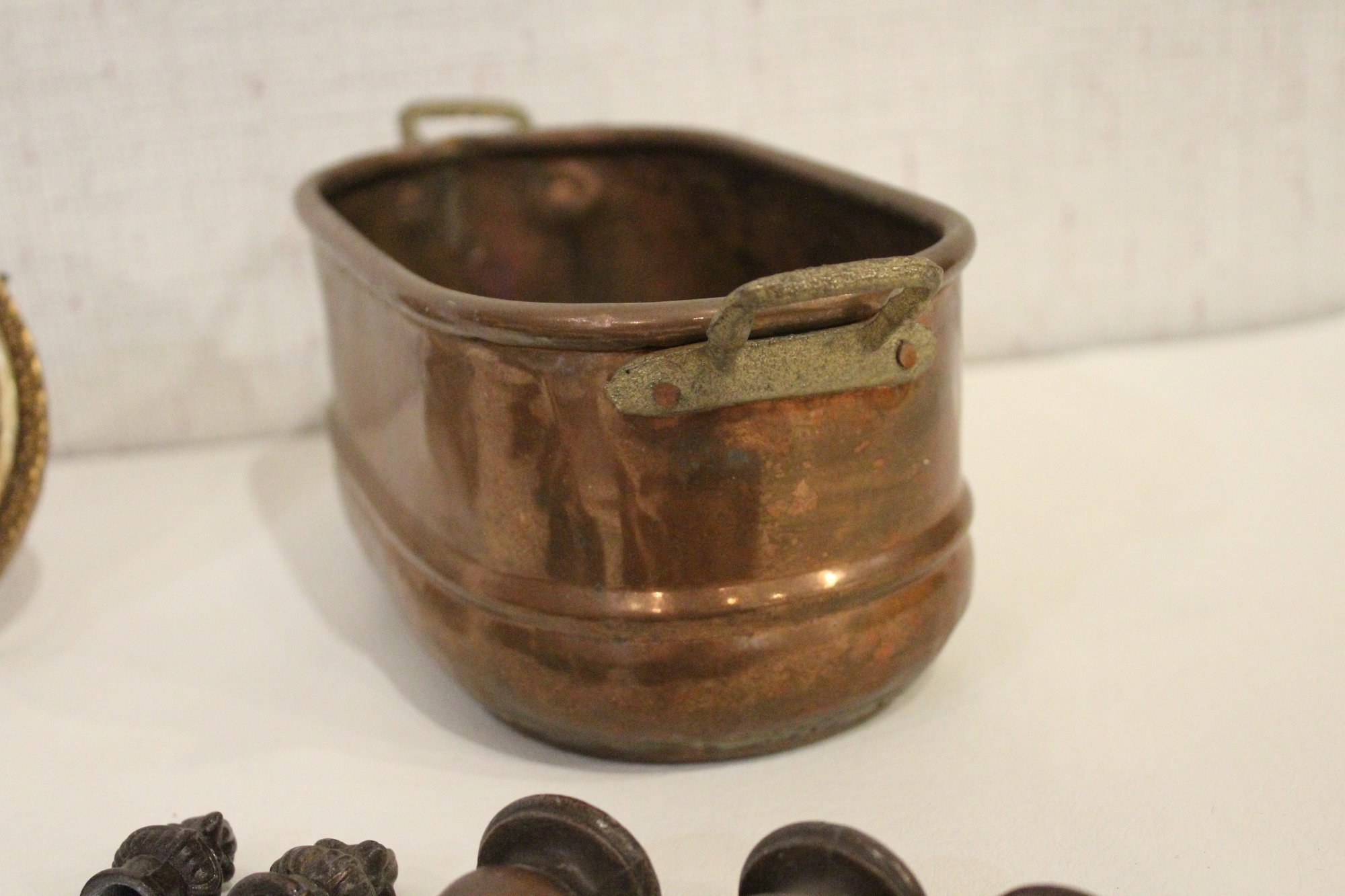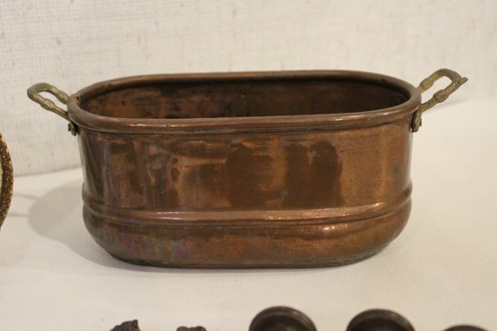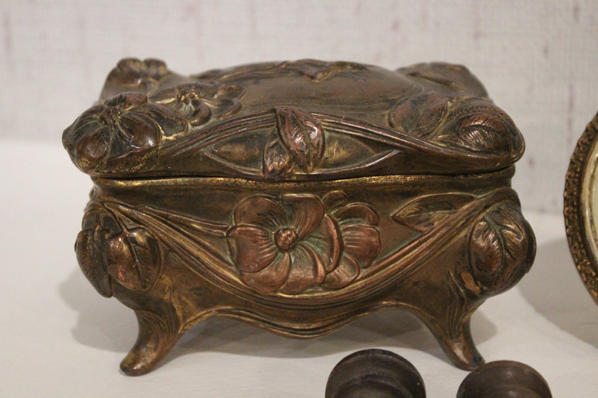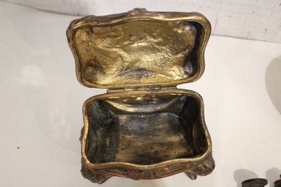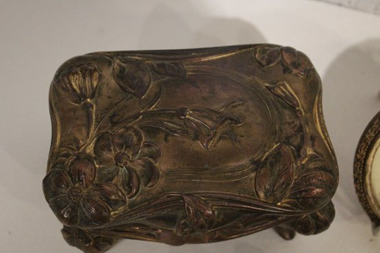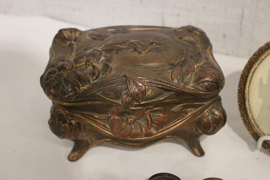 An antique Art Nouveau metal jewelry casket or trinket box 6" x 4" x 4", a round vintage frame 4.5", and an antique oval copper planter with brass handles 9" x 4.5" x 4". Lastly some antique metal finials. These items can be shipped