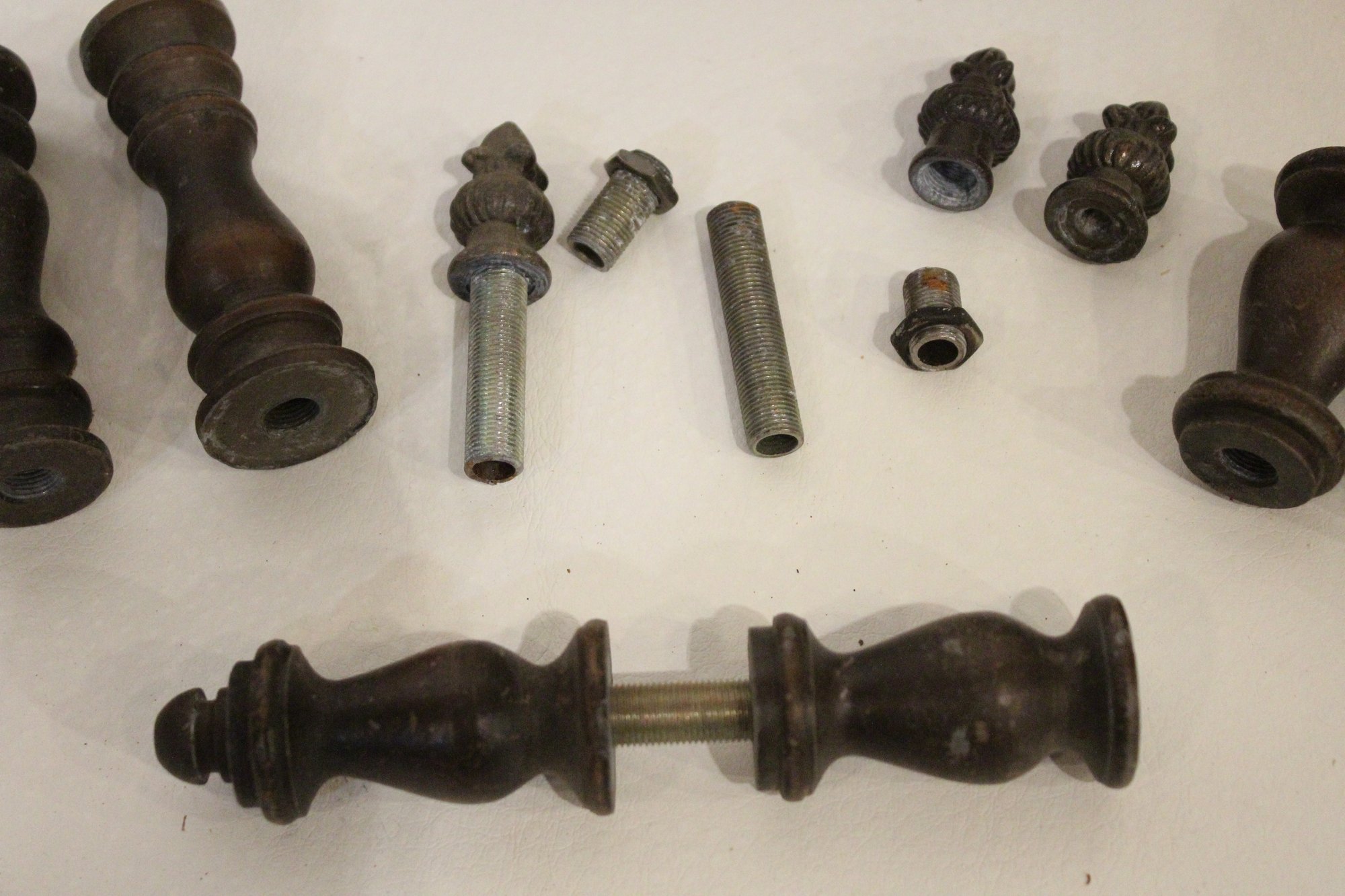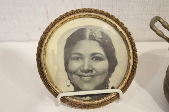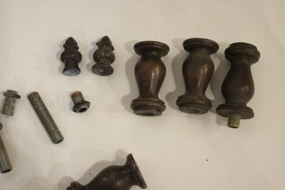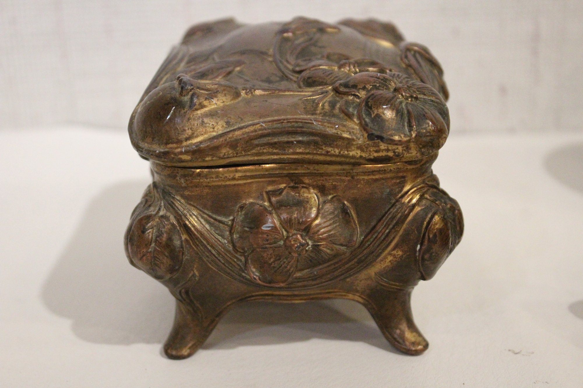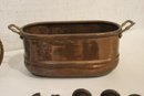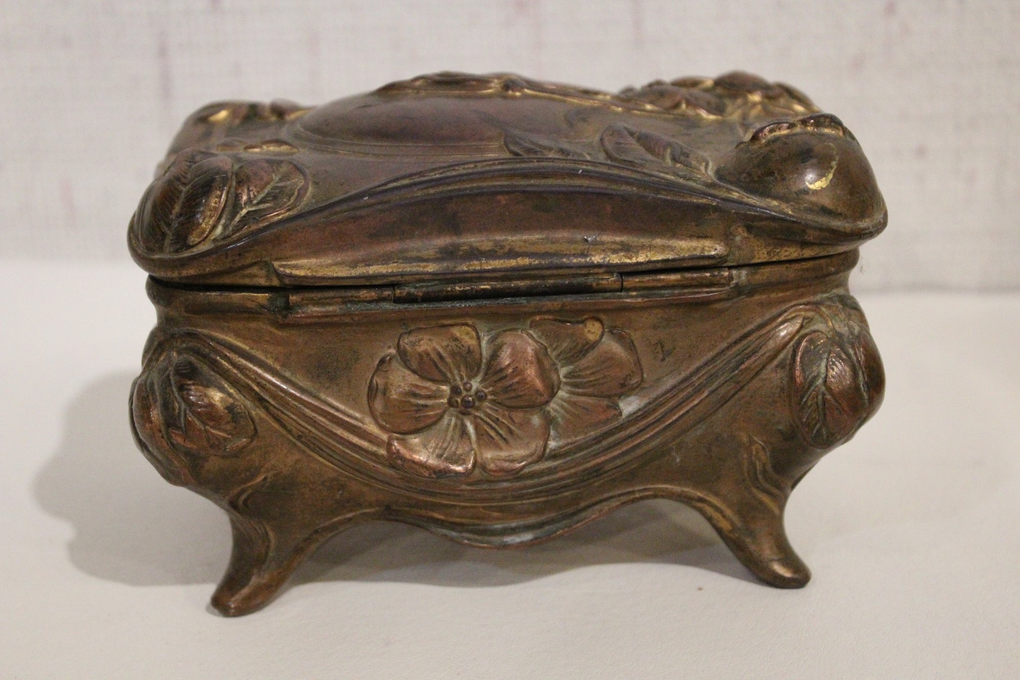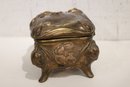 An antique Art Nouveau metal jewelry casket or trinket box 6" x 4" x 4", a round vintage frame 4.5", and an antique oval copper planter with brass handles 9" x 4.5" x 4". Lastly some antique metal finials. These items can be shipped