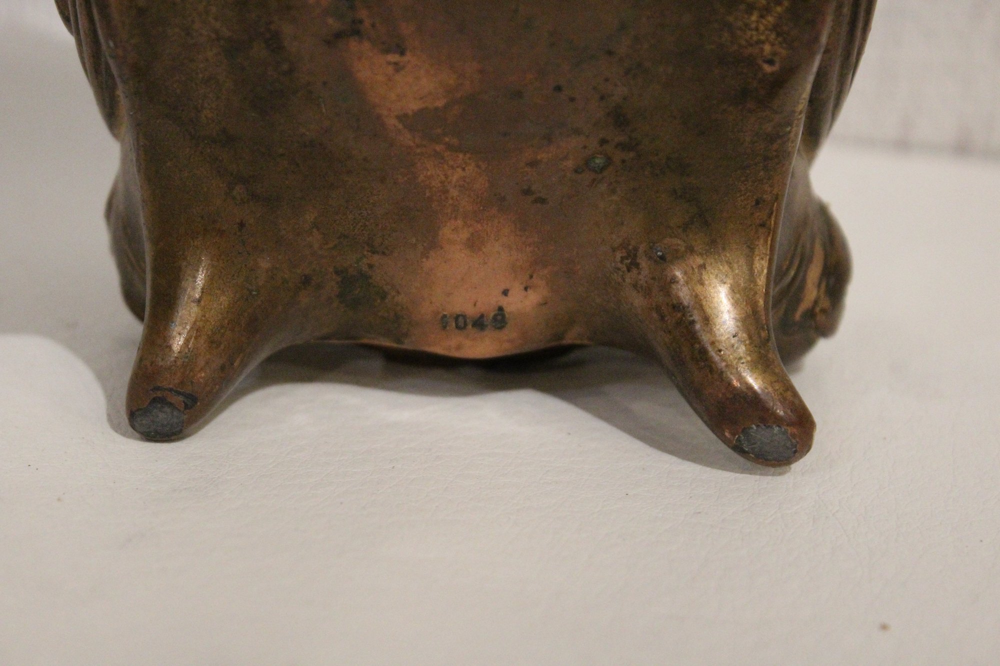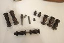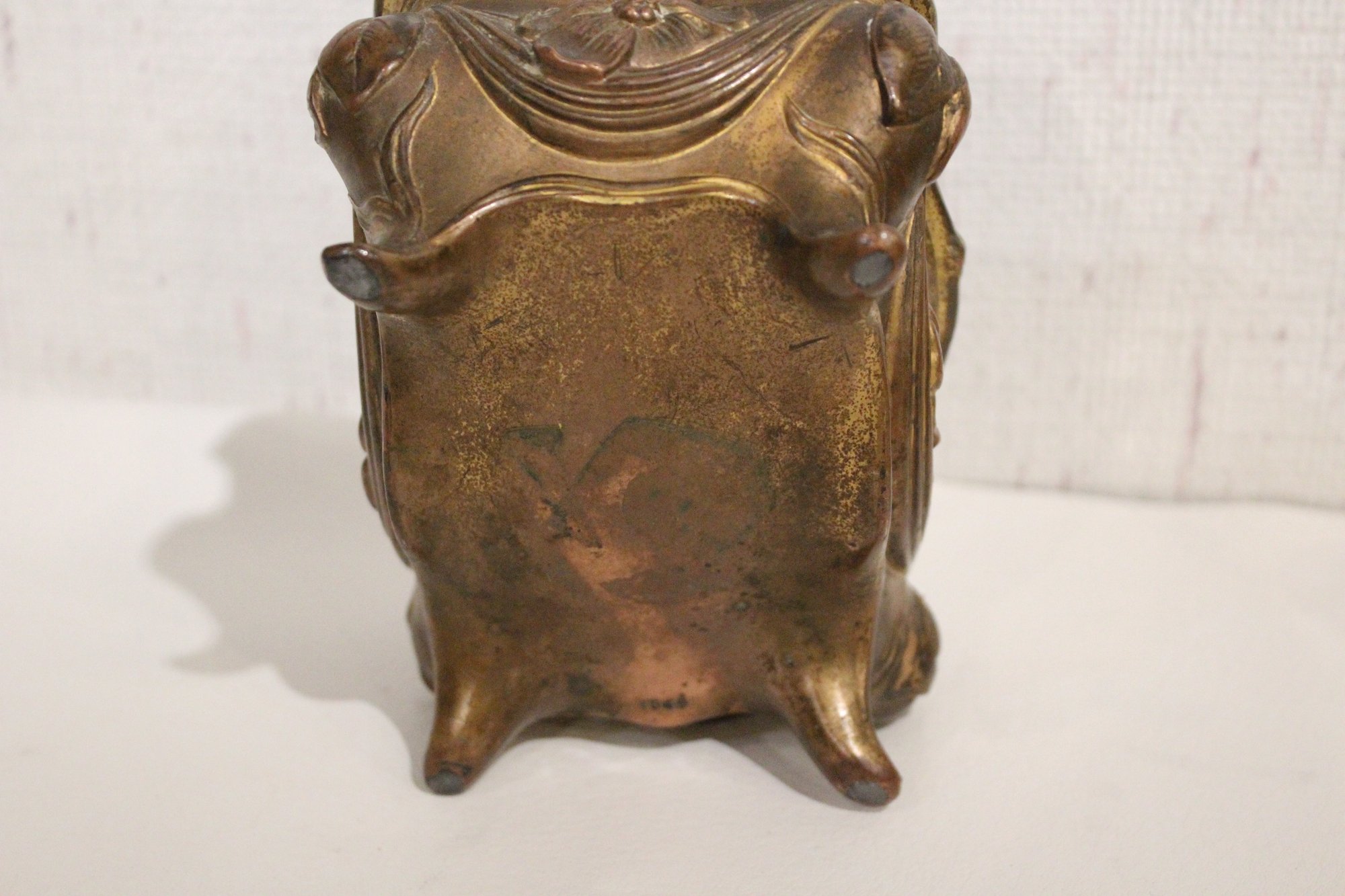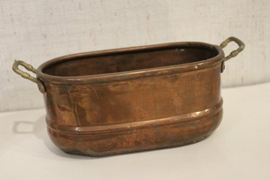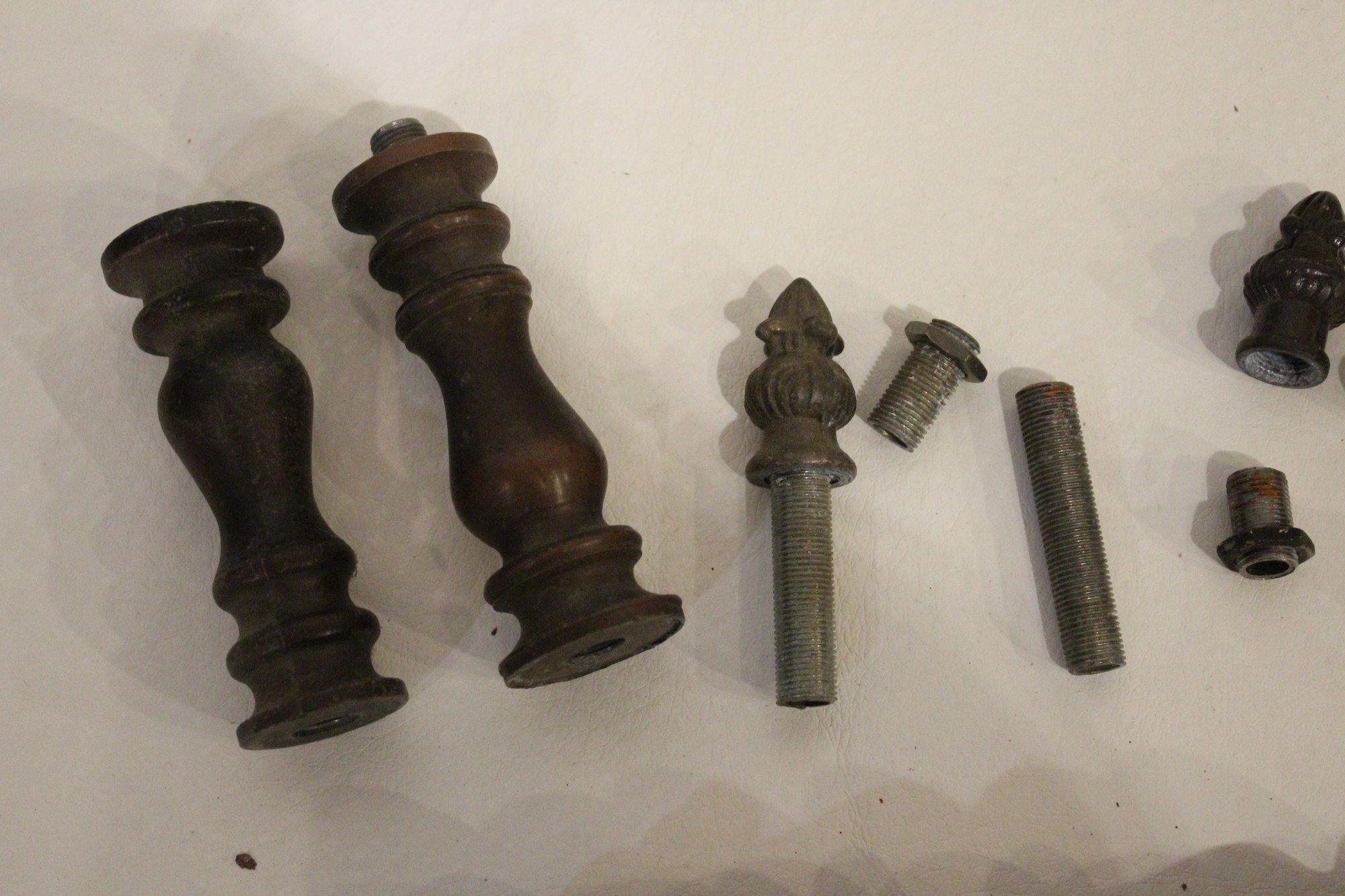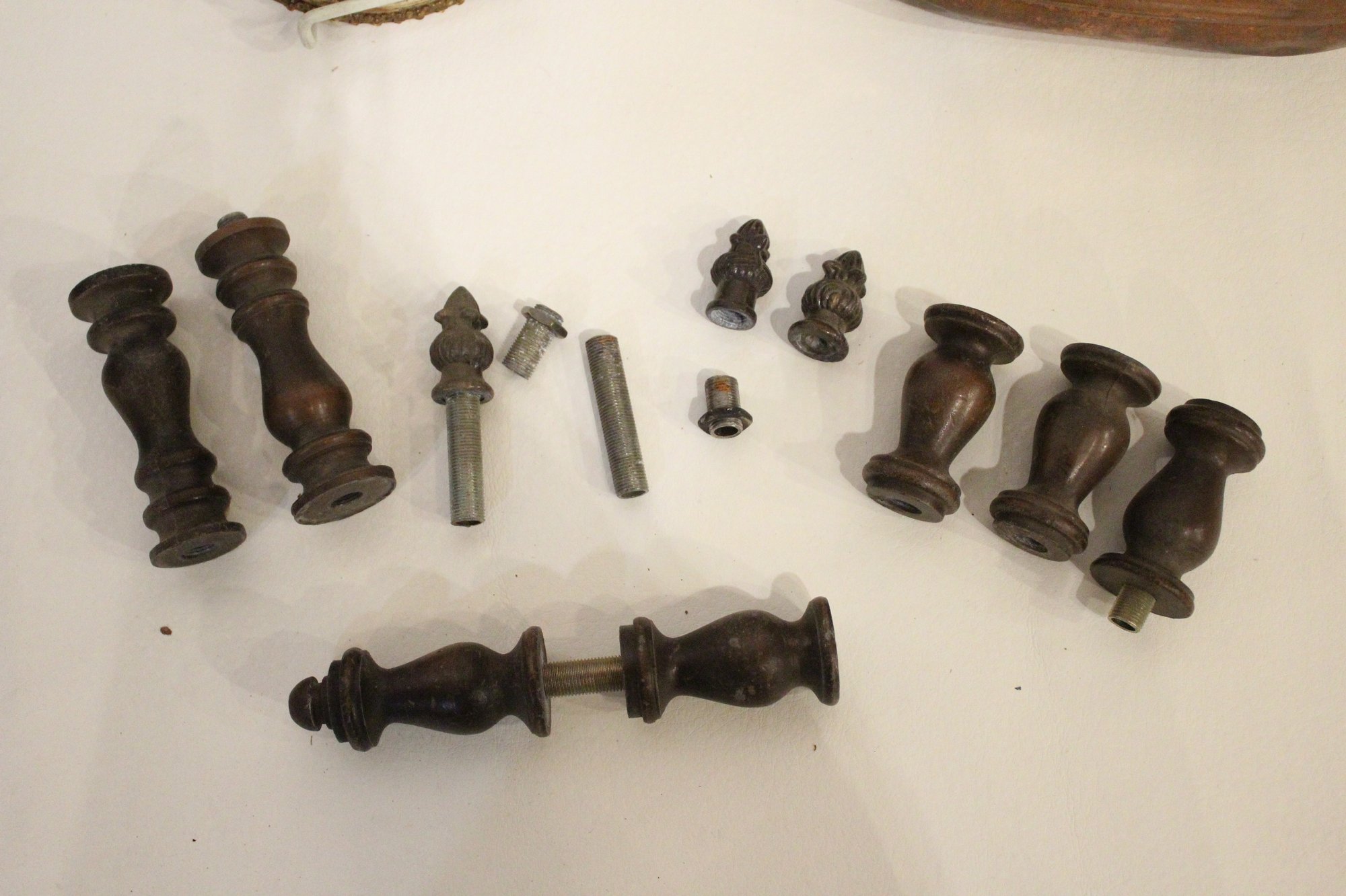 An antique Art Nouveau metal jewelry casket or trinket box 6" x 4" x 4", a round vintage frame 4.5", and an antique oval copper planter with brass handles 9" x 4.5" x 4". Lastly some antique metal finials. These items can be shipped