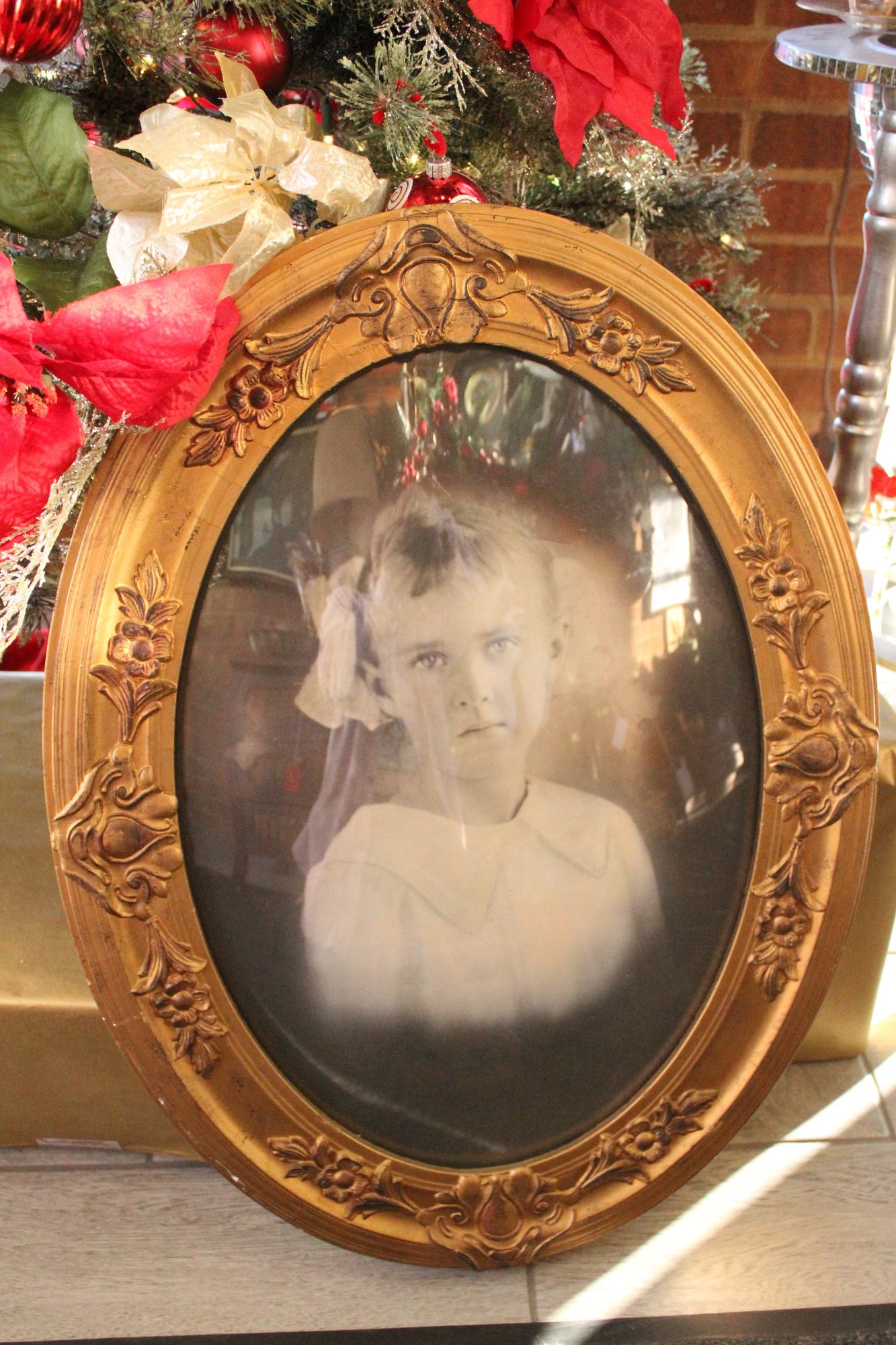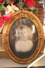Antique 1910s gold toned round wood frame with convex/bubble glass containing a girls portrait, 25" x 18.25". This item can be shipped.