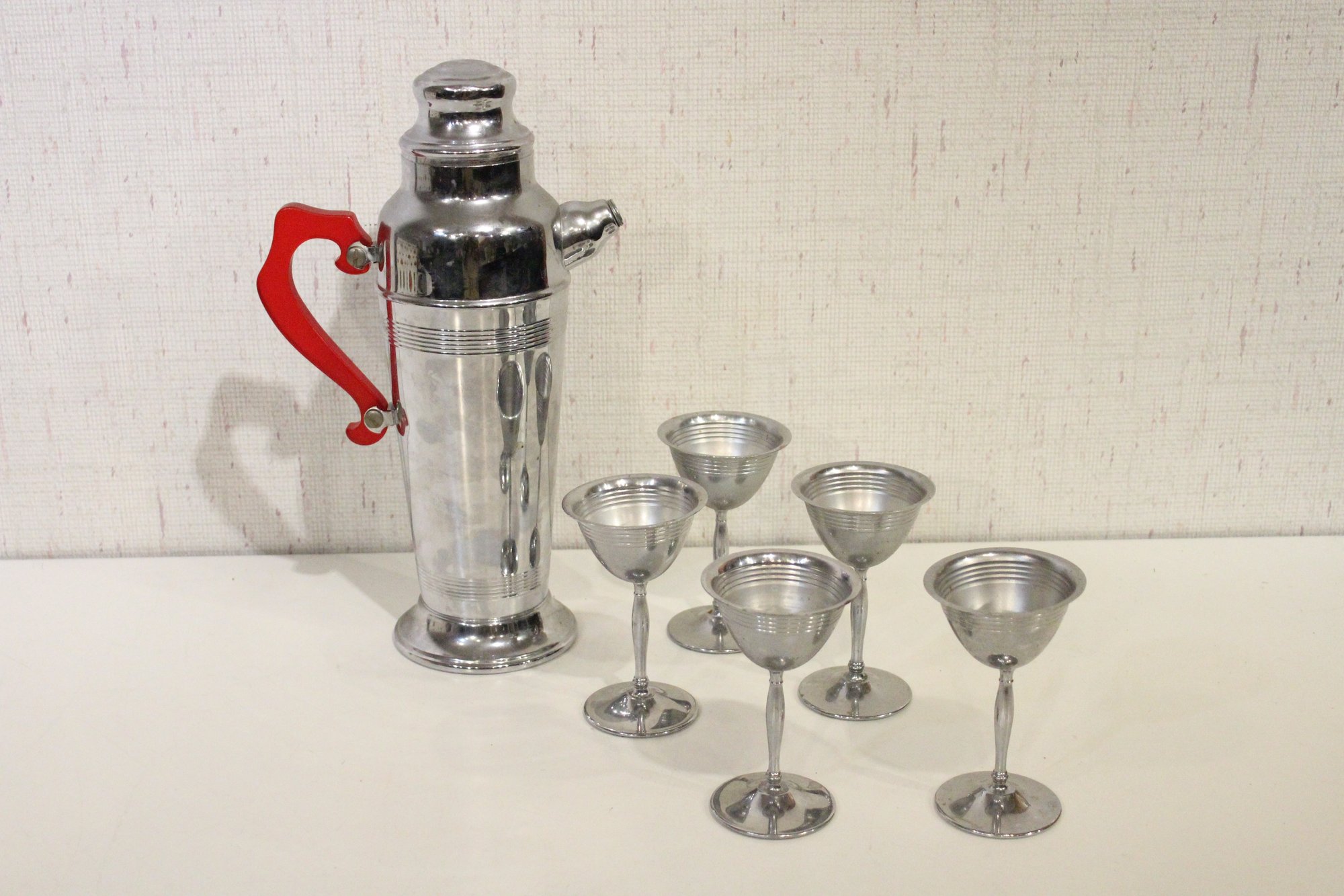 Vintage Art Deco Chrome Red Bakelite Handle Cocktail Shaker Mixer, 13", with 5 stainless steel cups, 5". These items can be shipped.