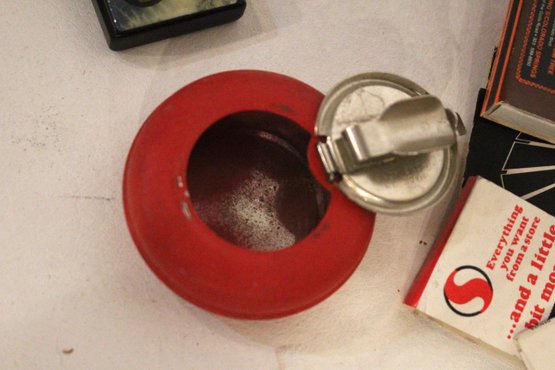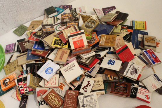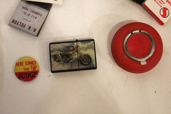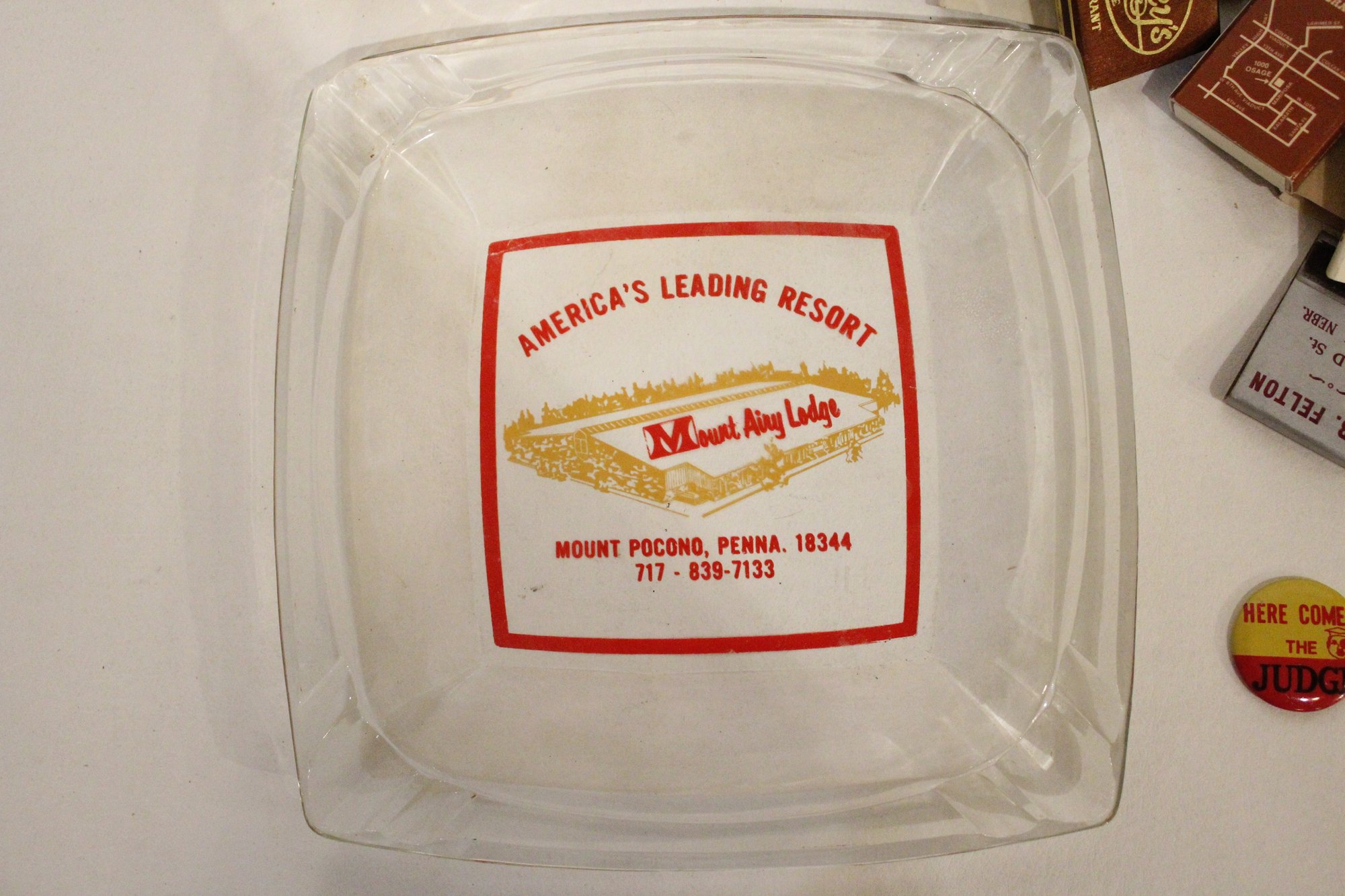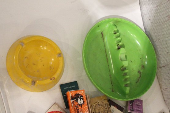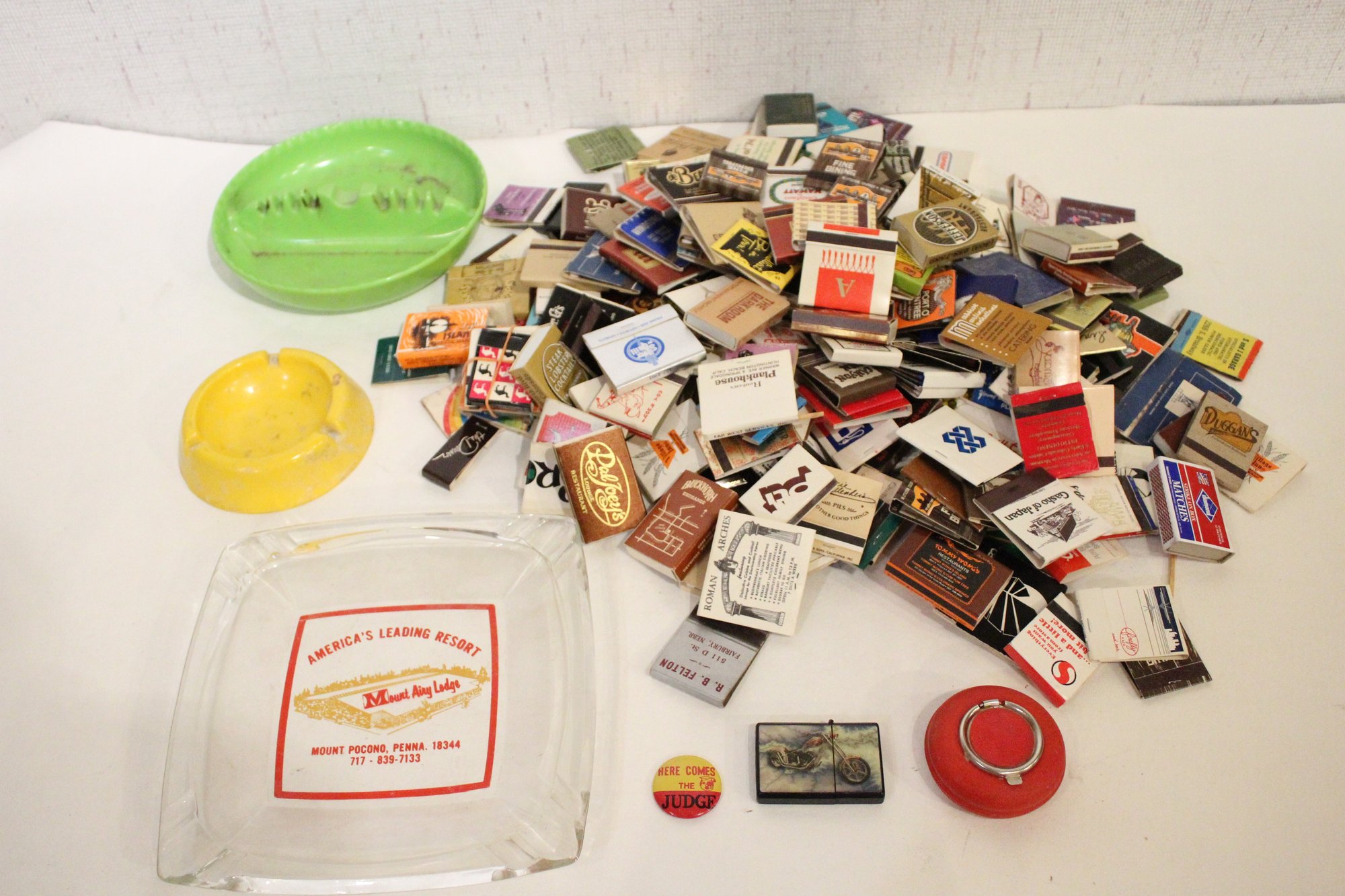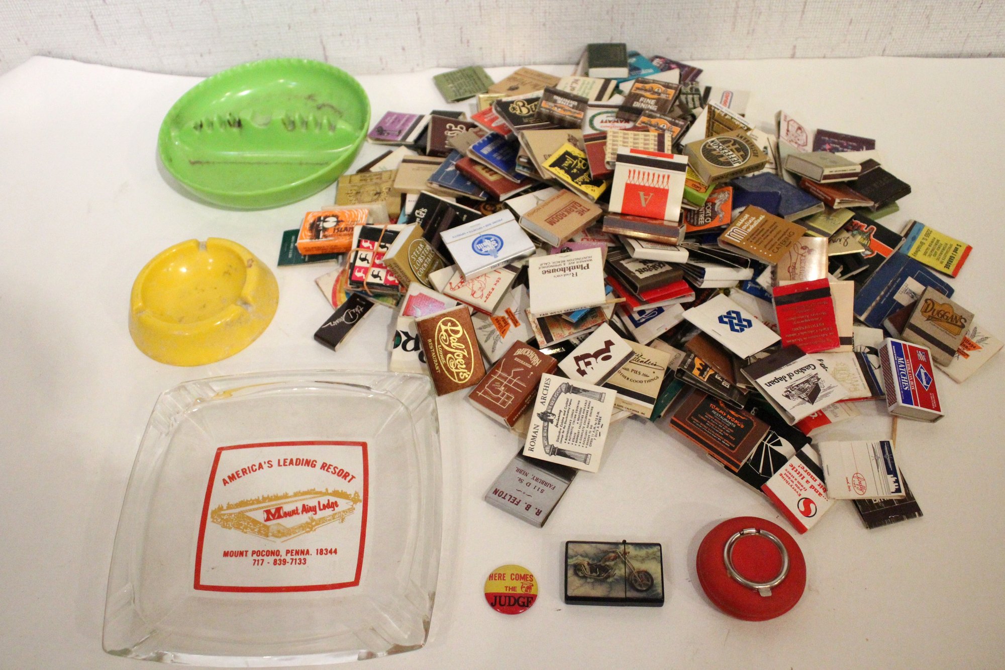 2 plastic ash trays 7" and 5", a pin, a motorcycle lighter, an art deco portable ash tray 3", a vintage glass advertising ashtray from the Mount Airy Lodge resort in Mount Pocono, Pennsylvania 8" x 8", and a large pile of vintage matches. These items can be shipped.