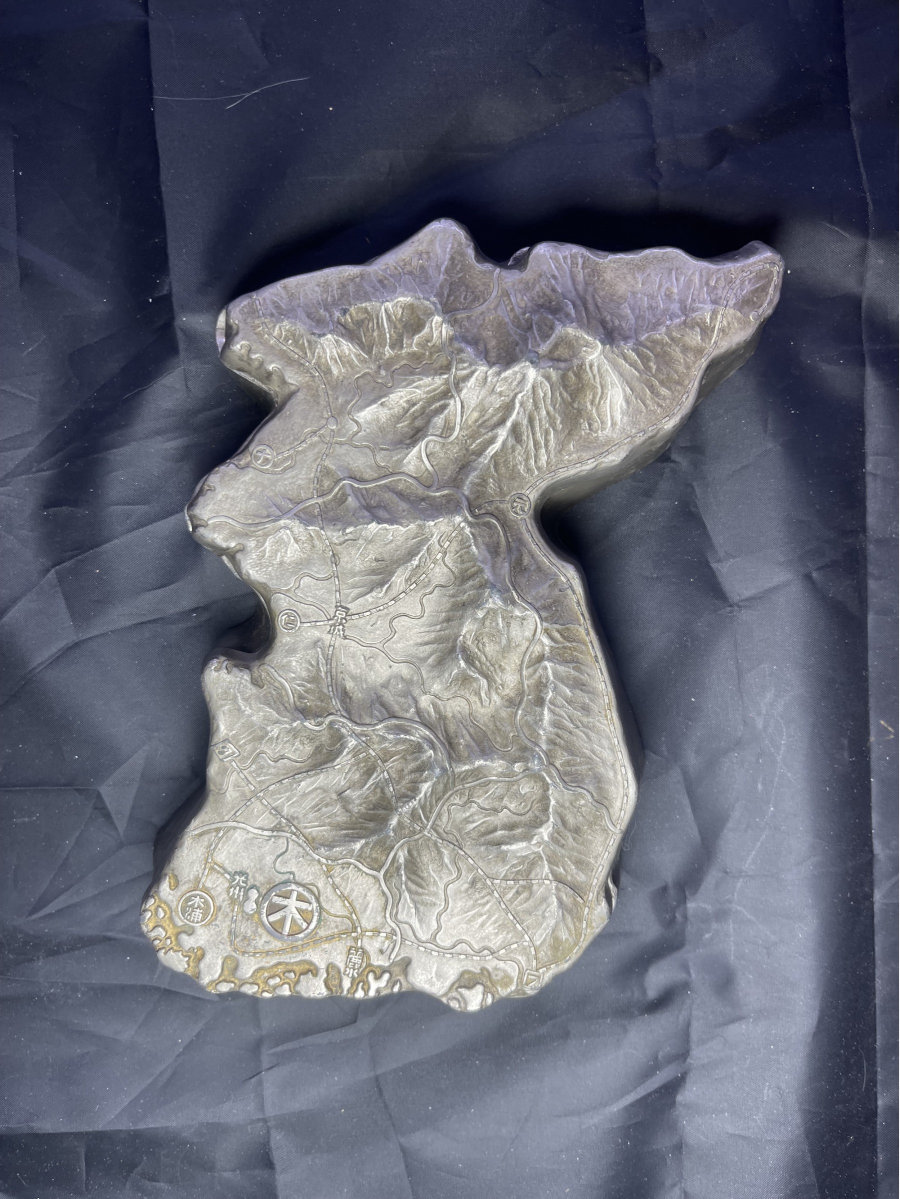 Name that island! Because we can't. This ashtray with matching lid was probably a souvenir produced for tourists from Asia. It is fairly heavy and 8 inches by 5 inches. There is a round circle that has what appears to be Korean writing on the top surface, and another language is also represented.