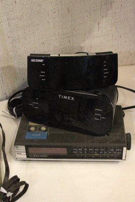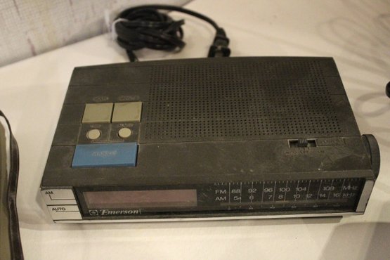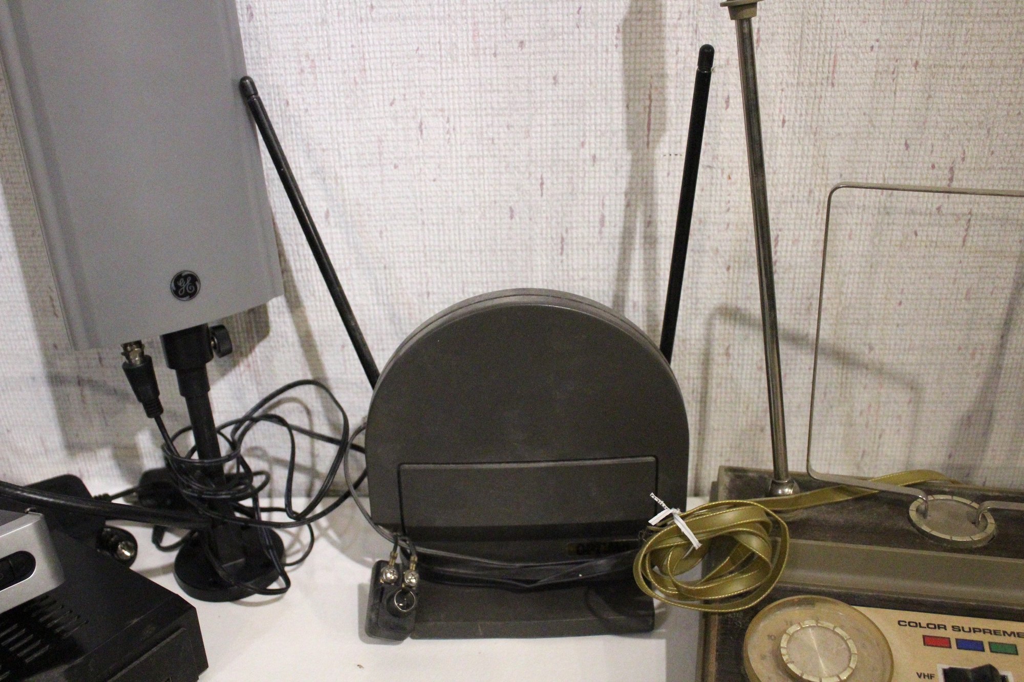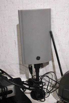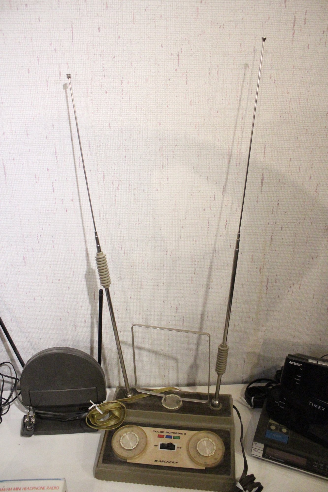 A RCA Digital to Analog Converter Box, a Digital TV Converter Box, GE Futura amplified indoor/outdoor HDTV antenna, an indoor television antenna, a vintage Archer Color Supreme II TV and FM stereo antenna, vintage Emerson AM/FM clock radio, a Timex AM/FM Dual Alarm Clock Radio, a Nelsonic Digital AM/FM Clock Radio with a built-in aux cord. These items can be shipped.