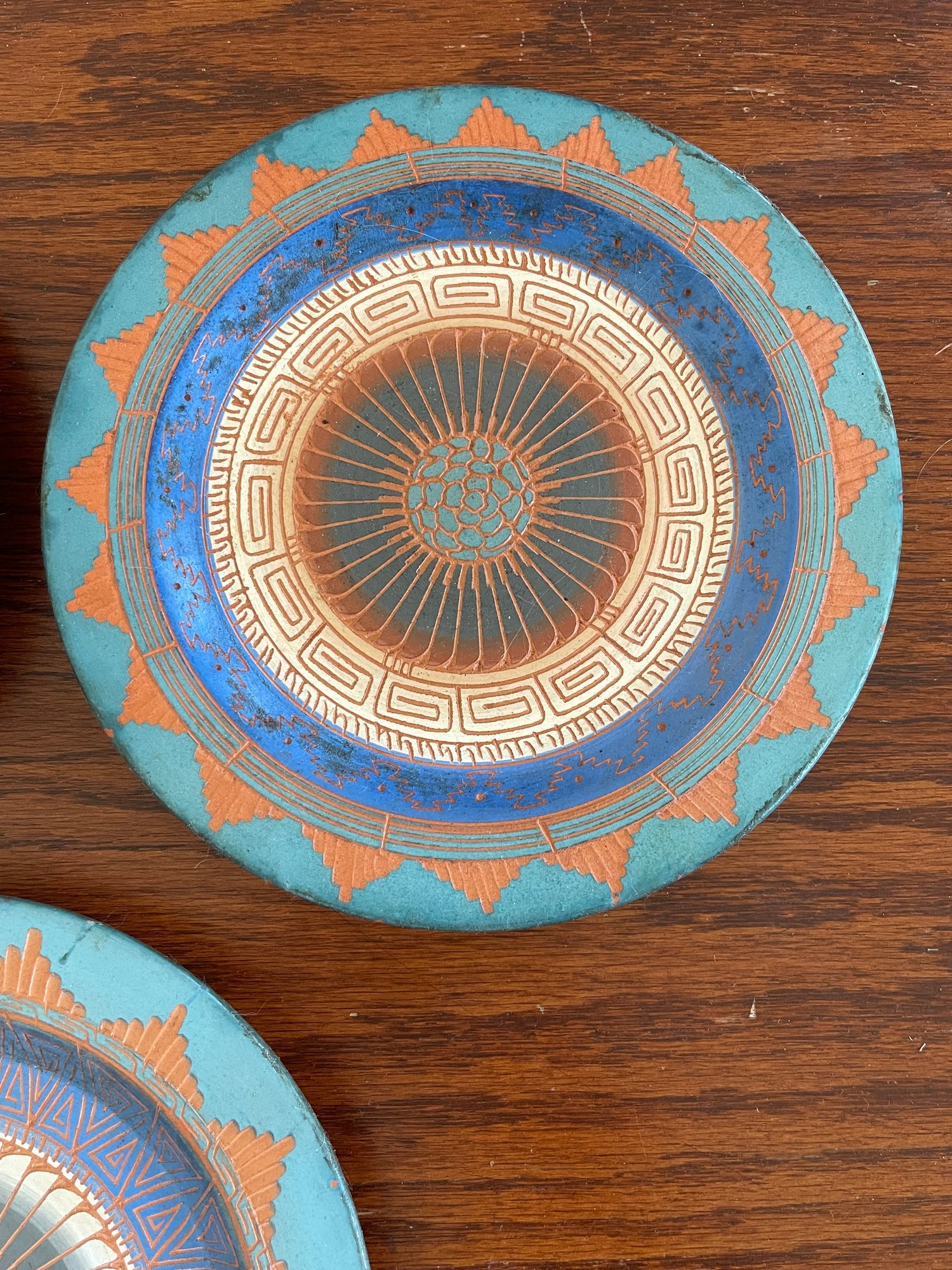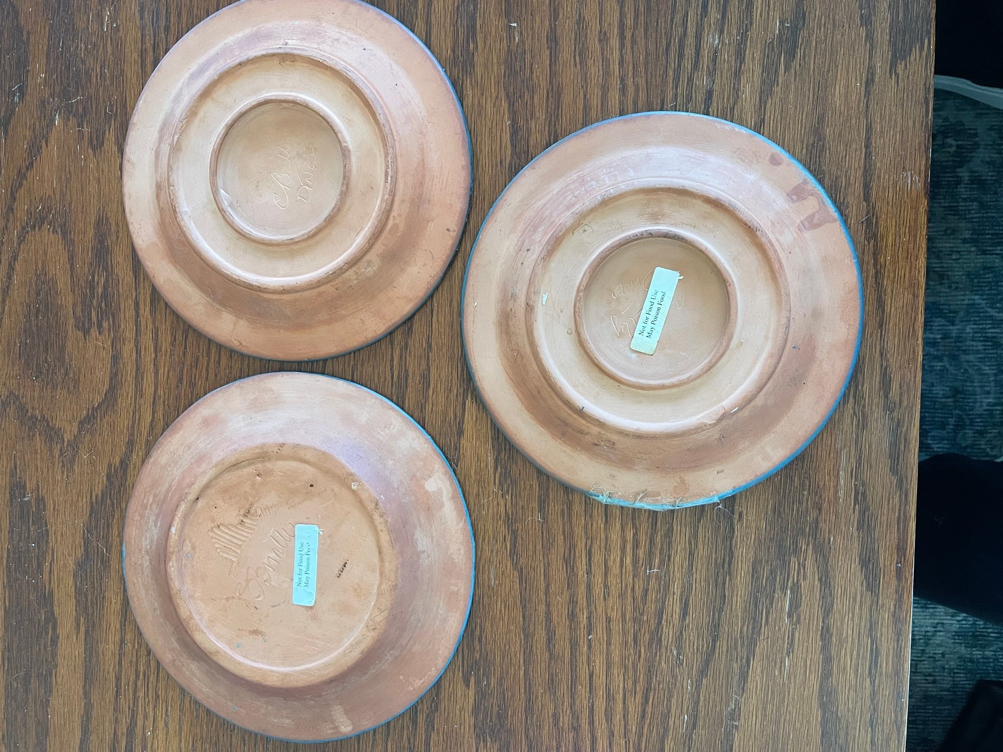 This set was sold by Coldwater Creek and the plates are for decoration only. 1 plate has been repaired-see photo